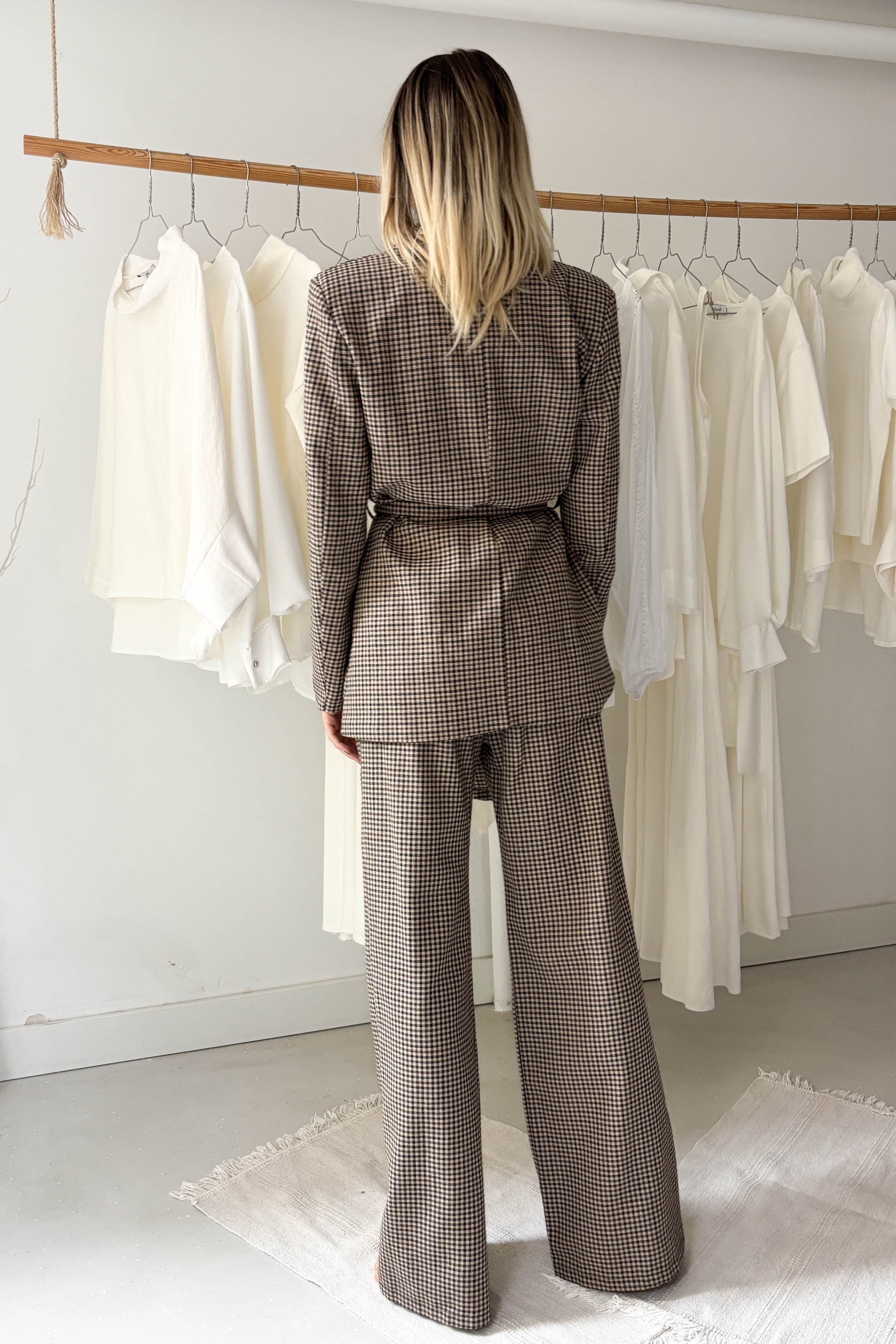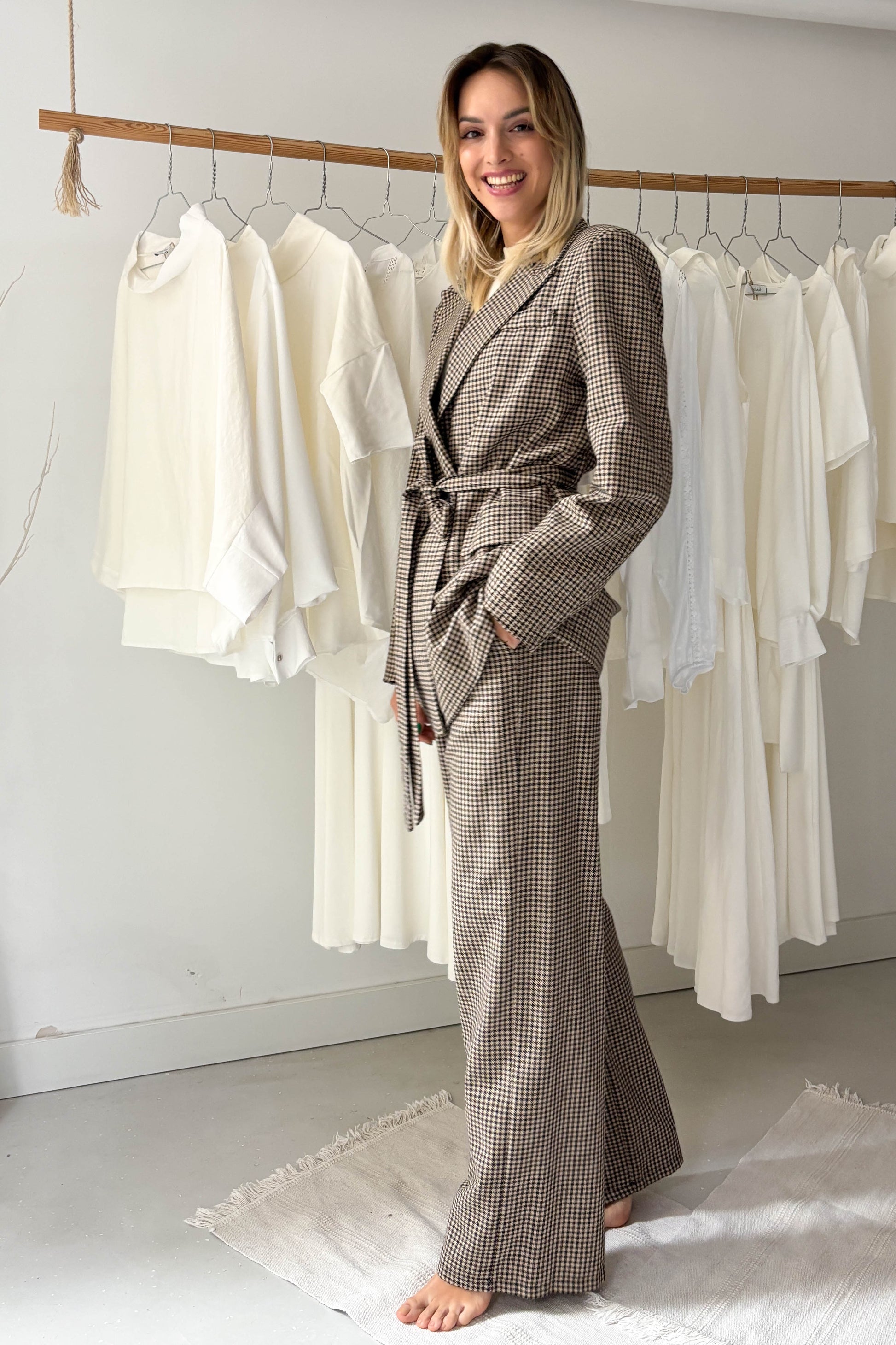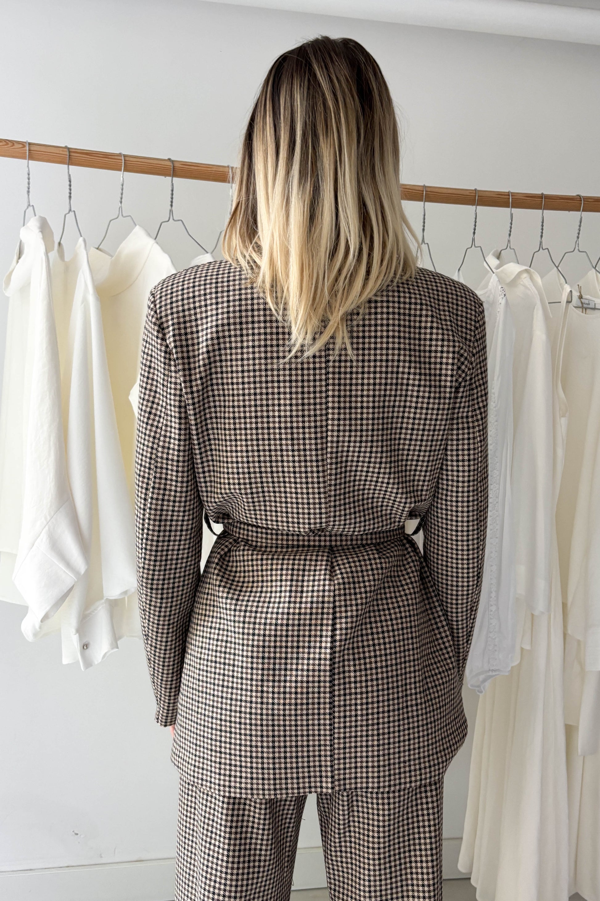 Hosszított szabású, bélelt, két gombos blézer. Válltöméses fazon. Derekrészen hamiszsebekkel és egy megkötővel van ellátva, amely által többféleképpen is hordható.