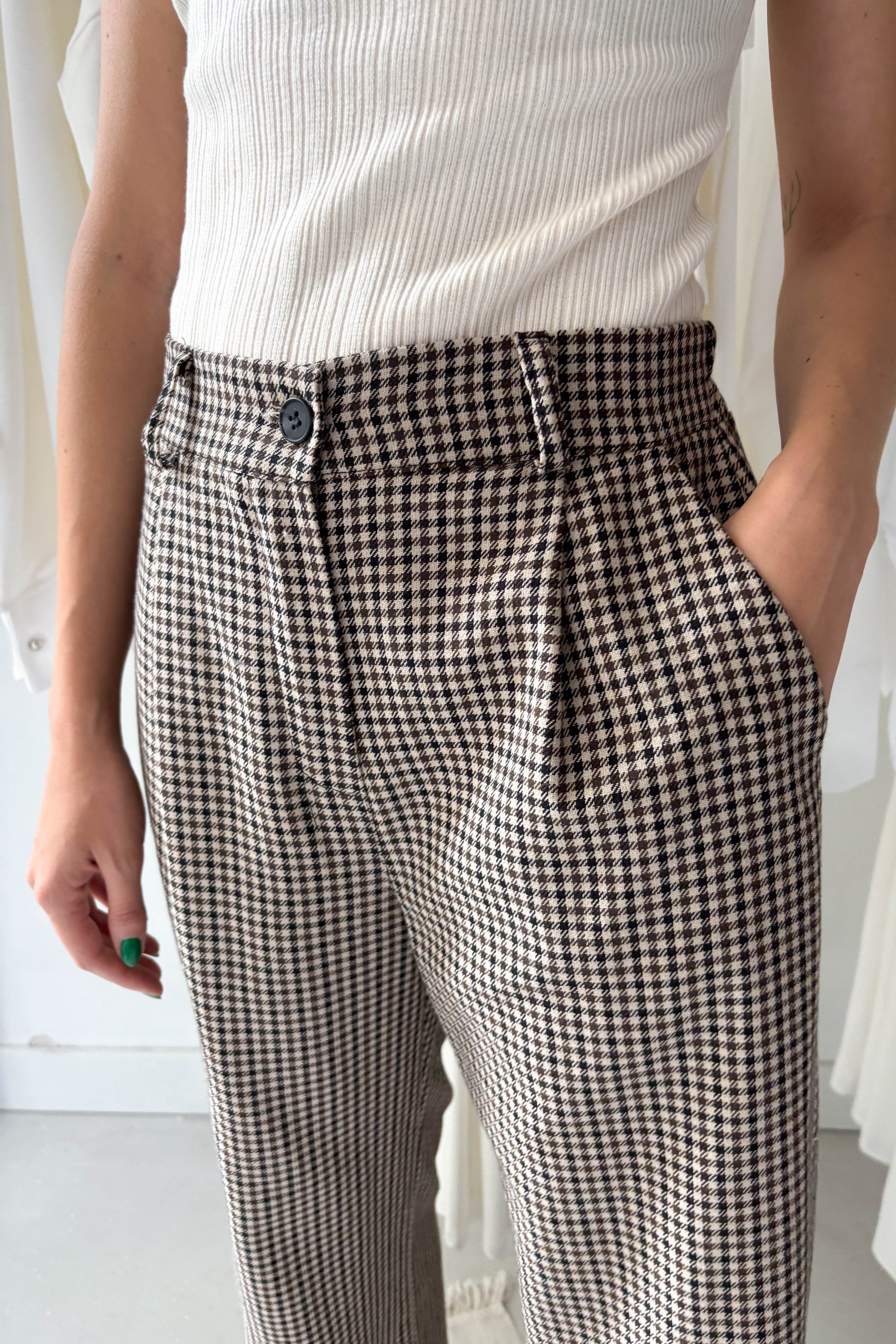 Elől hajtásos, hátul gumírozott derekú, zsebes nadrág. Elől középen cipzárral és egy gombbal záródik.