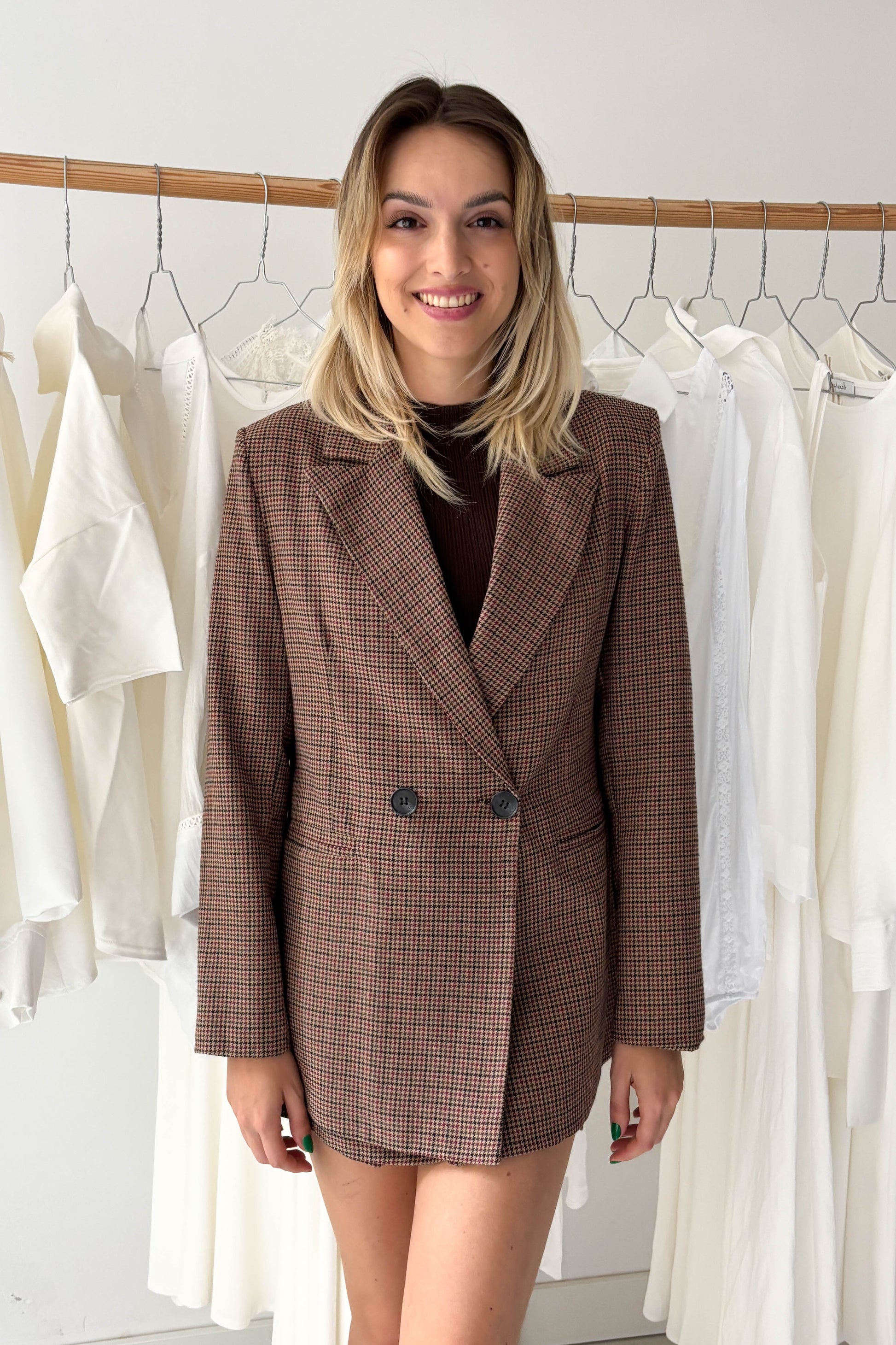Szűkített szabású, két gombos, hosszított, kockás blézer. Elől egy gombbal és gy rejtett gombbal záródik. Elülső részénkét hamis zsebbel van ellátva. Bélelt,válltöméses fazon.