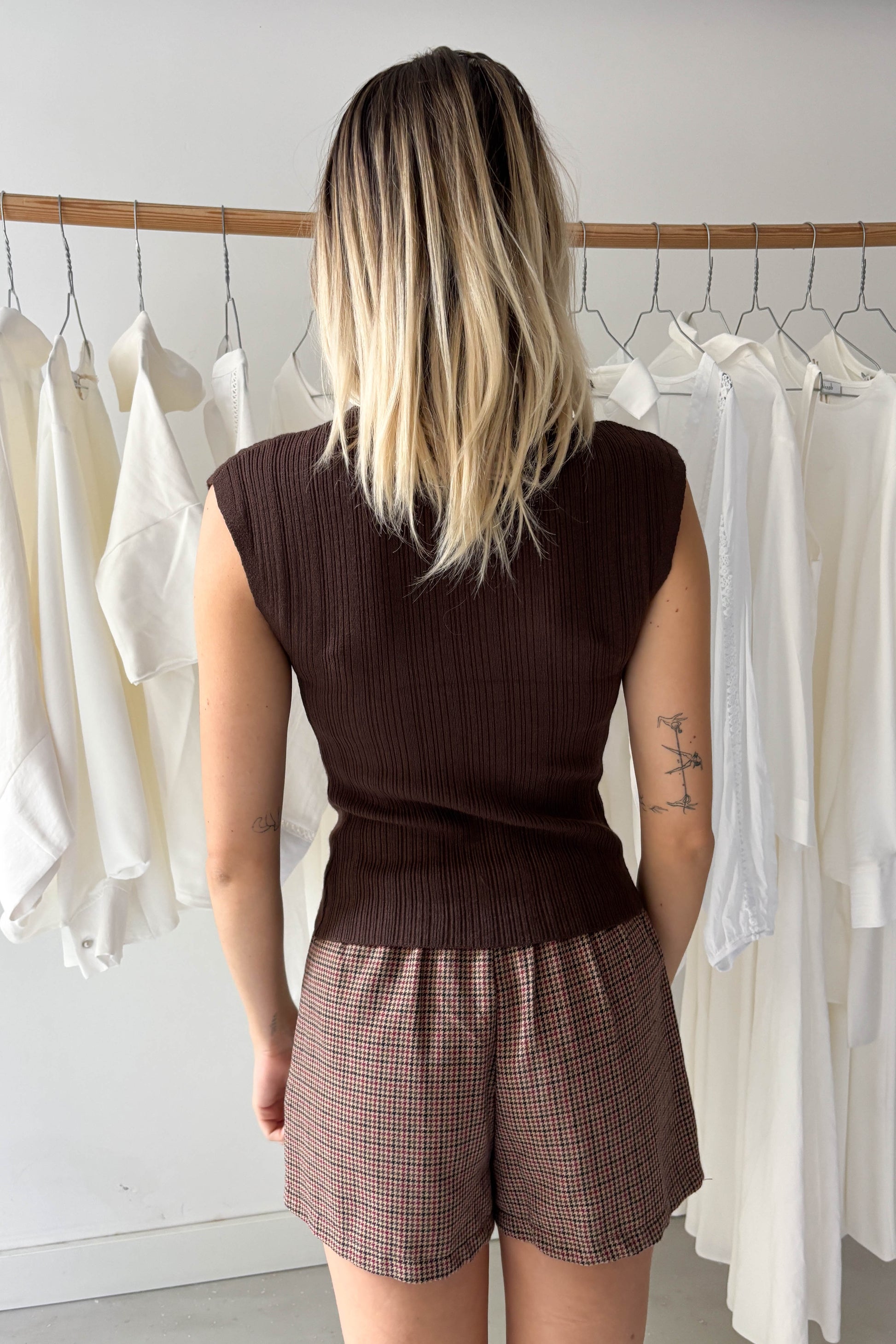 Elől szoknya, hátul nadrág szabású kockás rövidnadrág.