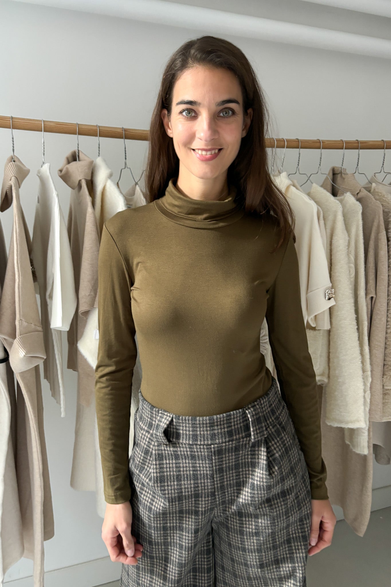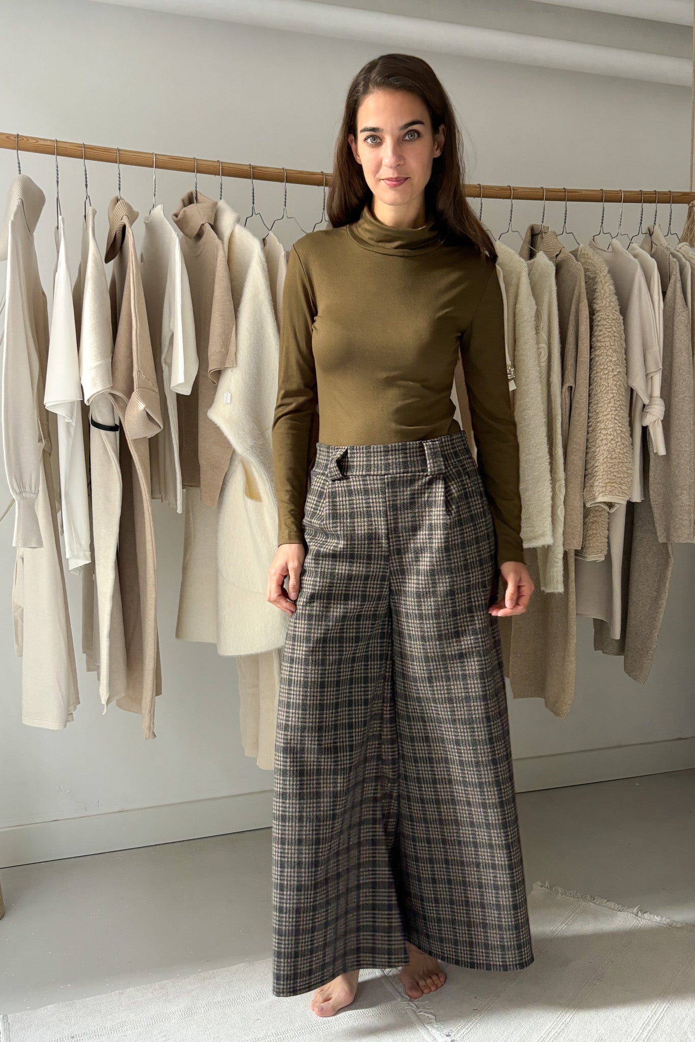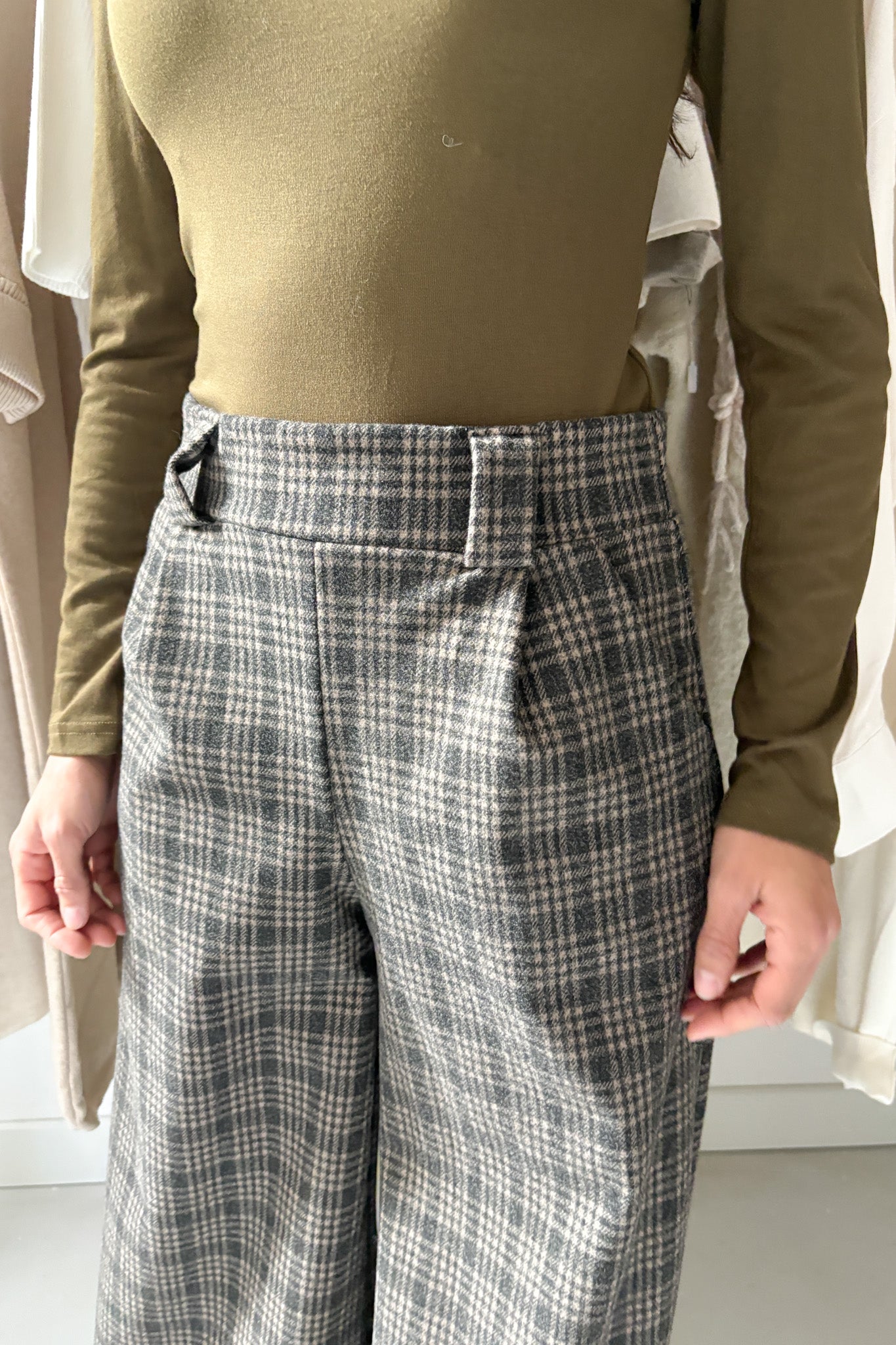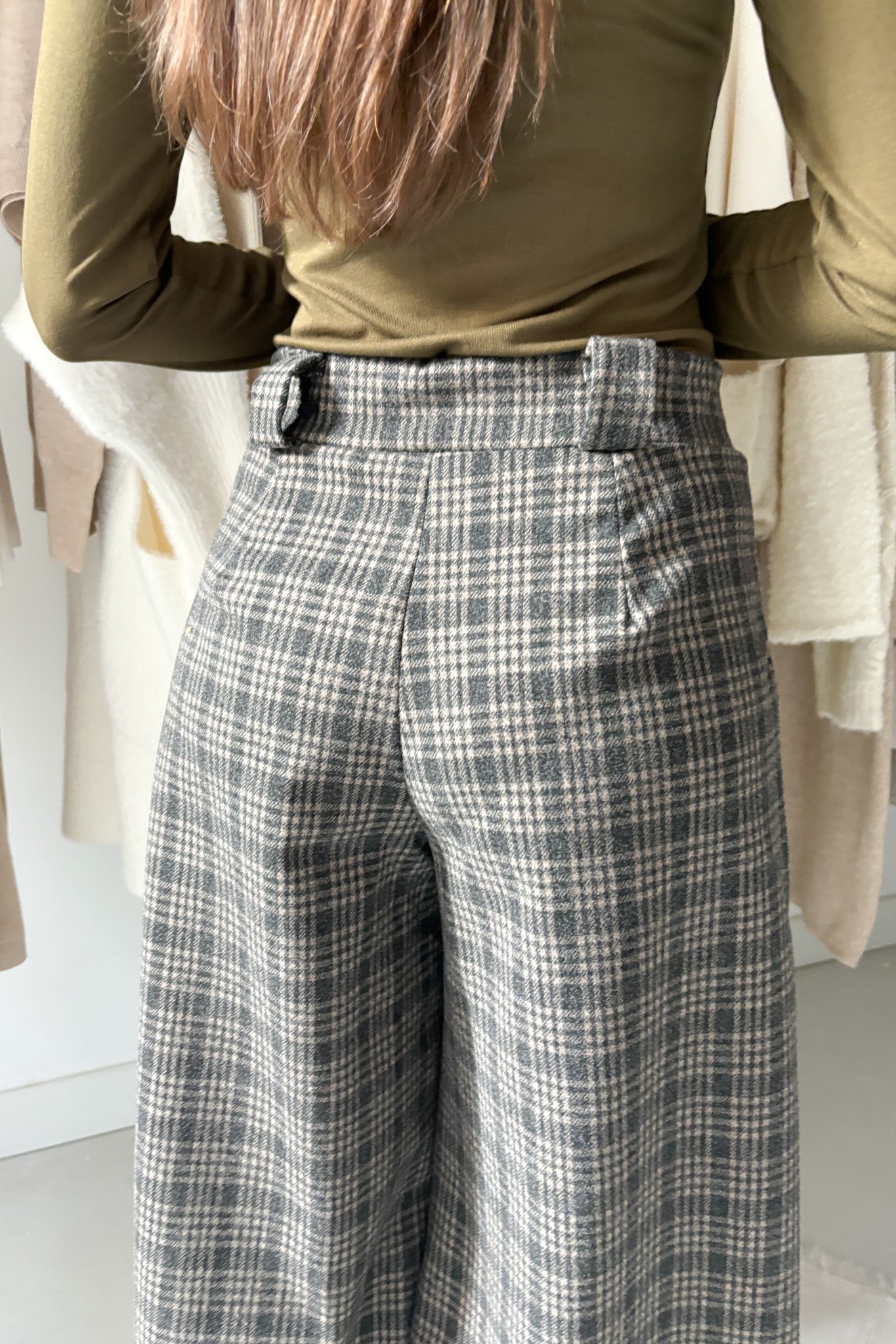 Vastagabb anyagból készült, meleg, kockás nadrág. Övbujtatóval ellátott, zsebes, bőszárú fazon.