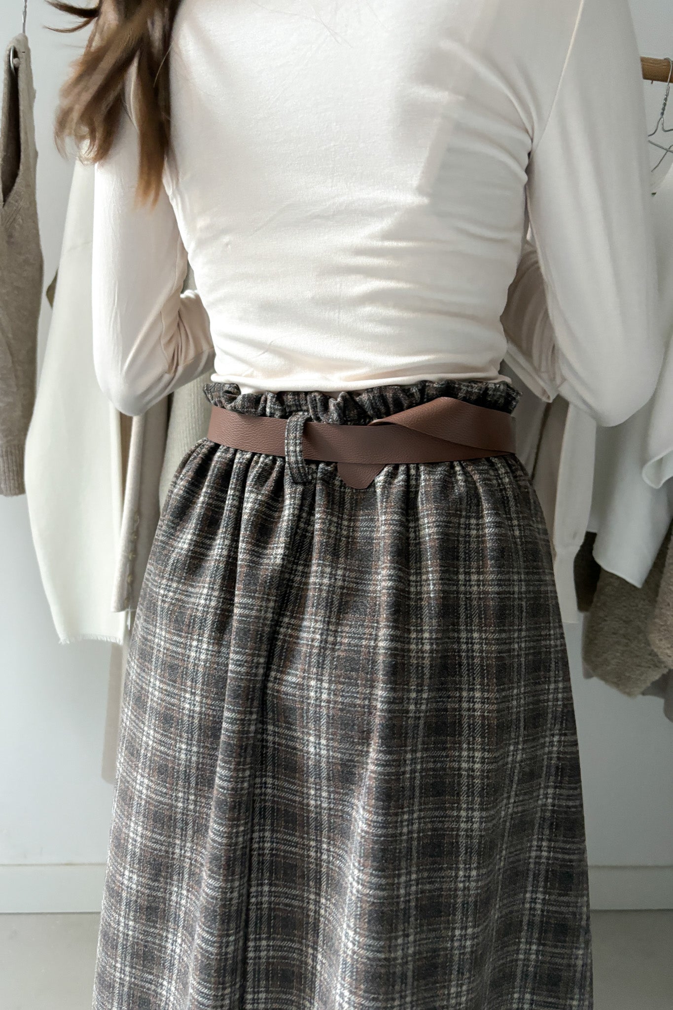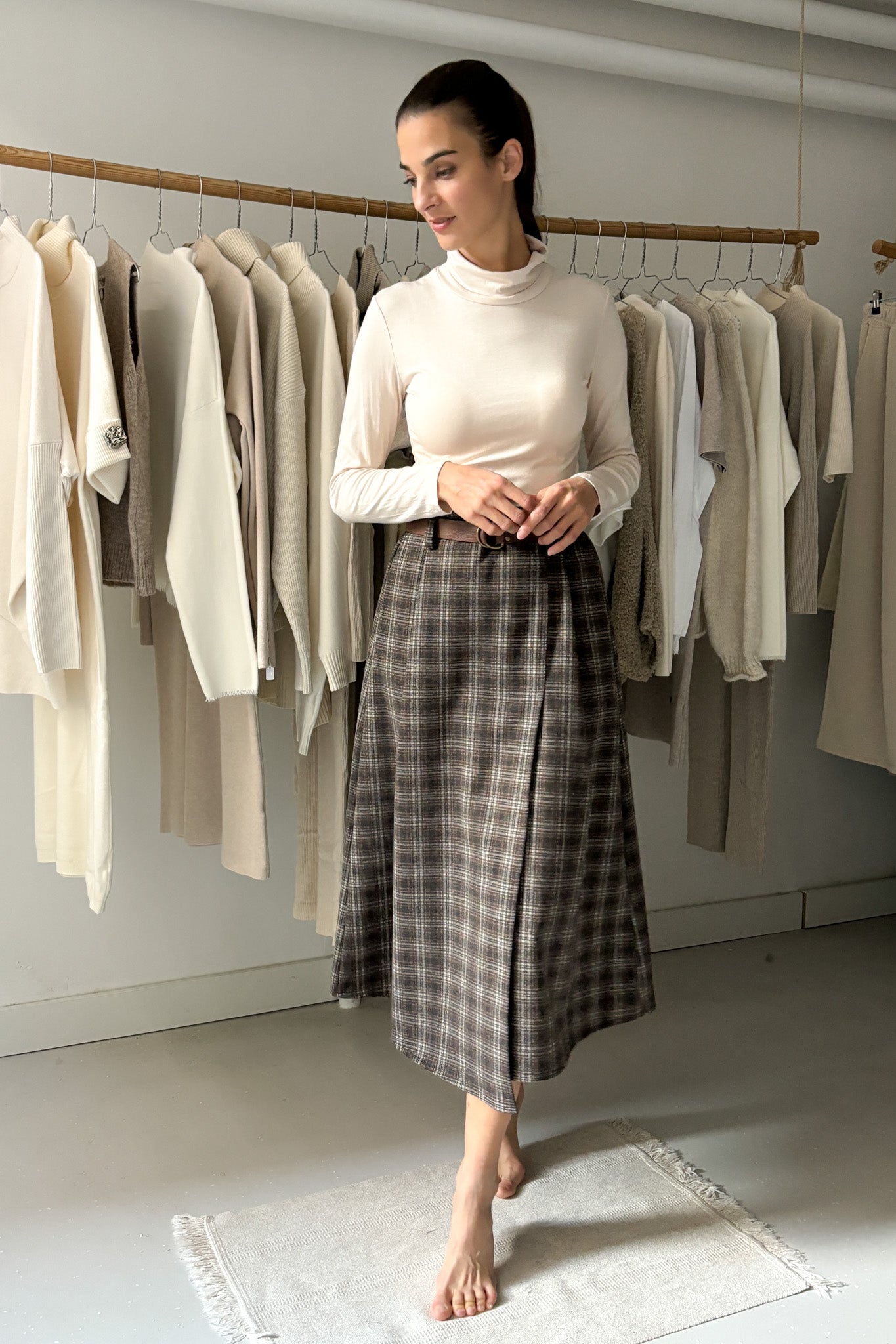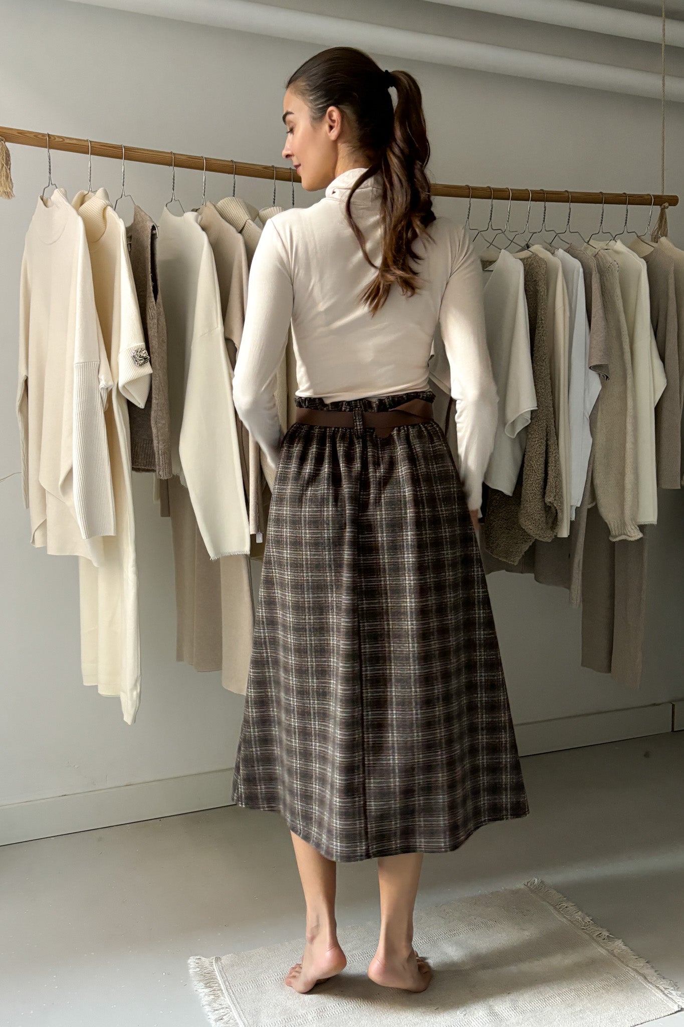 Meleg, puha anyagú, kockás szoknya. Derékon gumírozott, övvel ellátott fazon. A-vonalú, elöl hajtásos, felsliccelt.