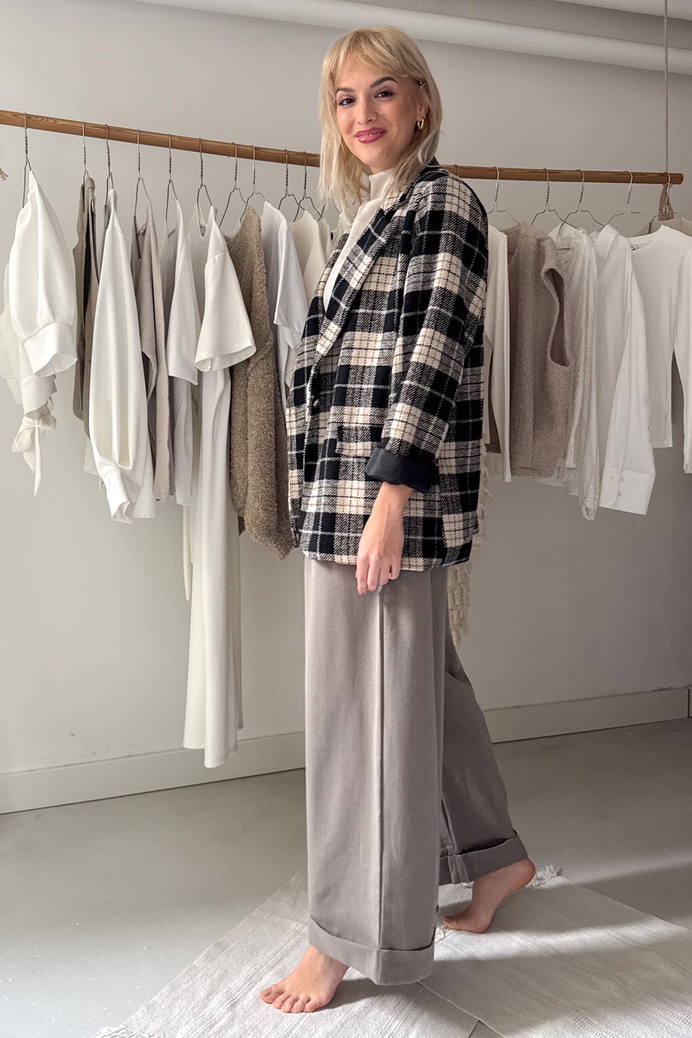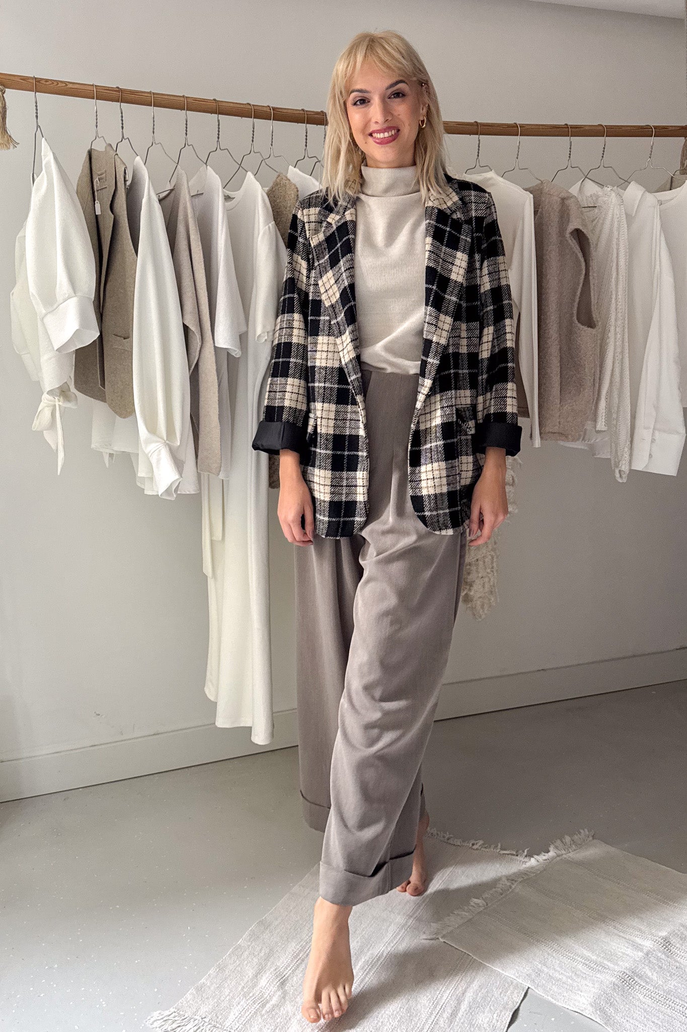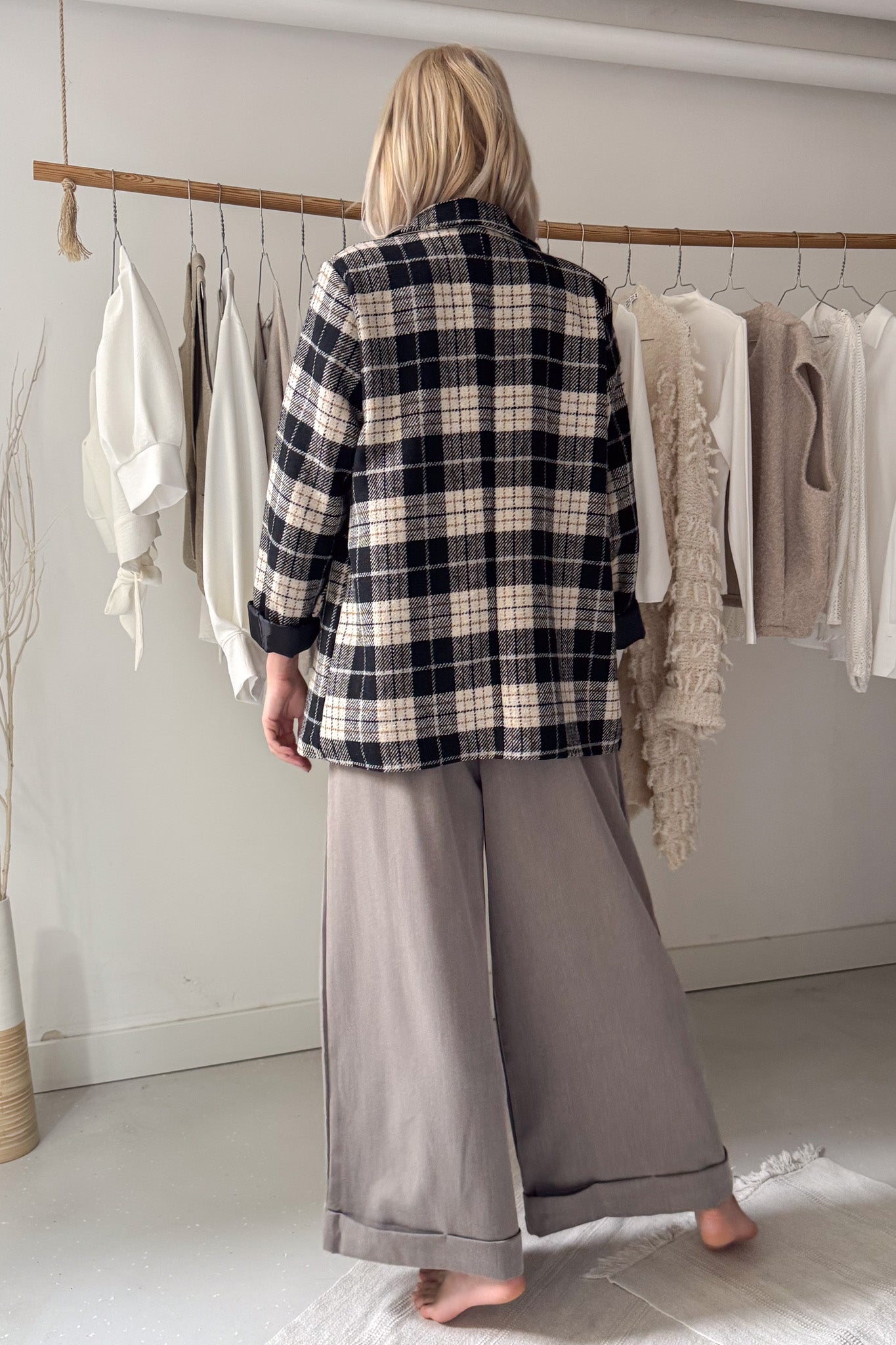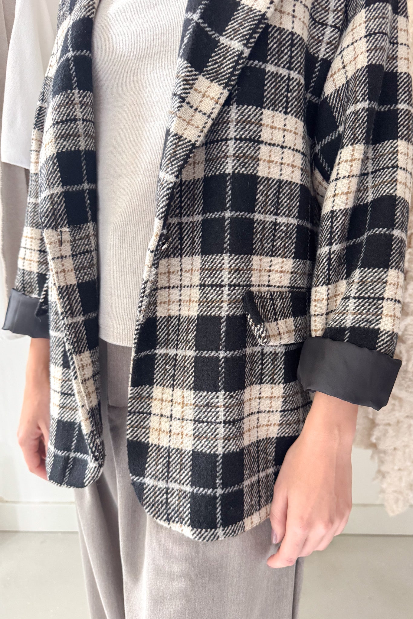 Hosszított, kockás zakó. Díszzsebekkel ellátott, középen összefogható fazon.