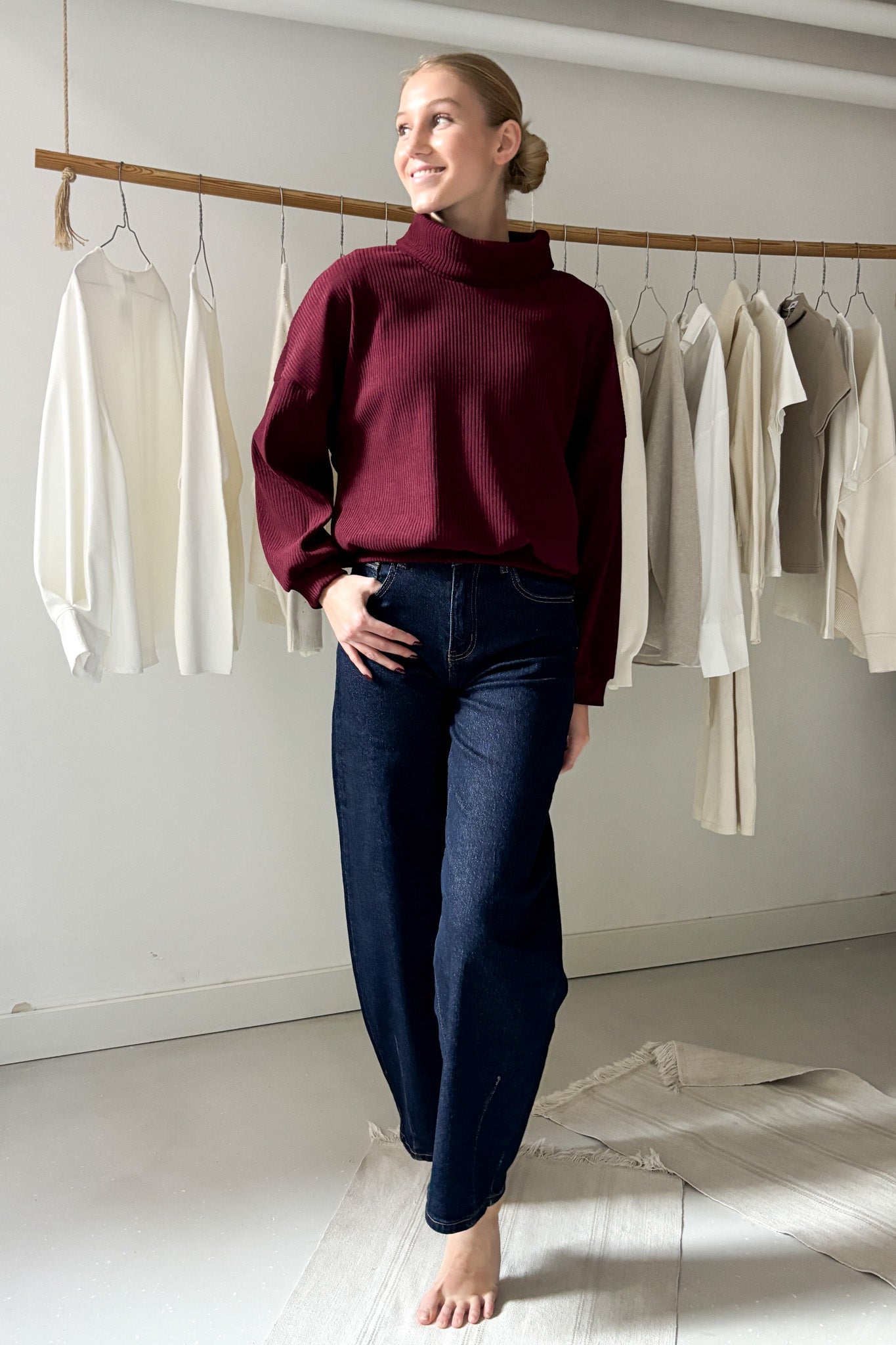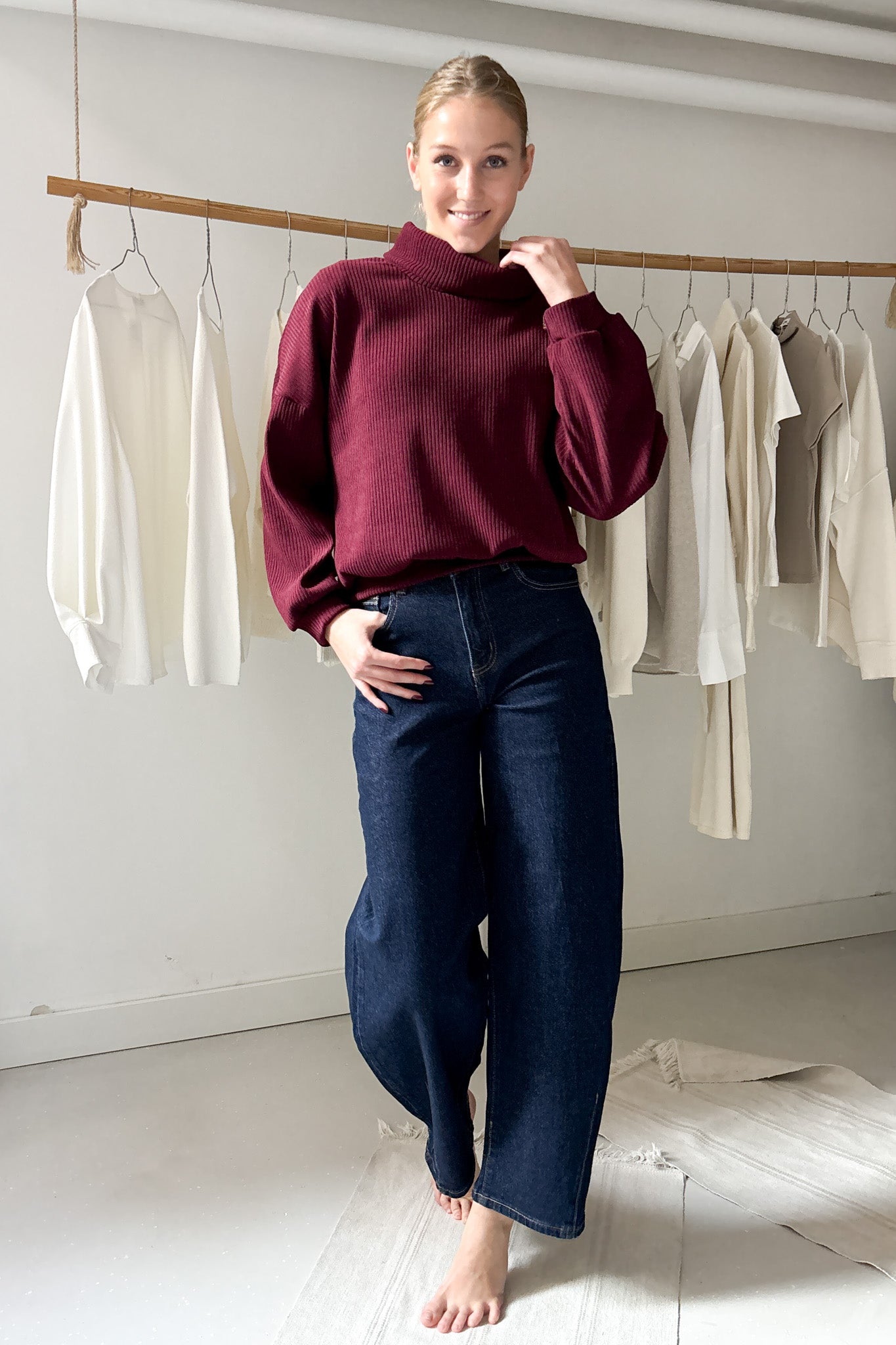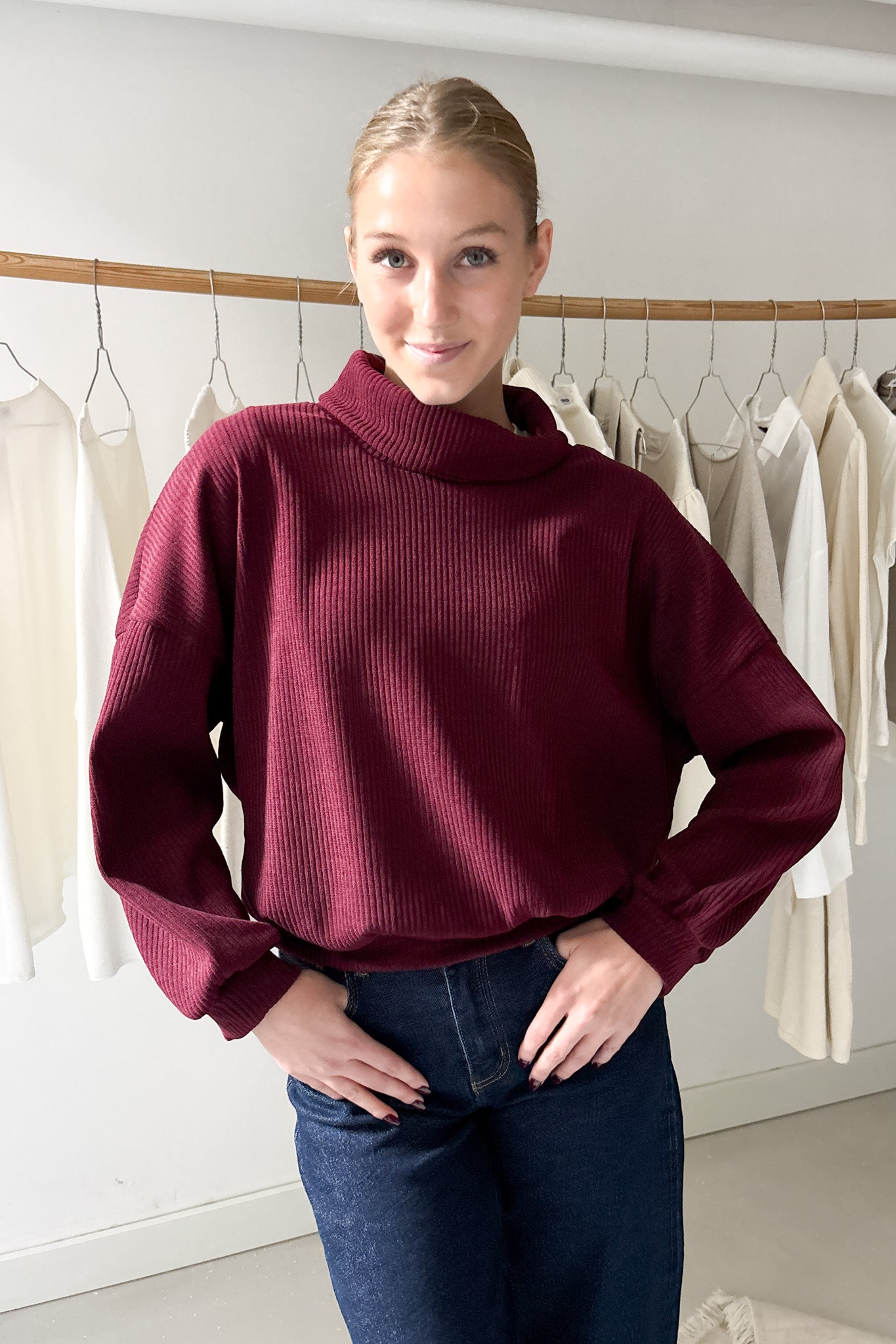 Kordbársony hatású pulóver vörösbor színben. Ujjai, valamint derékrésze passzos. Ejtett garbós nyakú fazon.