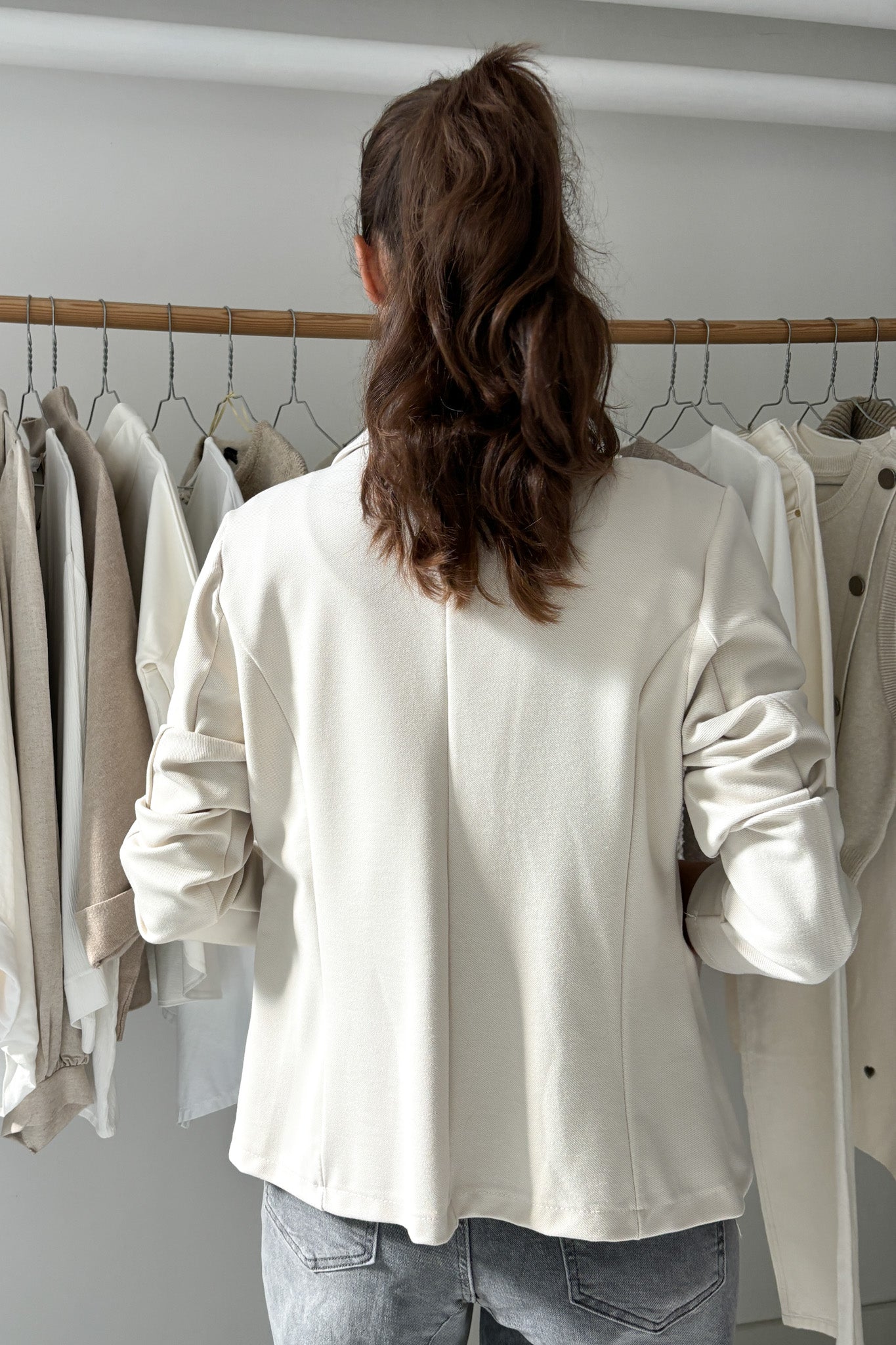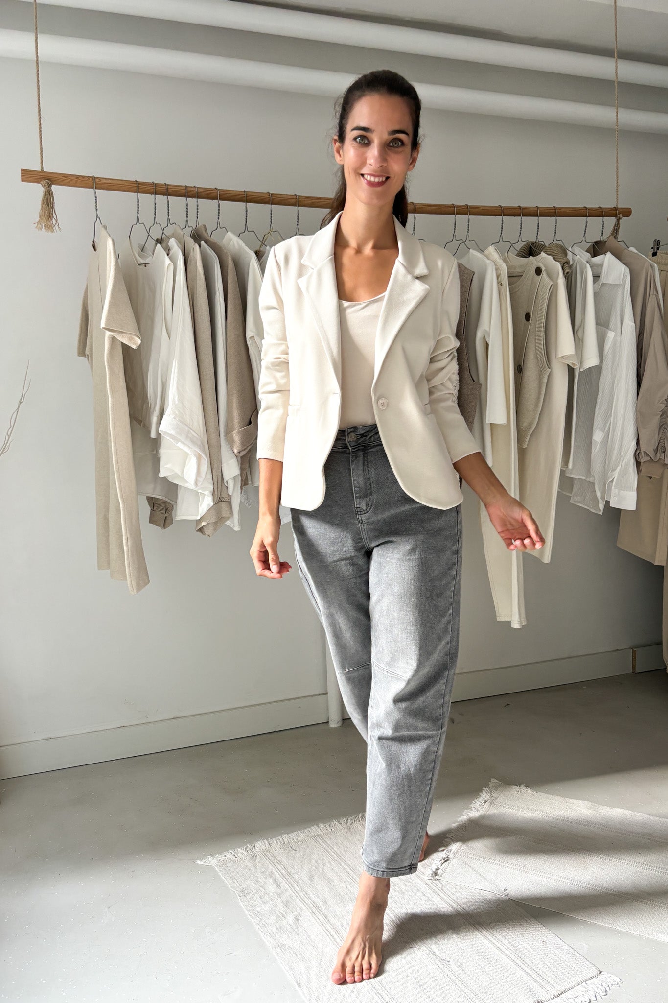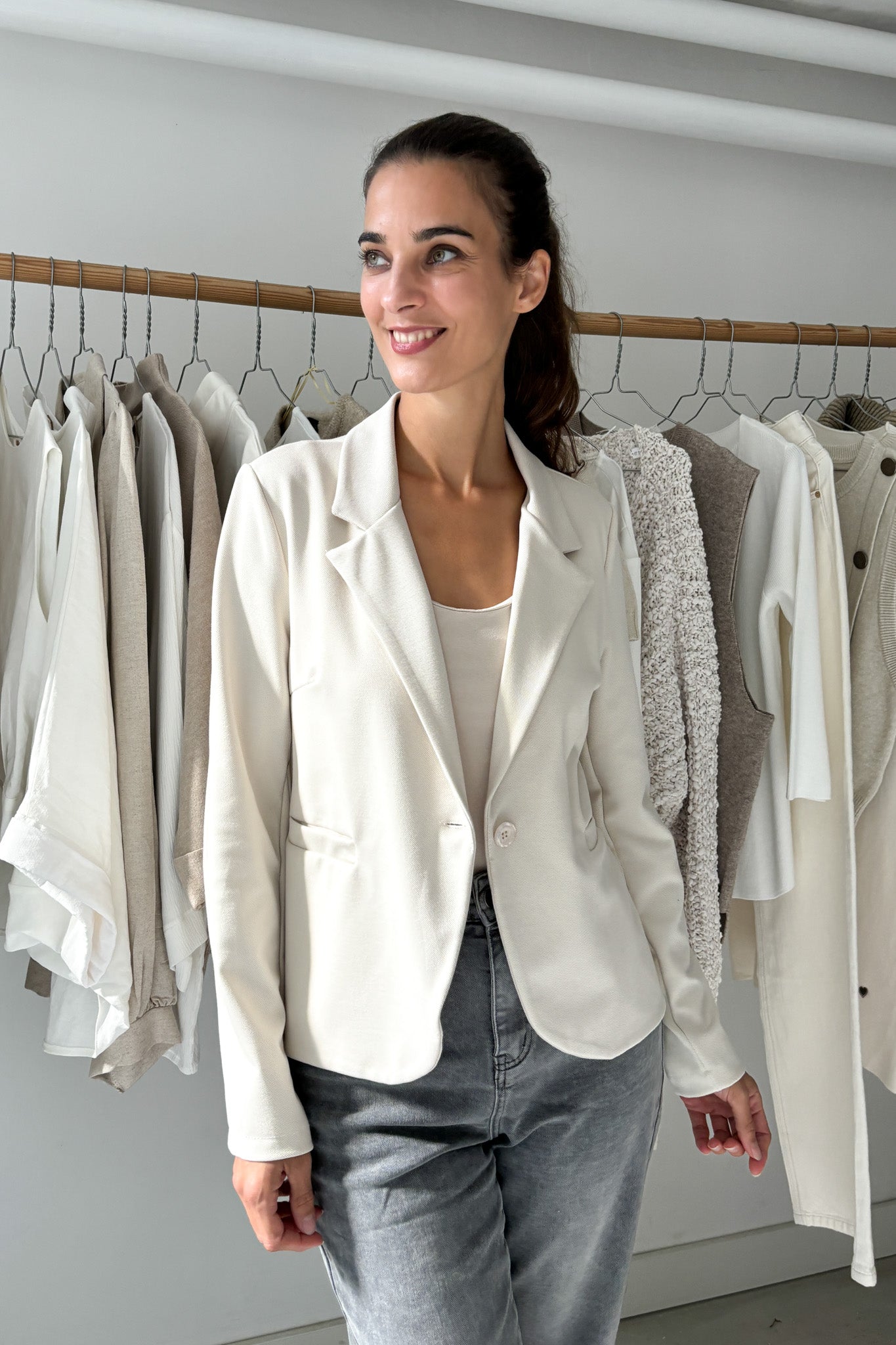 Krémszínű zakó, puha anyagból. Középen gombbal összefogható. Galléros, díszzsebekkel ellátott.