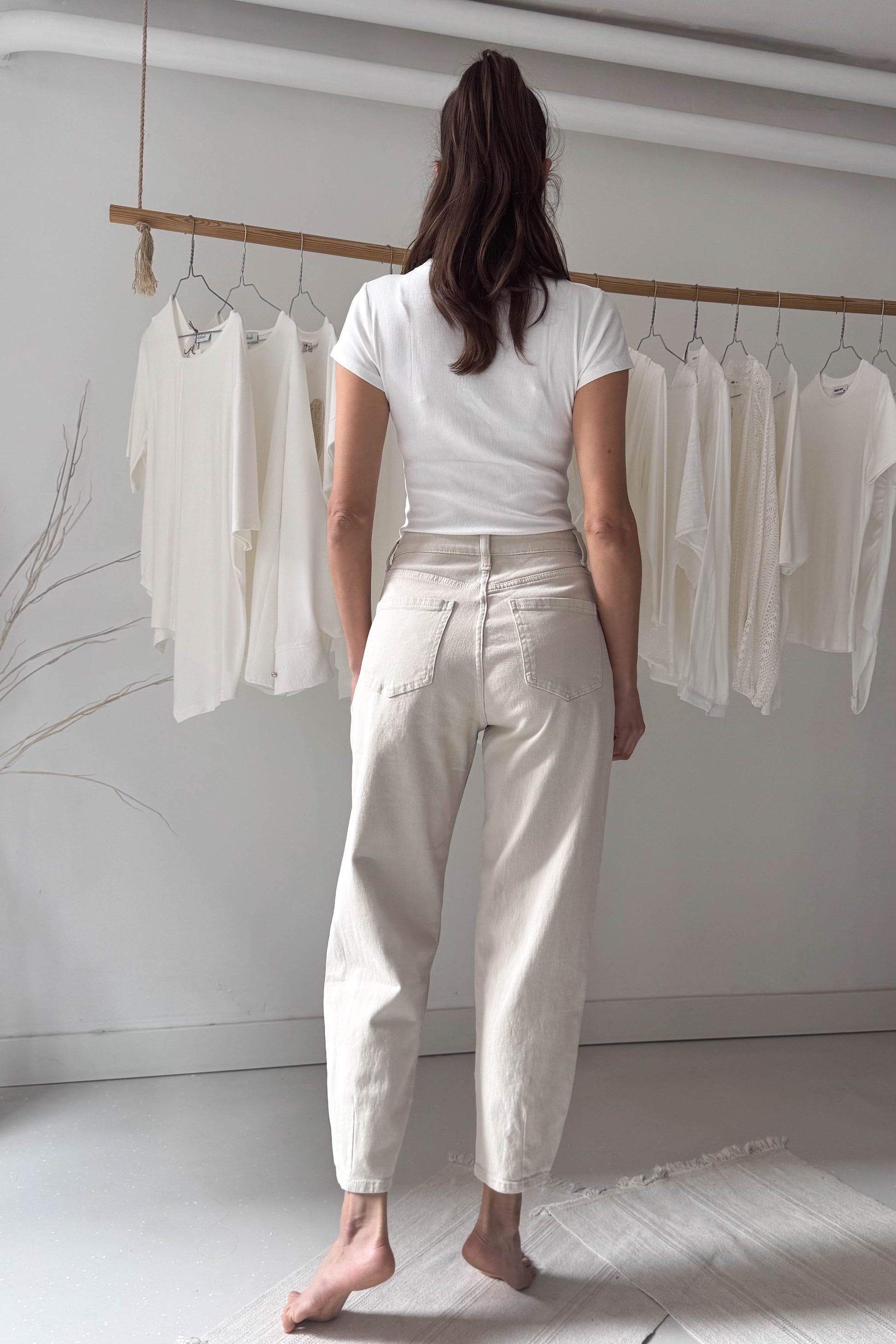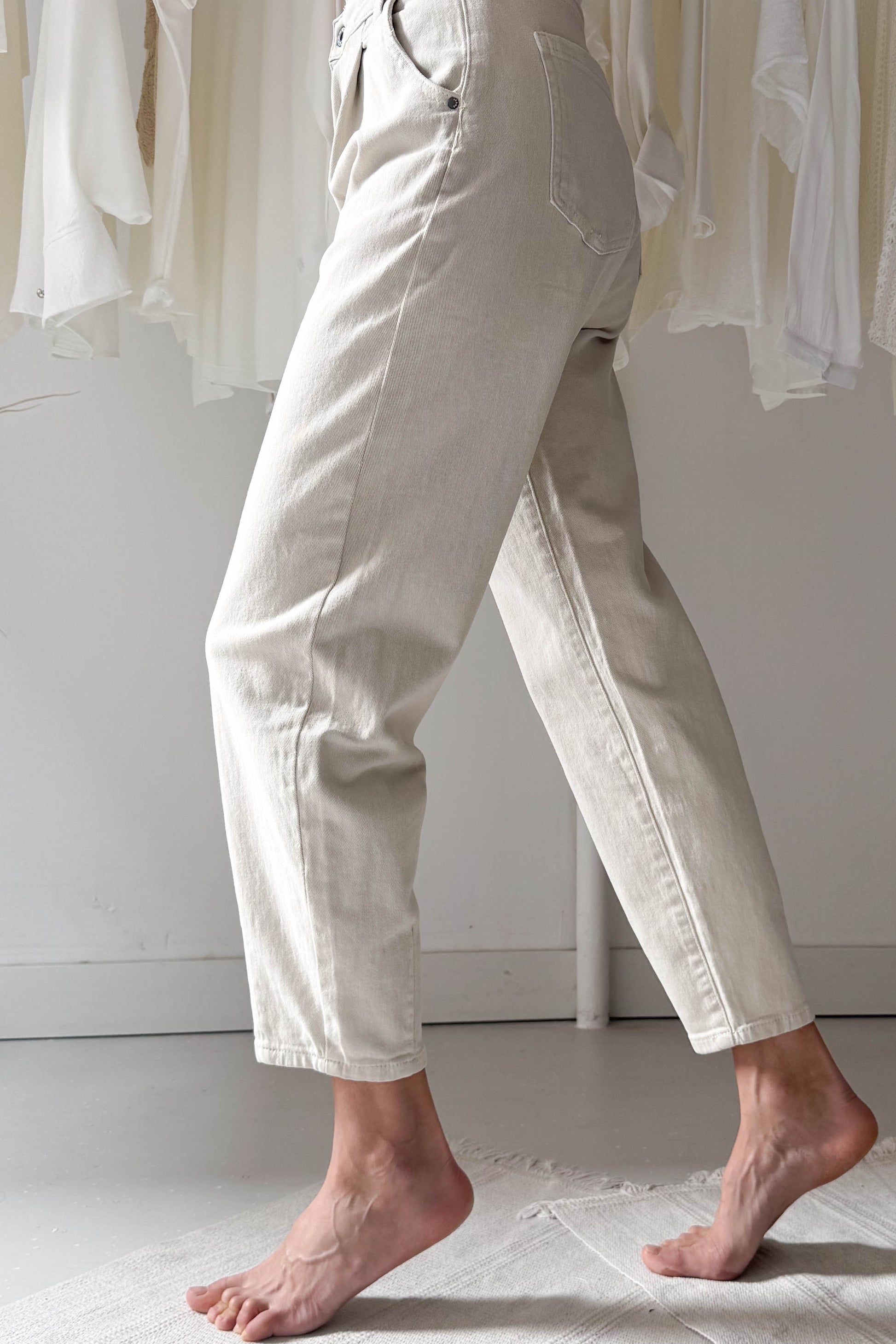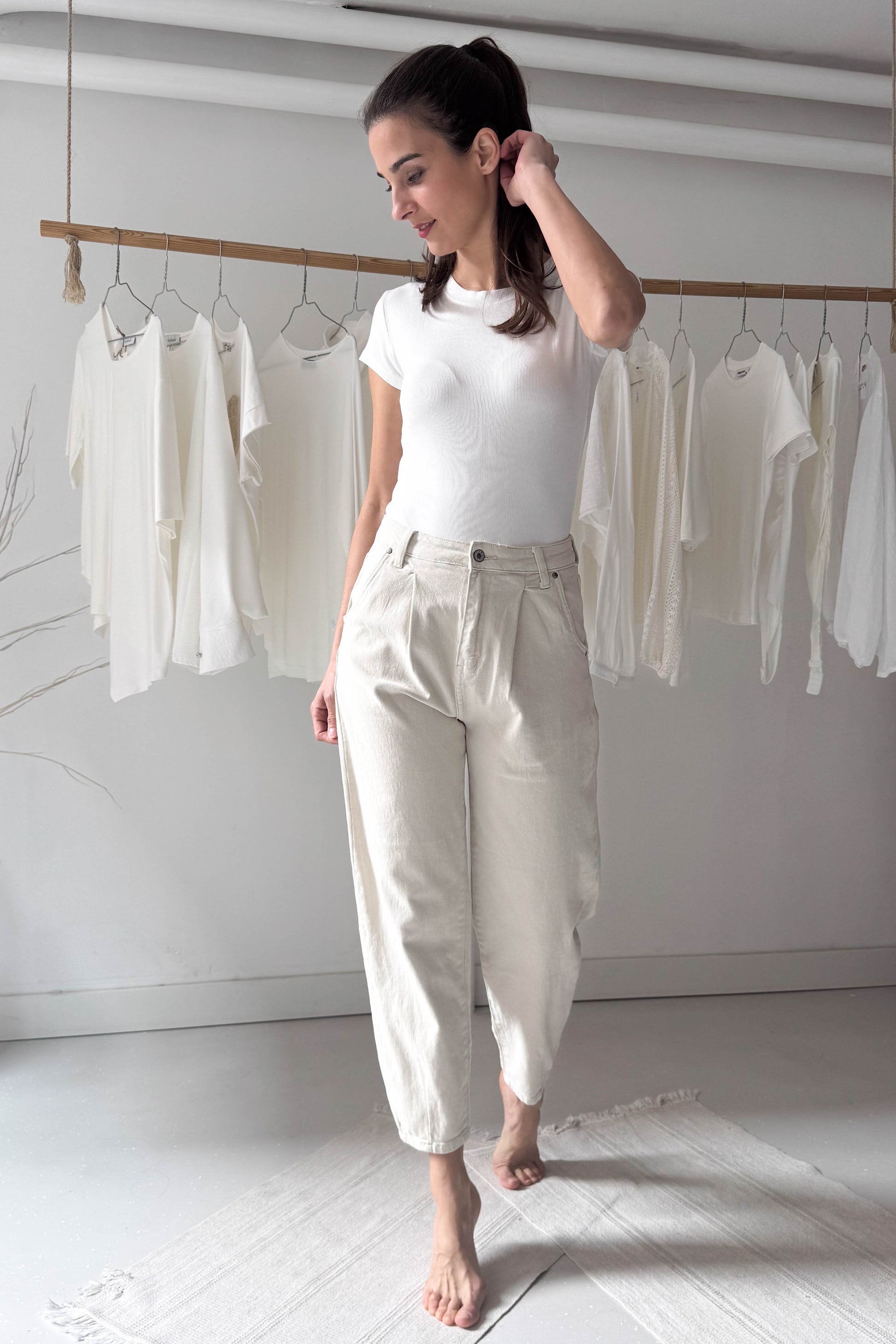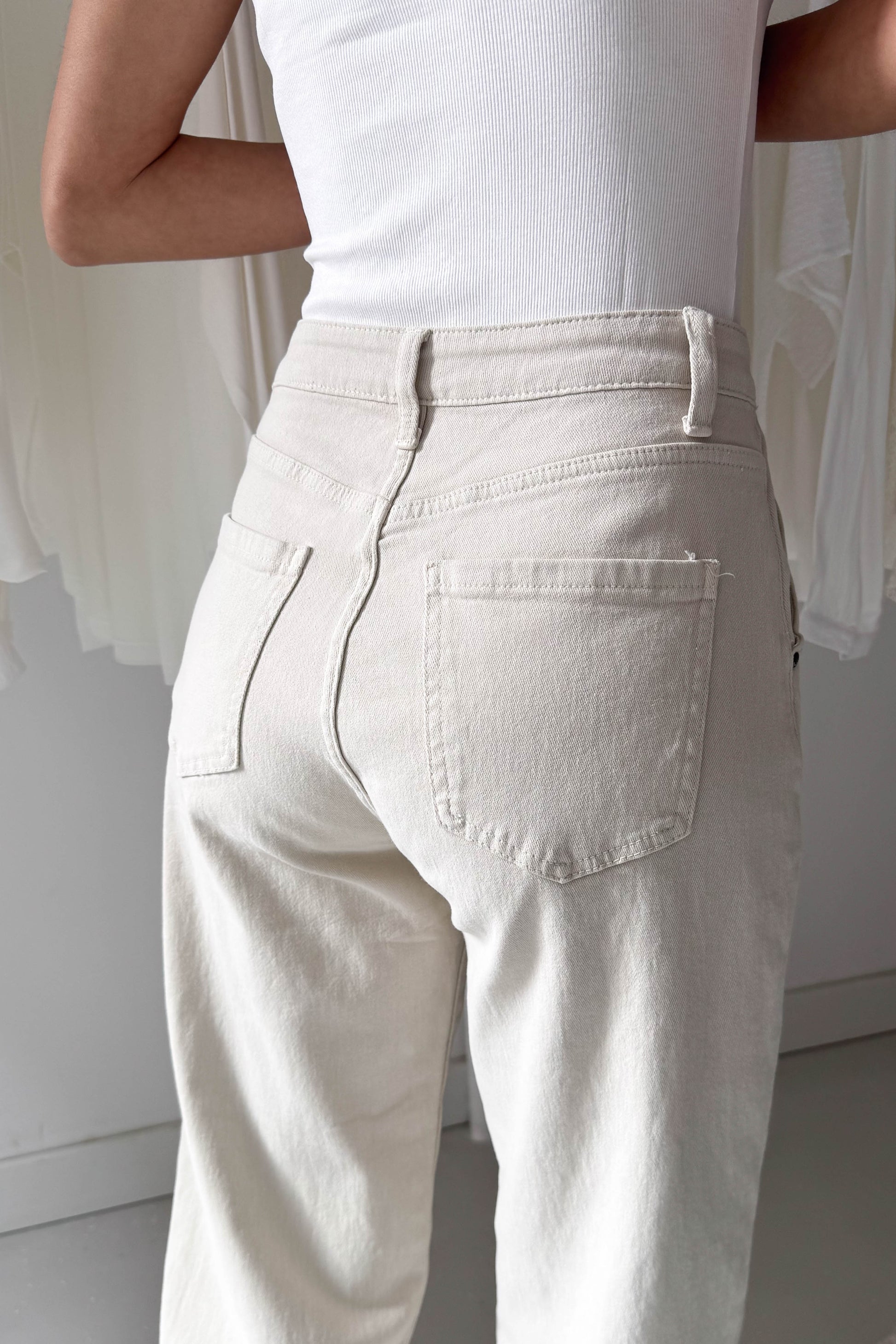 Felül enyhén bő, lefelé szűkülő szárú farmernadrág, bézs színben.