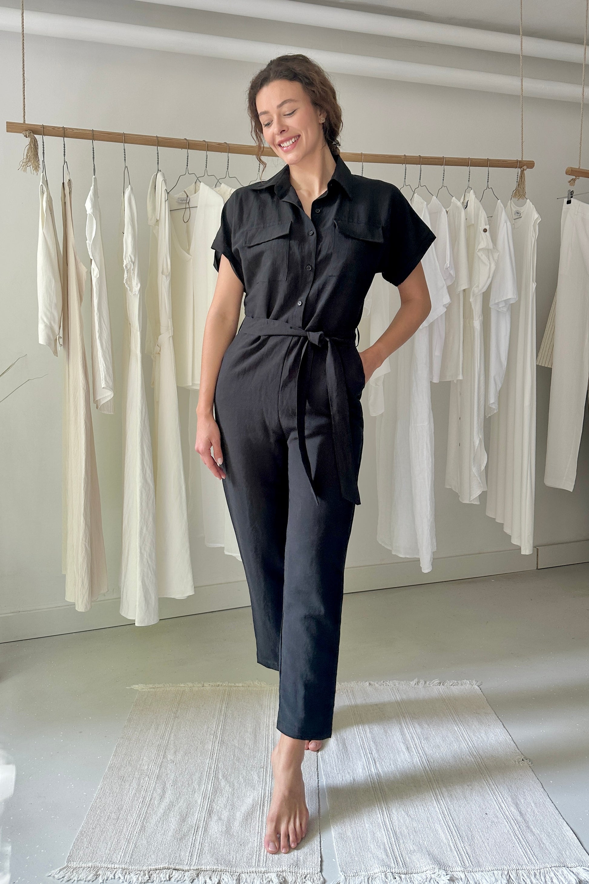 Len-viszkóz kevert szálas anyagból készült rövidujjú overál gombokkal, megkötővel. Magasabb lányoknak is ideális a nadrág rész hosszúsága miatt, de akár fel is lehet hajtani az alját. A modell 177 cm magas, M méretet visel.
