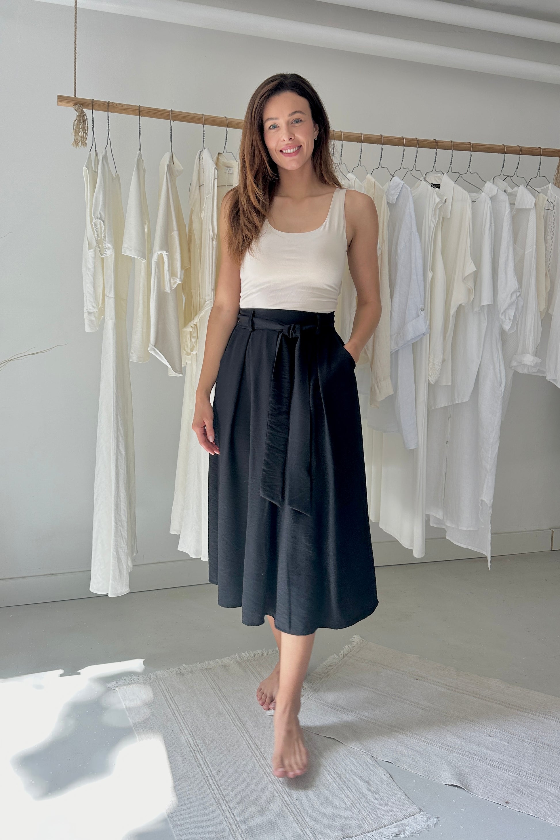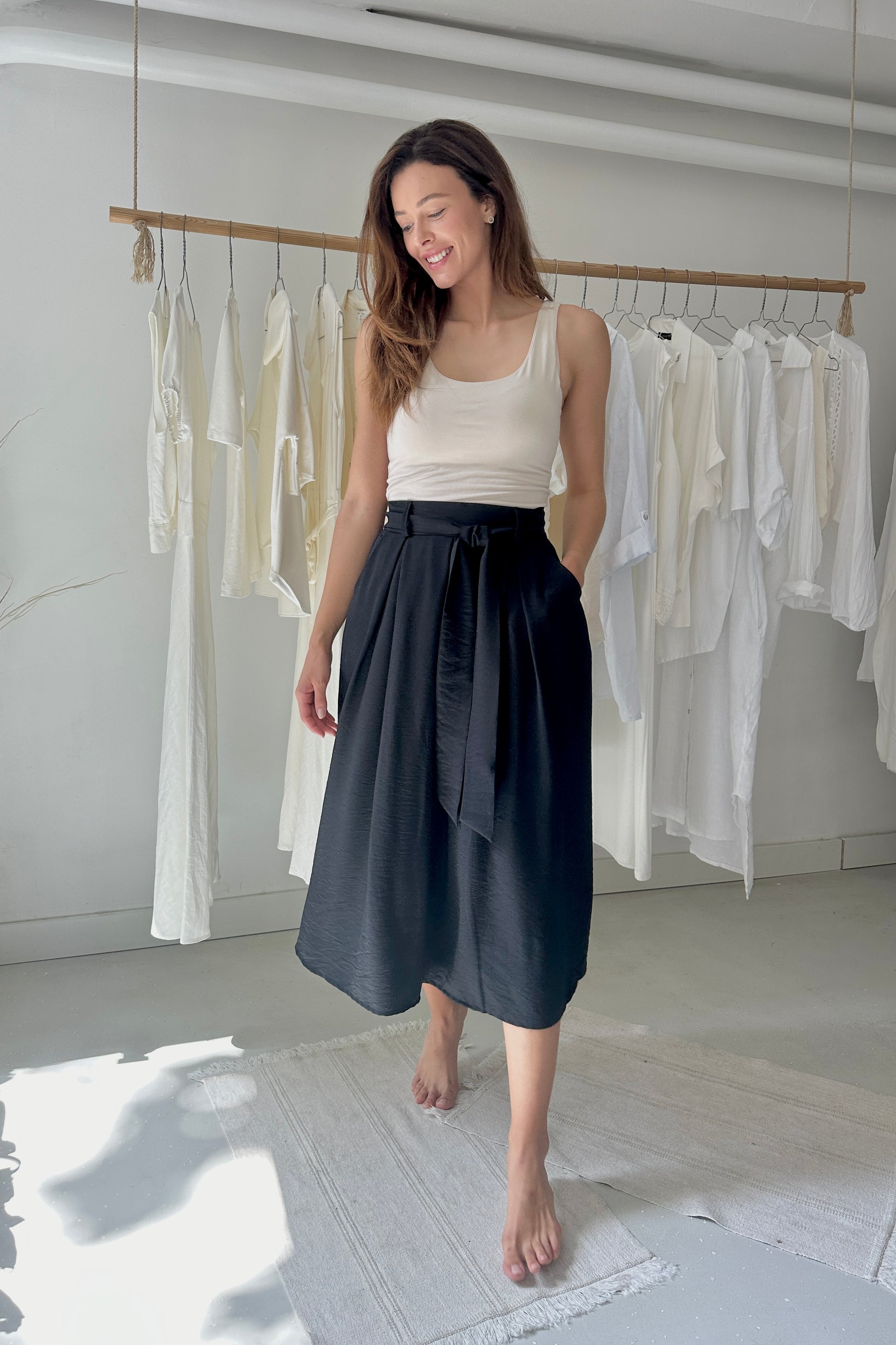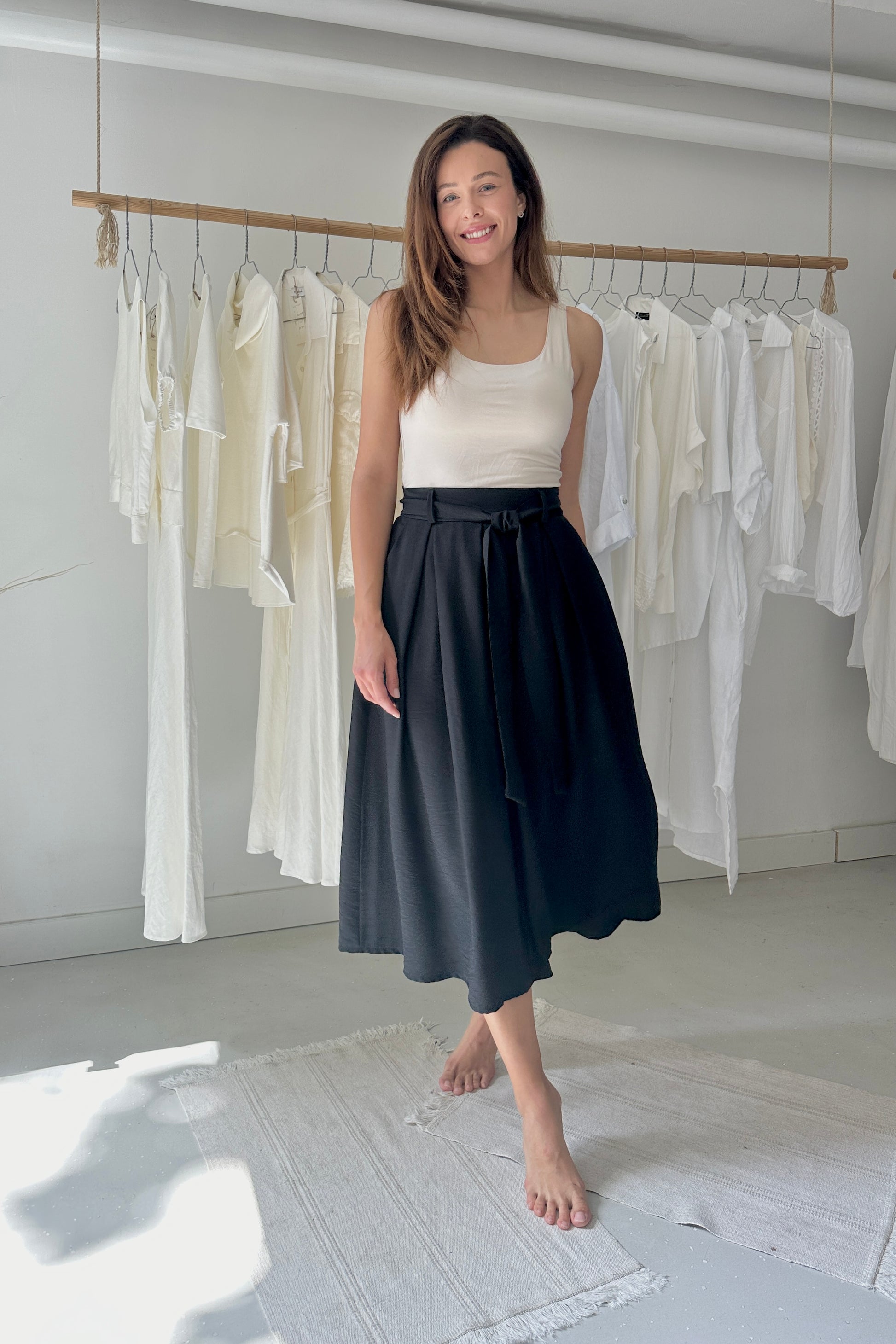 Gumis derékkal és övvel ellátott szoknya. Lenge anyagának köszönhetően tökéletes viselet a nyári forróságban is.
