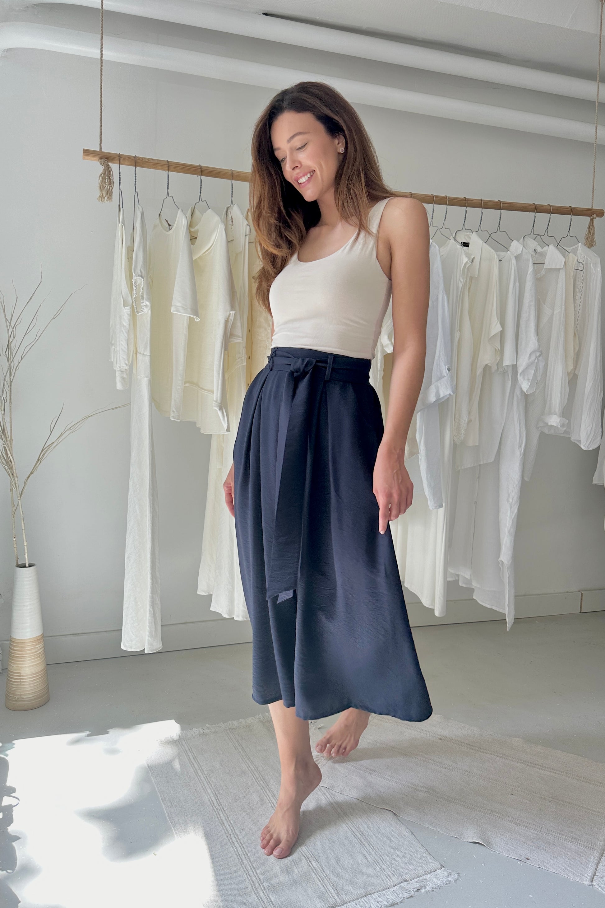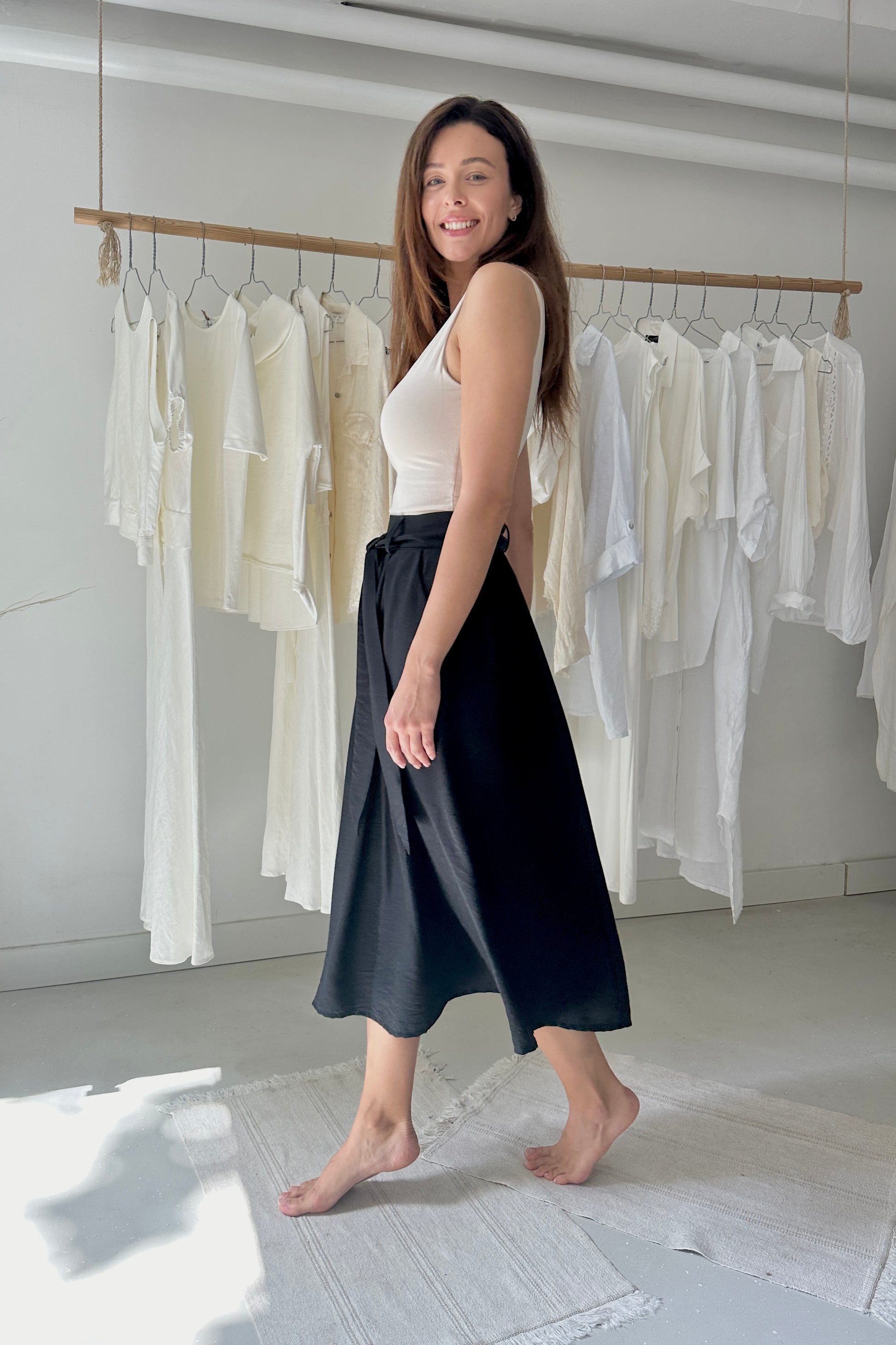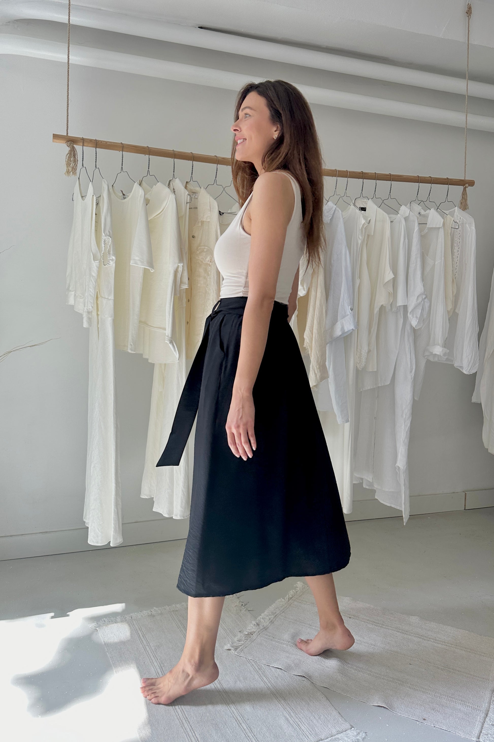 Gumis derékkal és övvel ellátott szoknya. Lenge anyagának köszönhetően tökéletes viselet a nyári forróságban is.