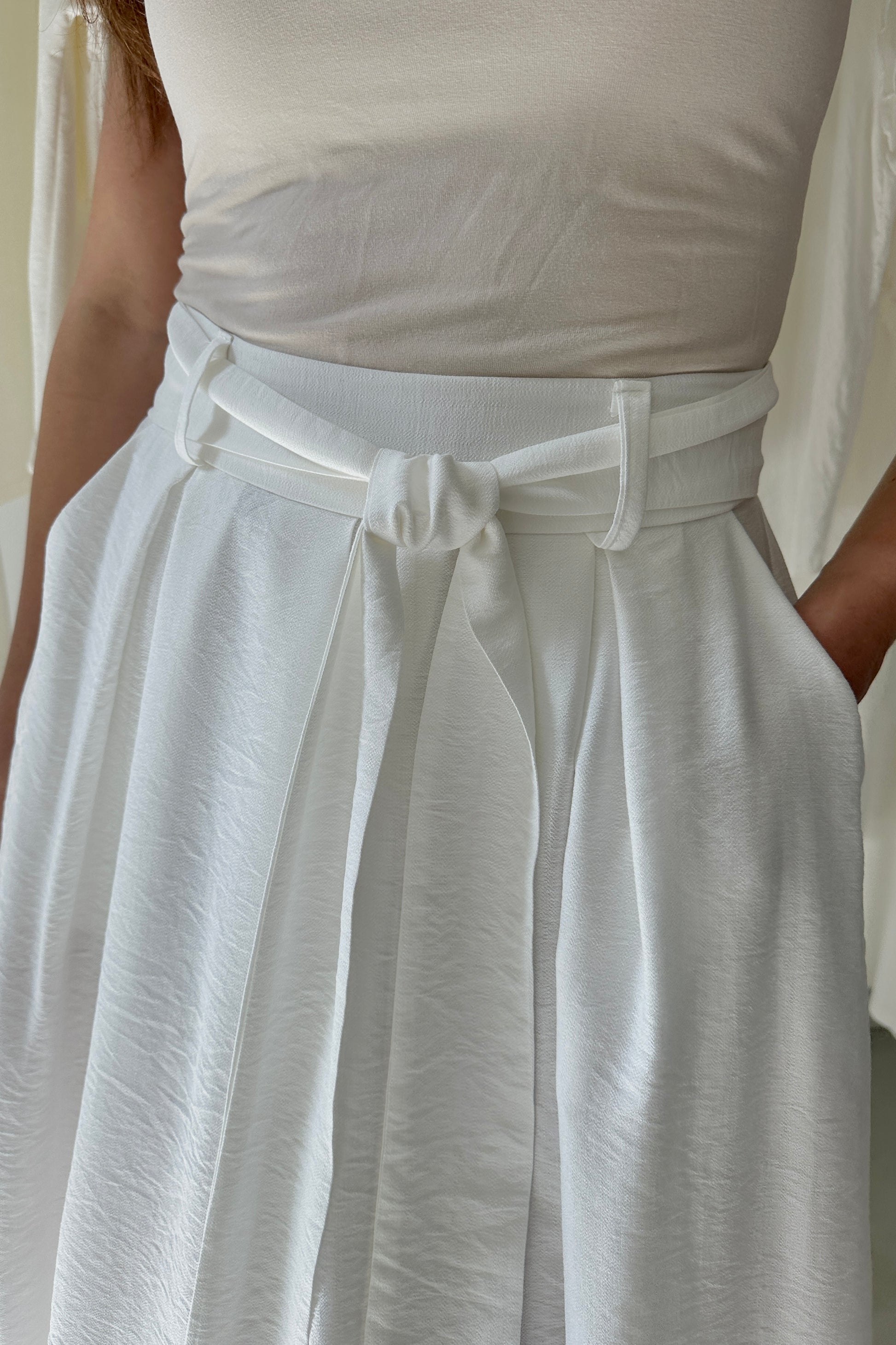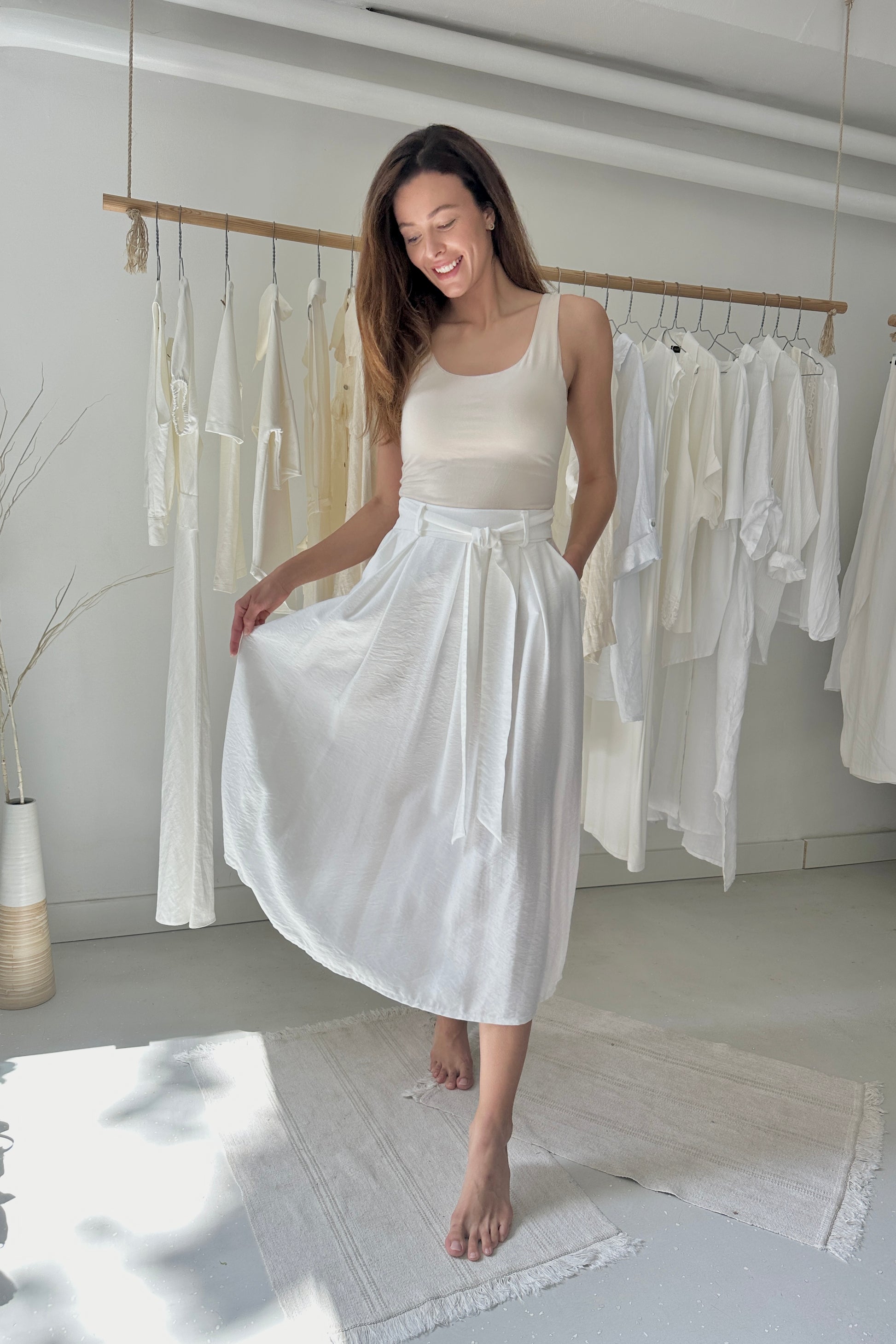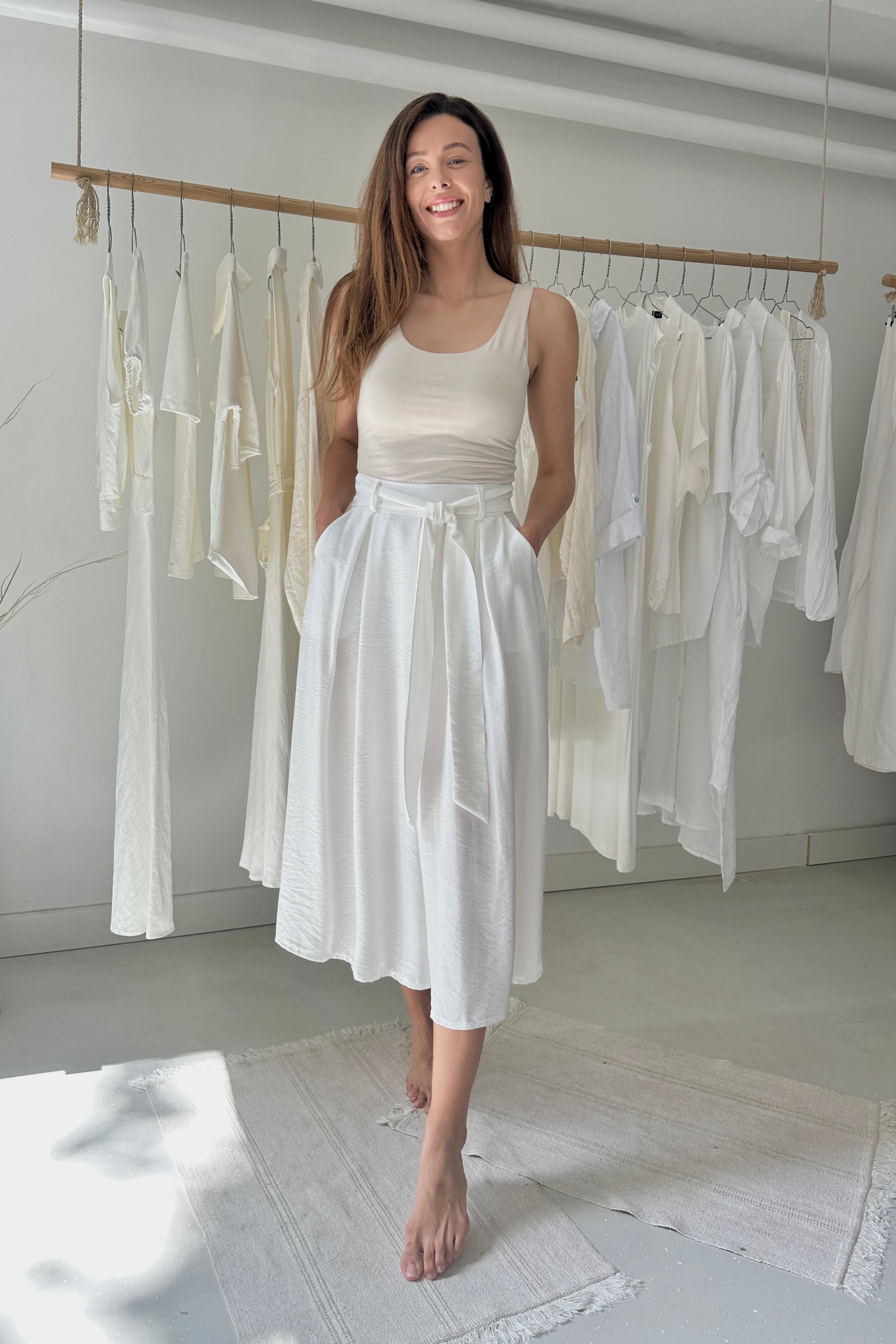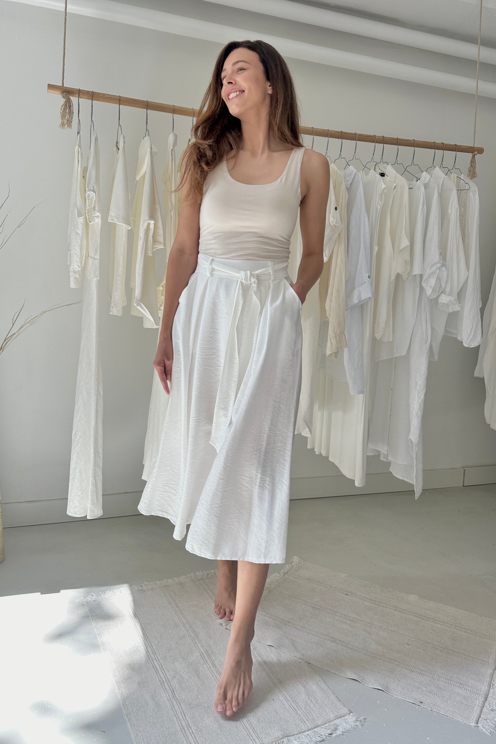Gumis derékkal és övvel ellátott szoknya. Lenge anyagának köszönhetően tökéletes viselet a nyári forróságban is.