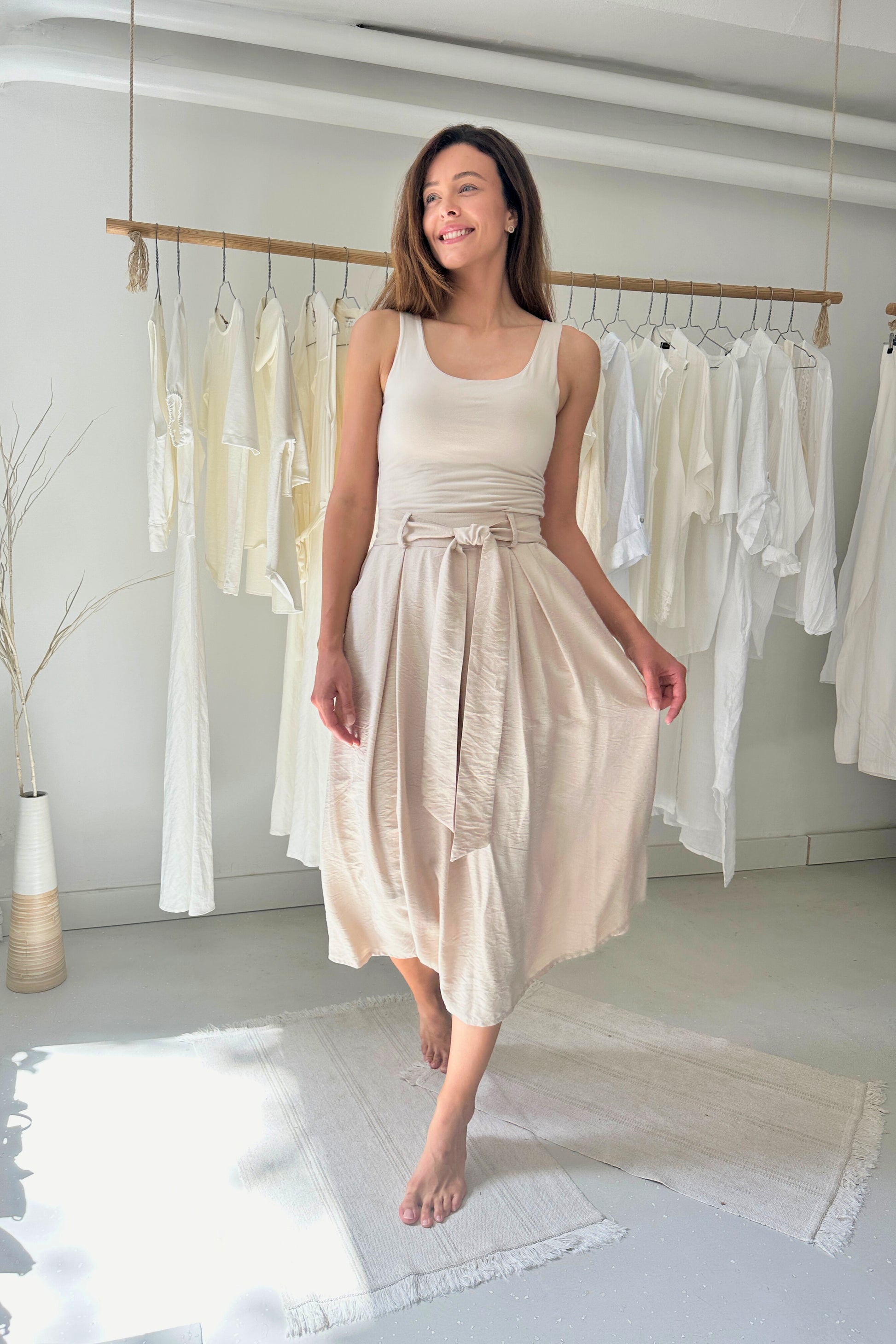 Gumis derékkal és övvel ellátott szoknya. Lenge anyagának köszönhetően tökéletes viselet a nyári forróságban is.