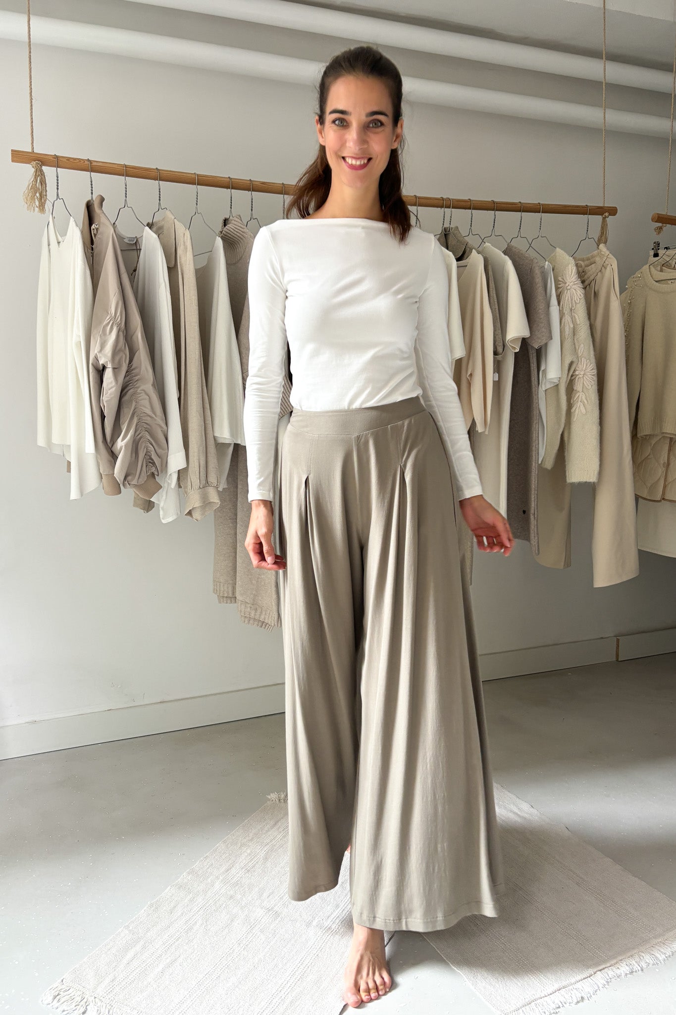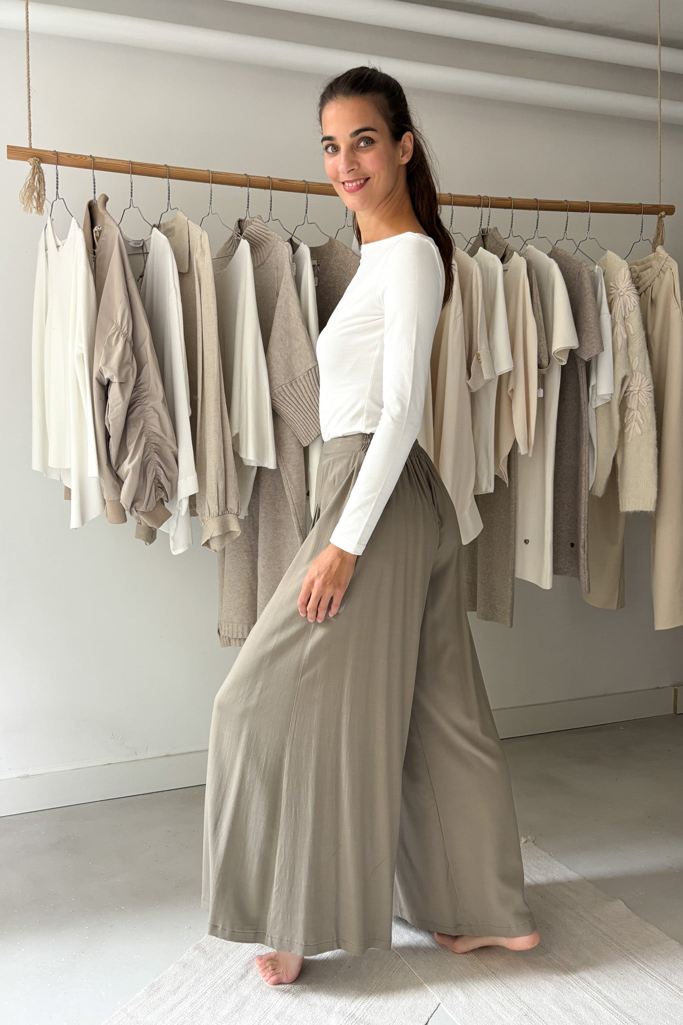 Lenge, viszkóz nadrág olivazöld színben. Hátul a derékrészen gumírozott. Bőszárú, lágyesésű fazon. Elöl hajtásos.