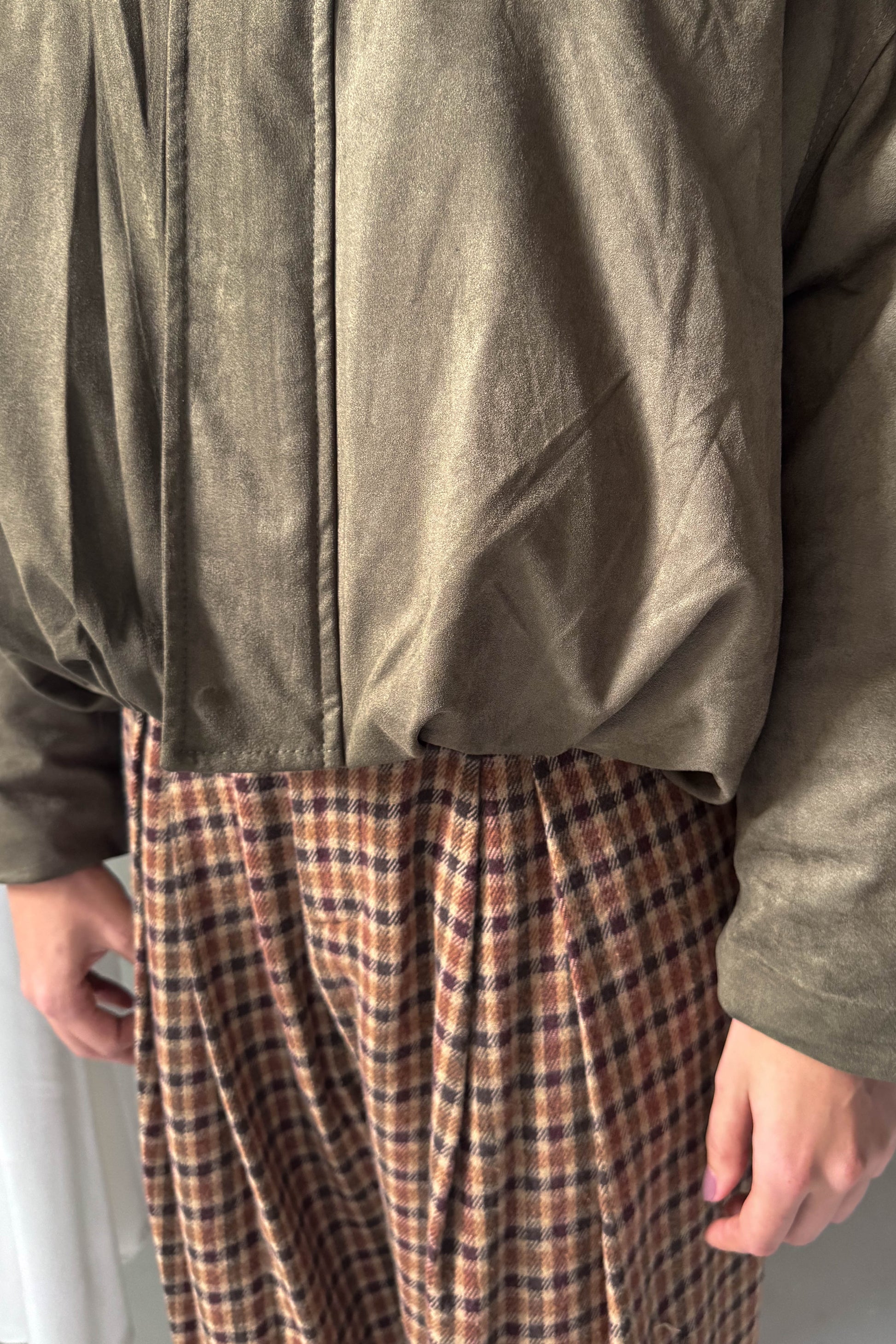 Alul hajtásos, buggyos bomber dzseki. Denevérujjú, vállpántos fazon. Levehető szőrös gallérral van ellátva, alatta normál gallér van. Elől cipzárral és patenttal záródik. Steppelt béléses fazon.