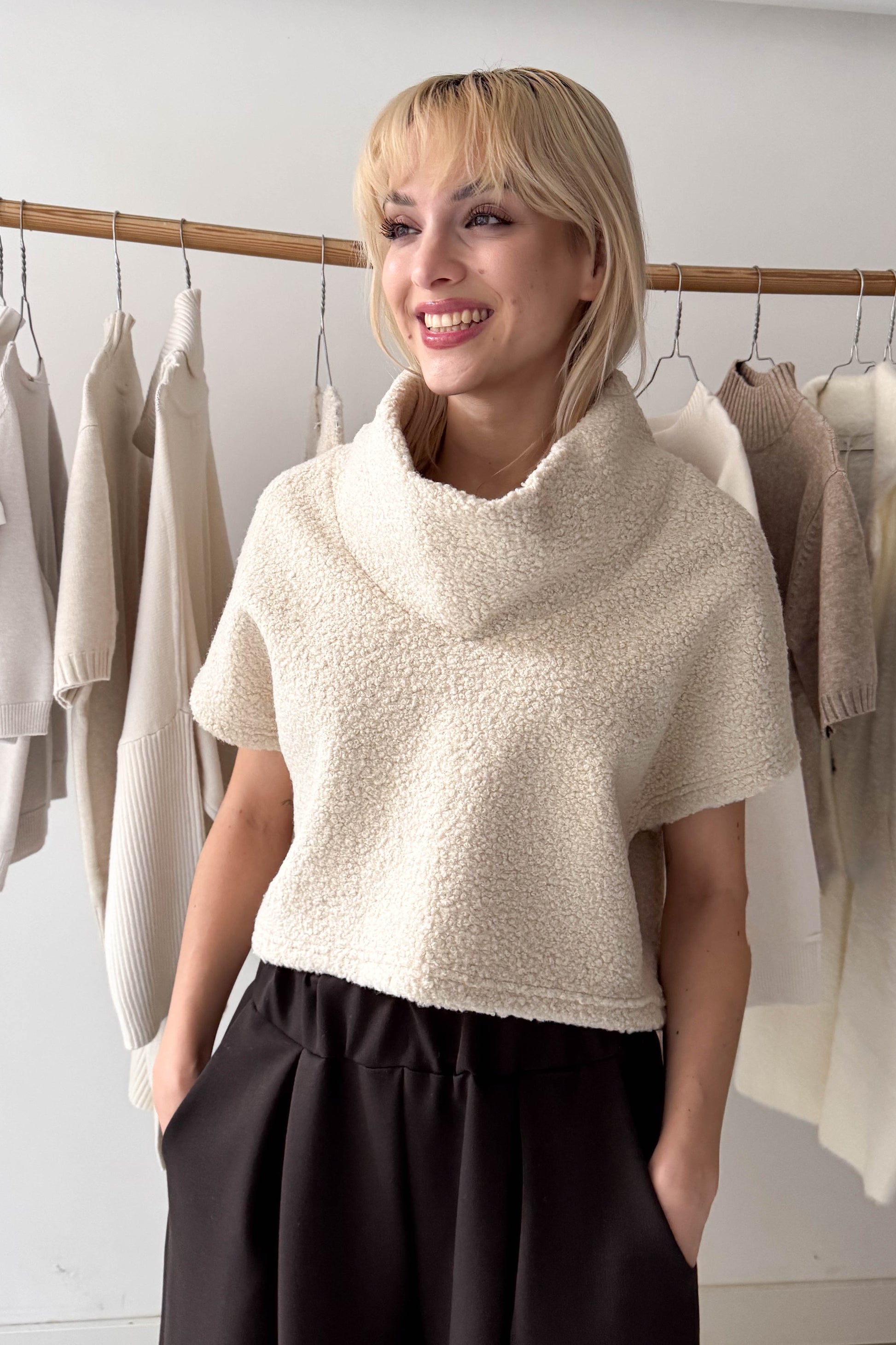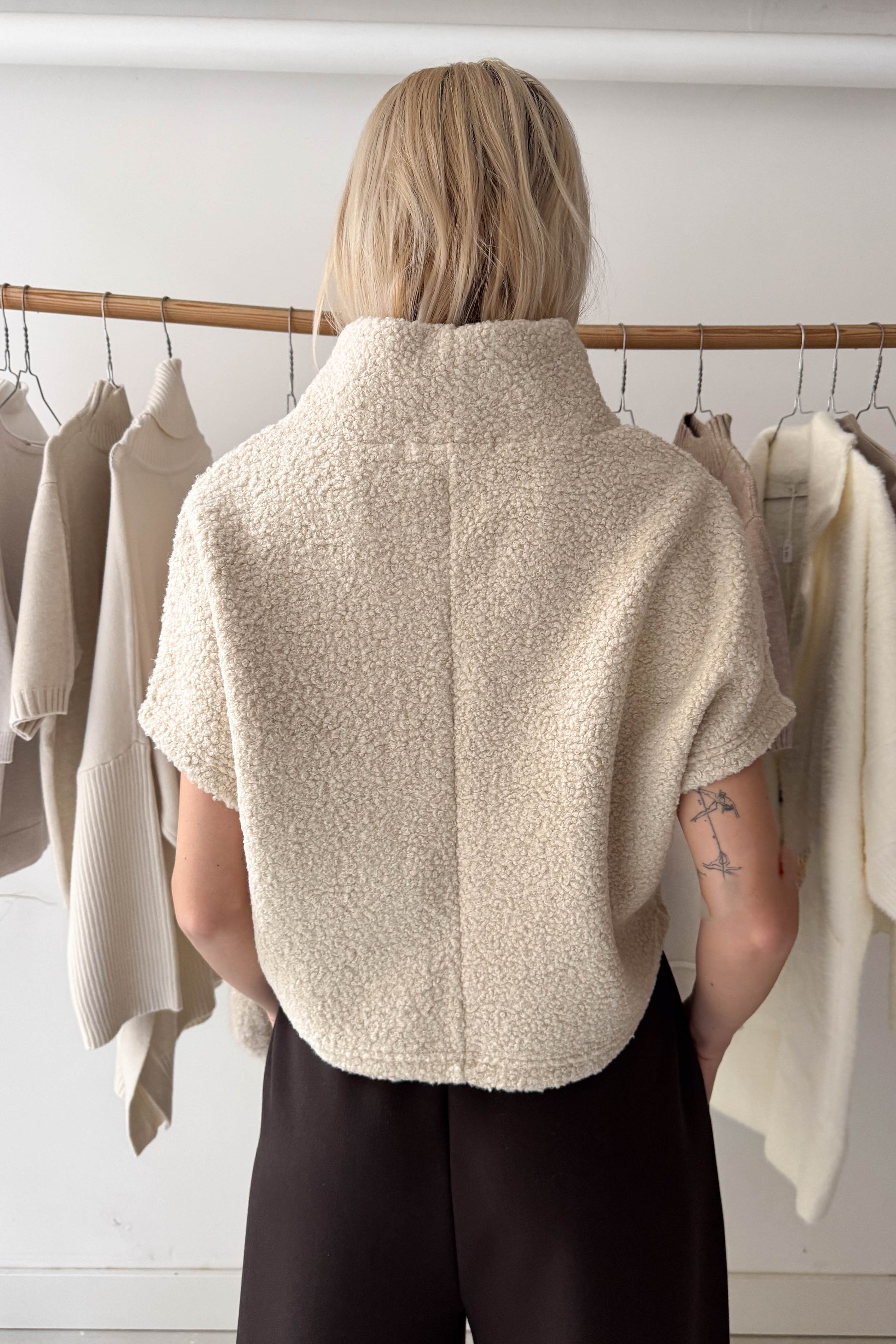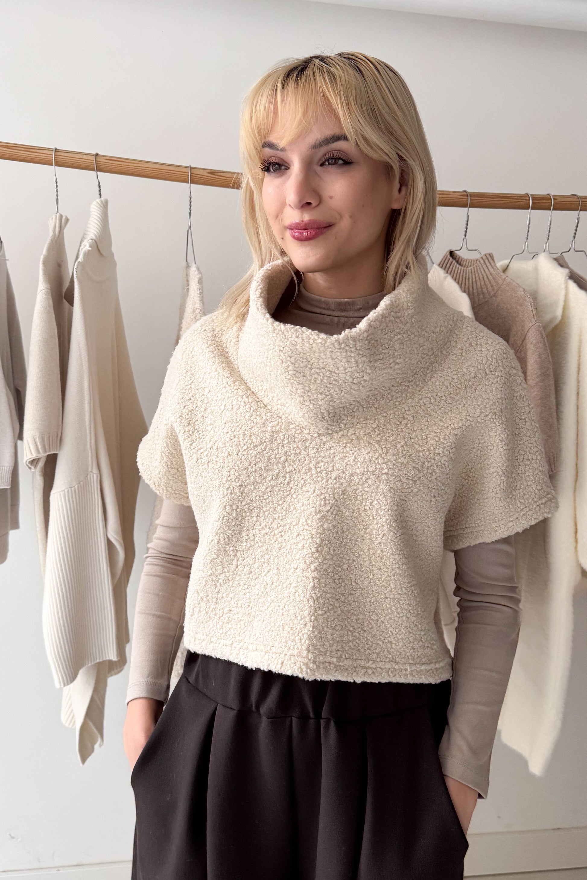 Magas, álló nyakú buklé felső, bézs színben. Ejtett vállú, ujjatlan fazon.