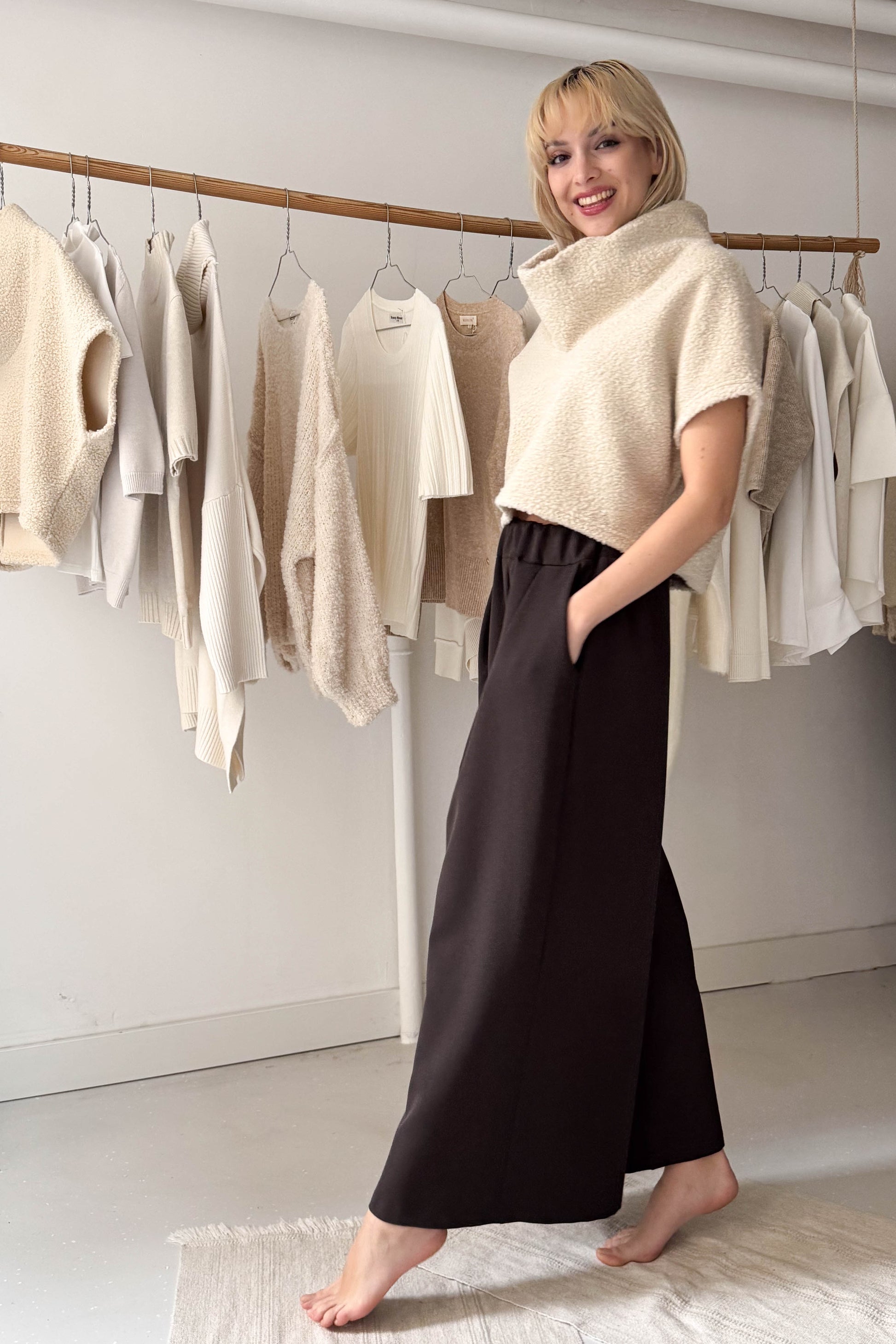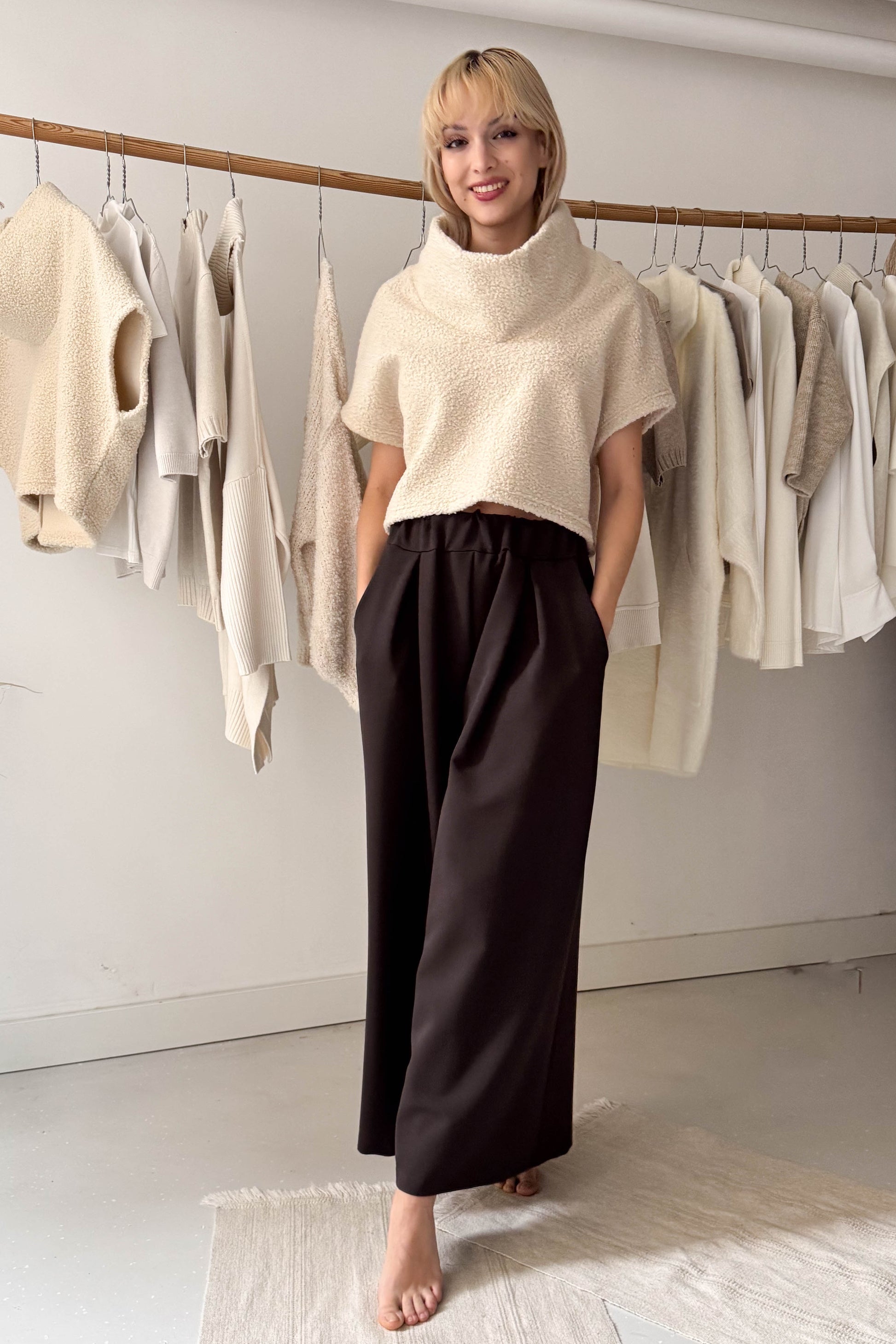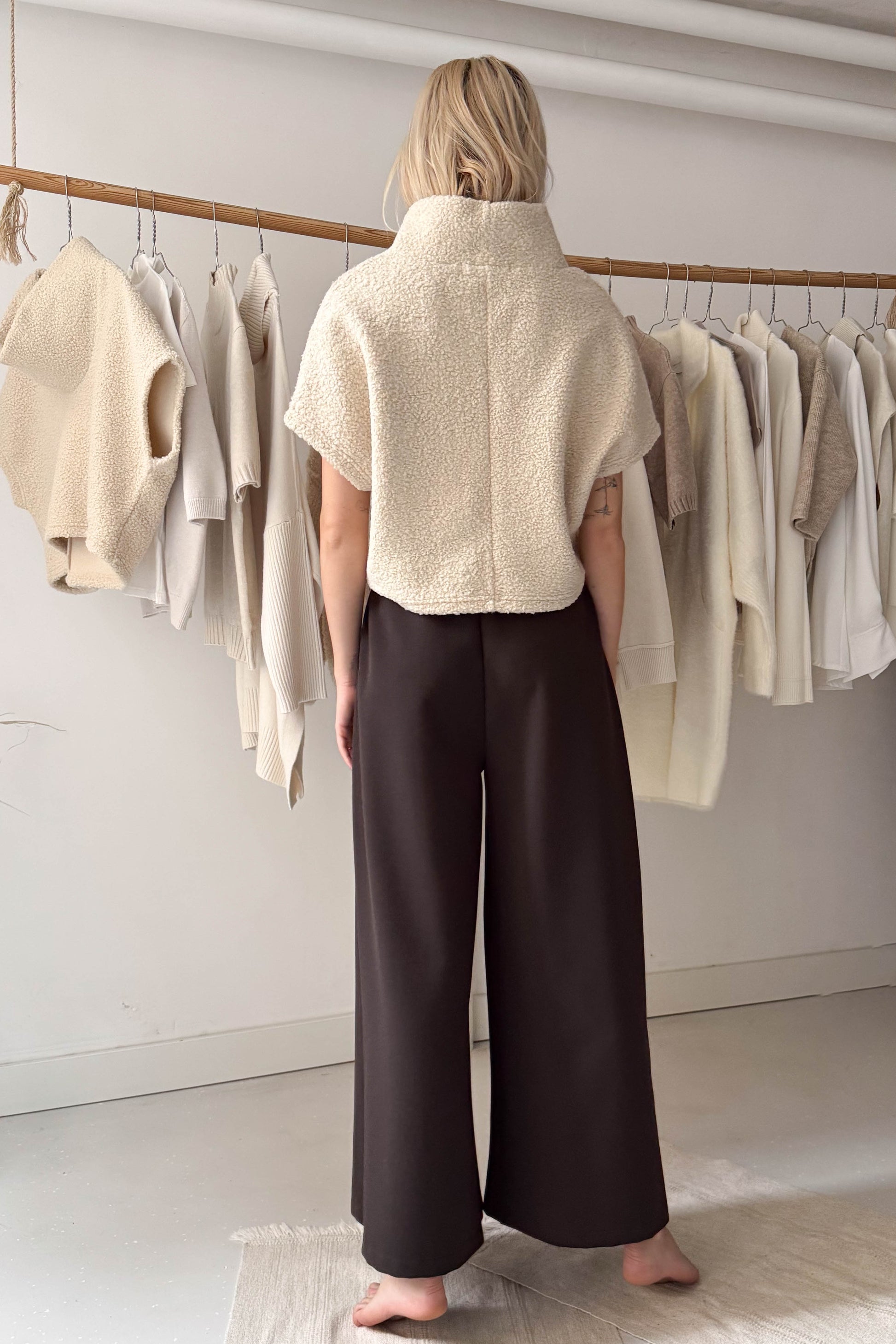 Magas, álló nyakú buklé felső, bézs színben. Ejtett vállú, ujjatlan fazon.