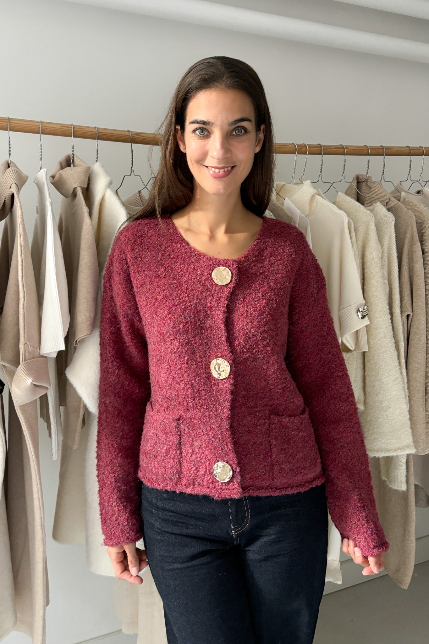 Nagyon puha, magenta kardigán. Középen arany gombokkal összefogható. Környakkal ellátott, zsebes fazon.