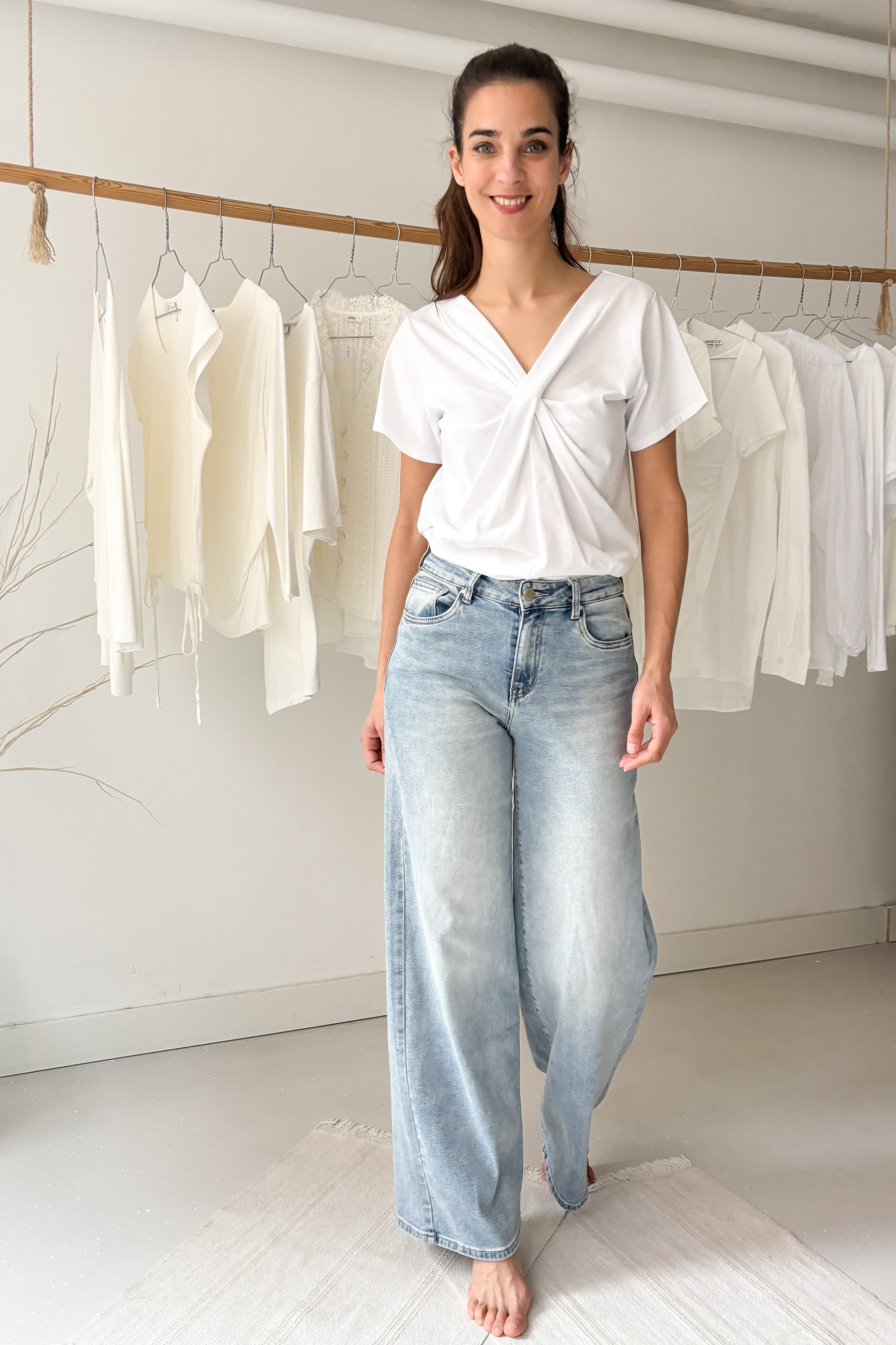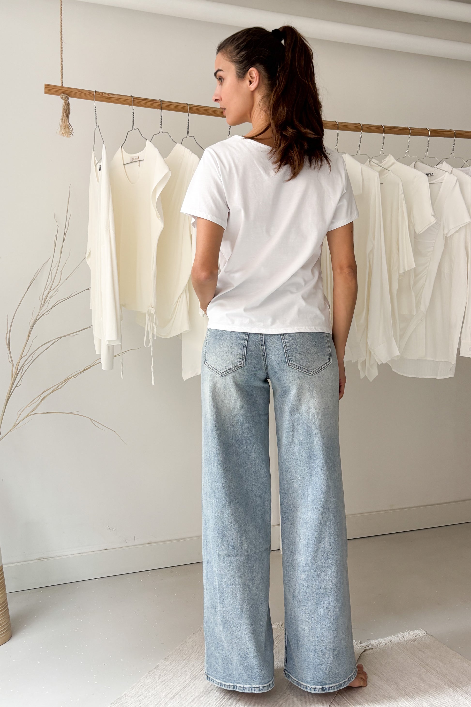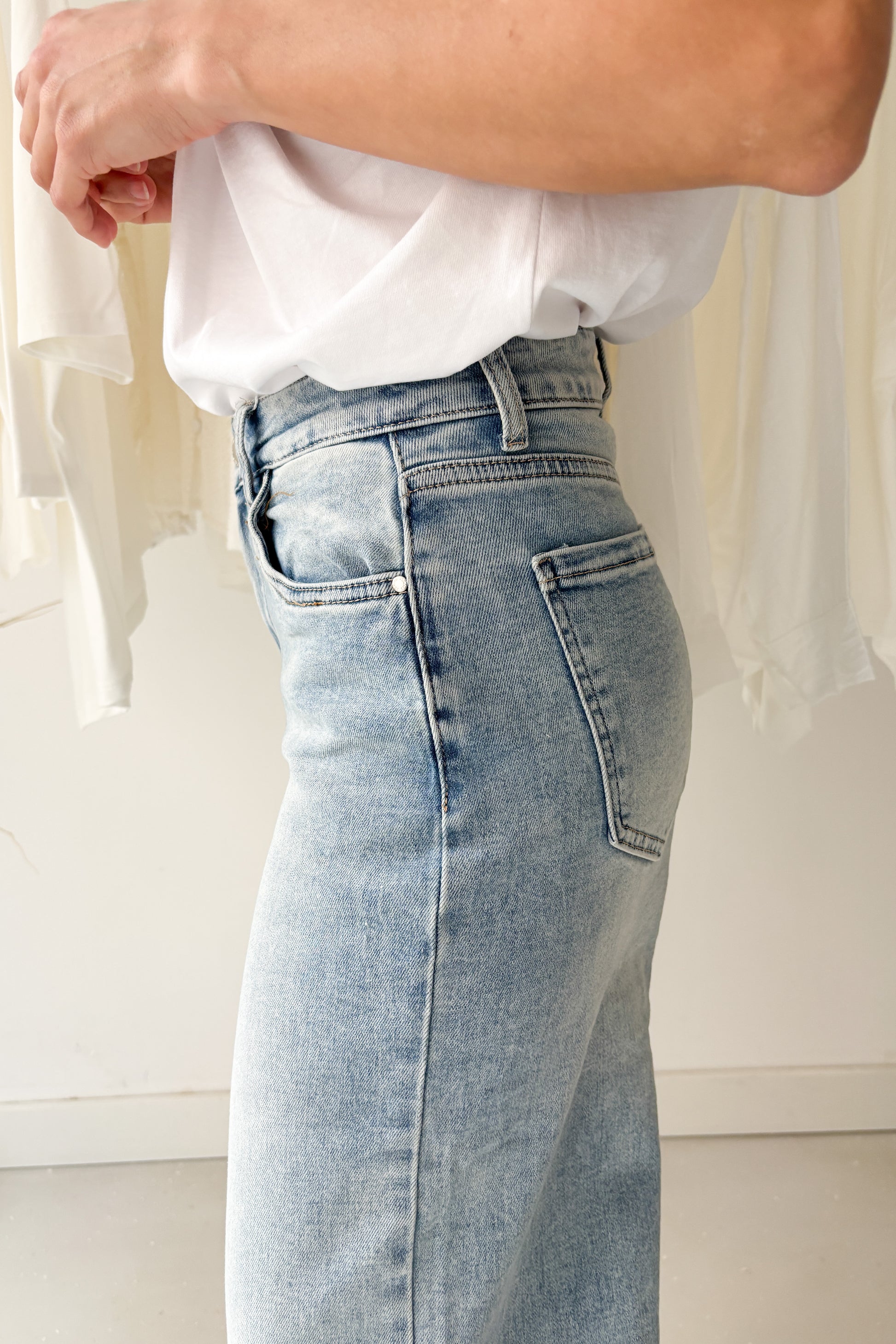 Világoskék, bővülő szárú farmer nadrág. Koptatott, zsebes fazon.
