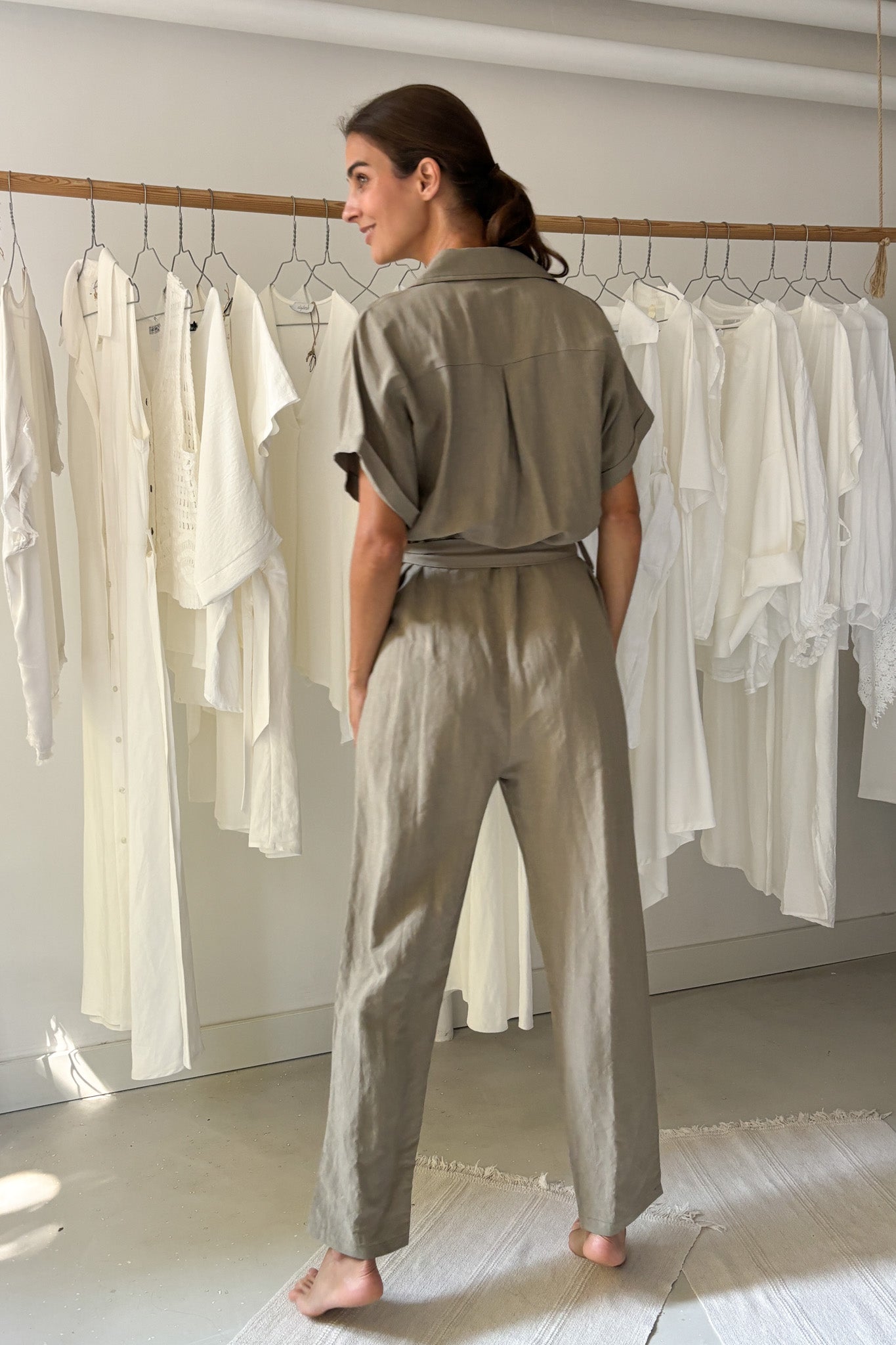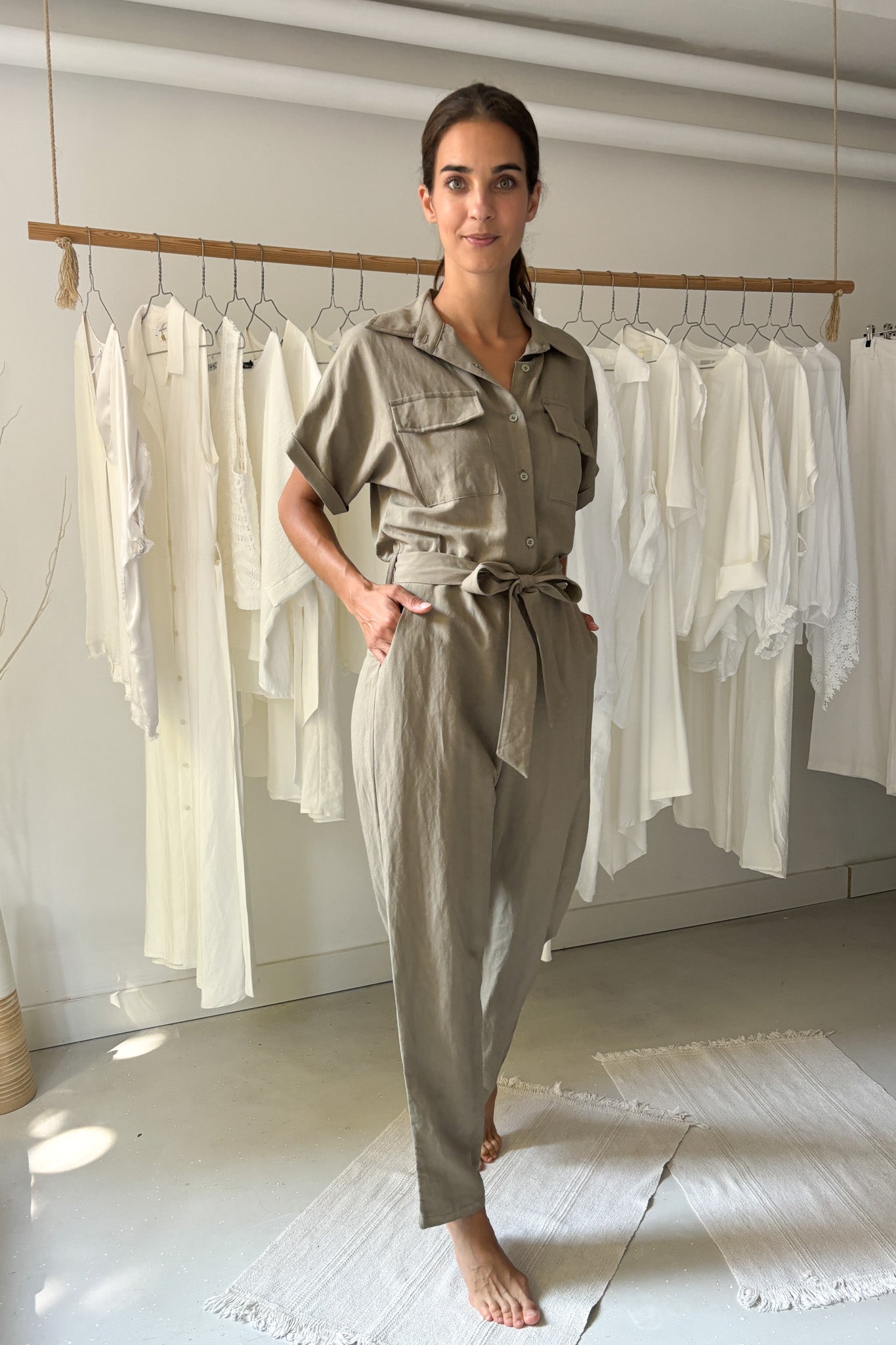 Len-viszkóz kevert szálas anyagból készült rövidujjú overál gombokkal, megkötővel. Magasabb lányoknak is ideális a nadrág rész hosszúsága miatt, de akár fel is lehet hajtani az alját.