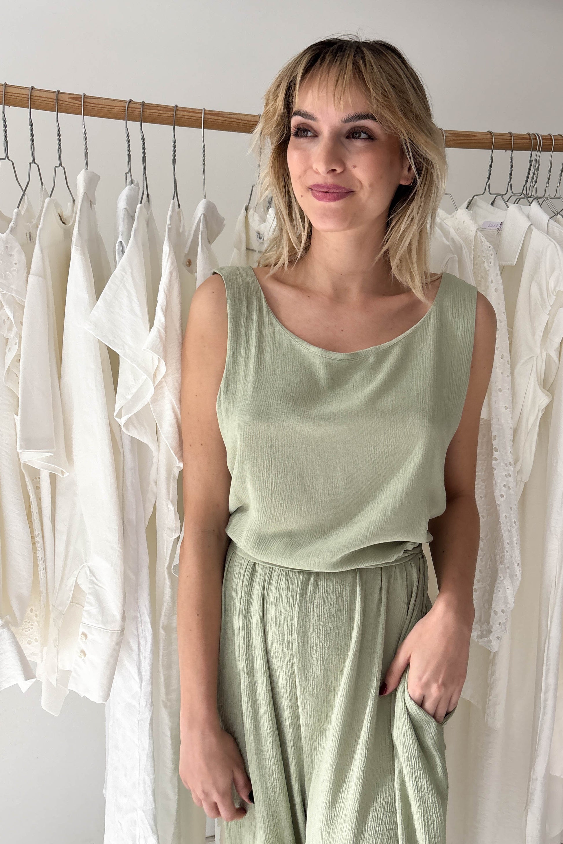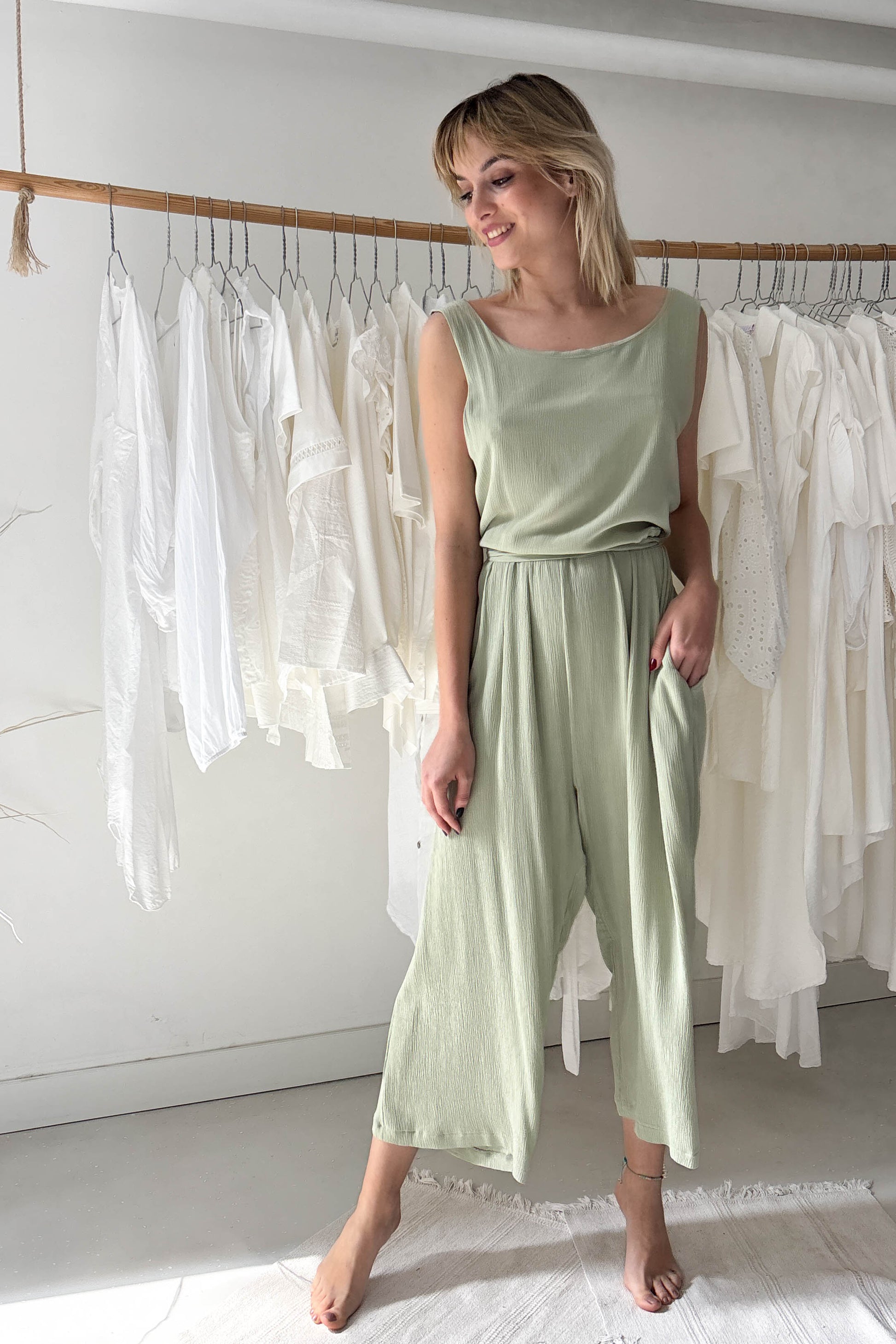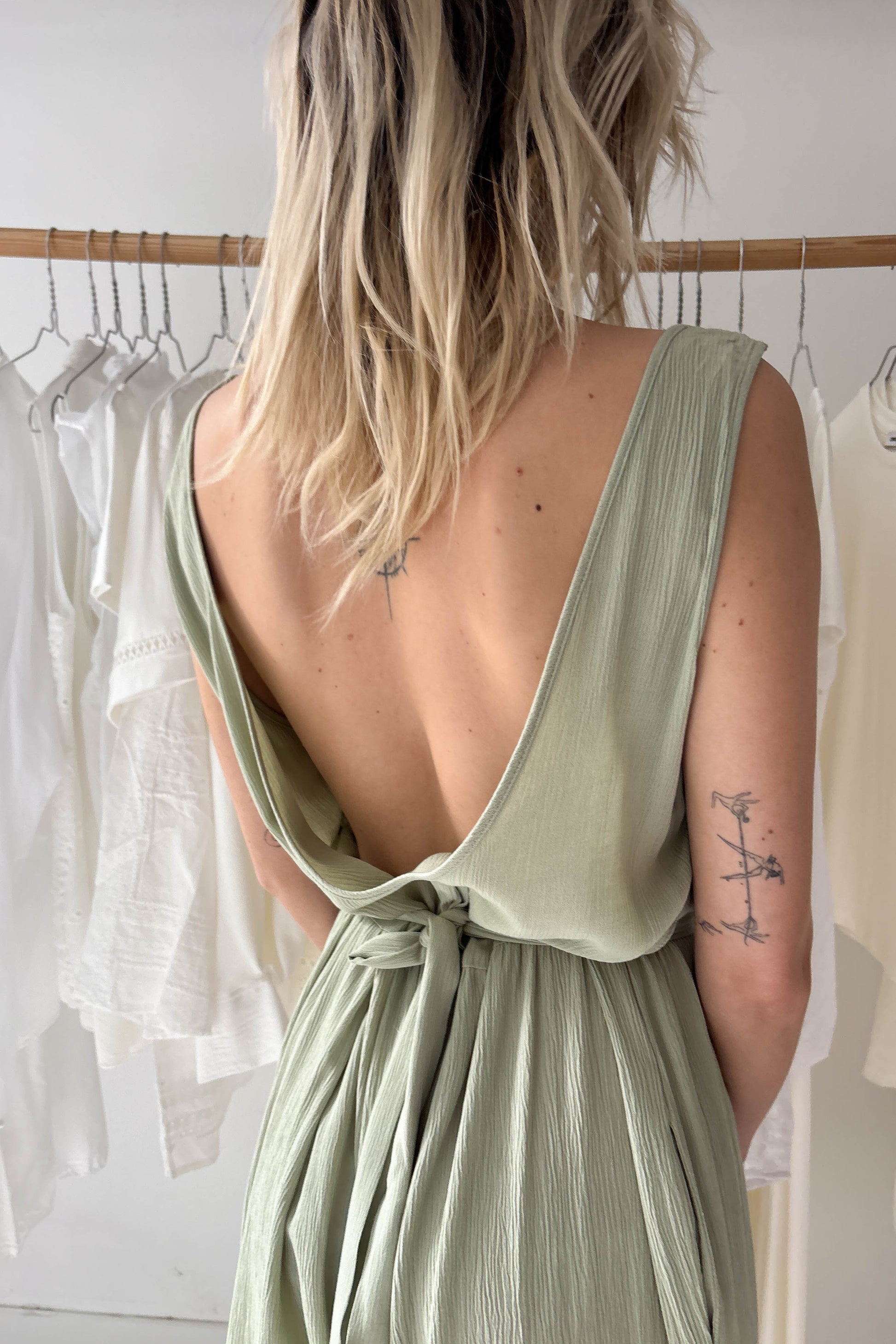 Hátul mélyen kivágott, mentazöld overál. Deréknál - elöl/hátul - megköthető.