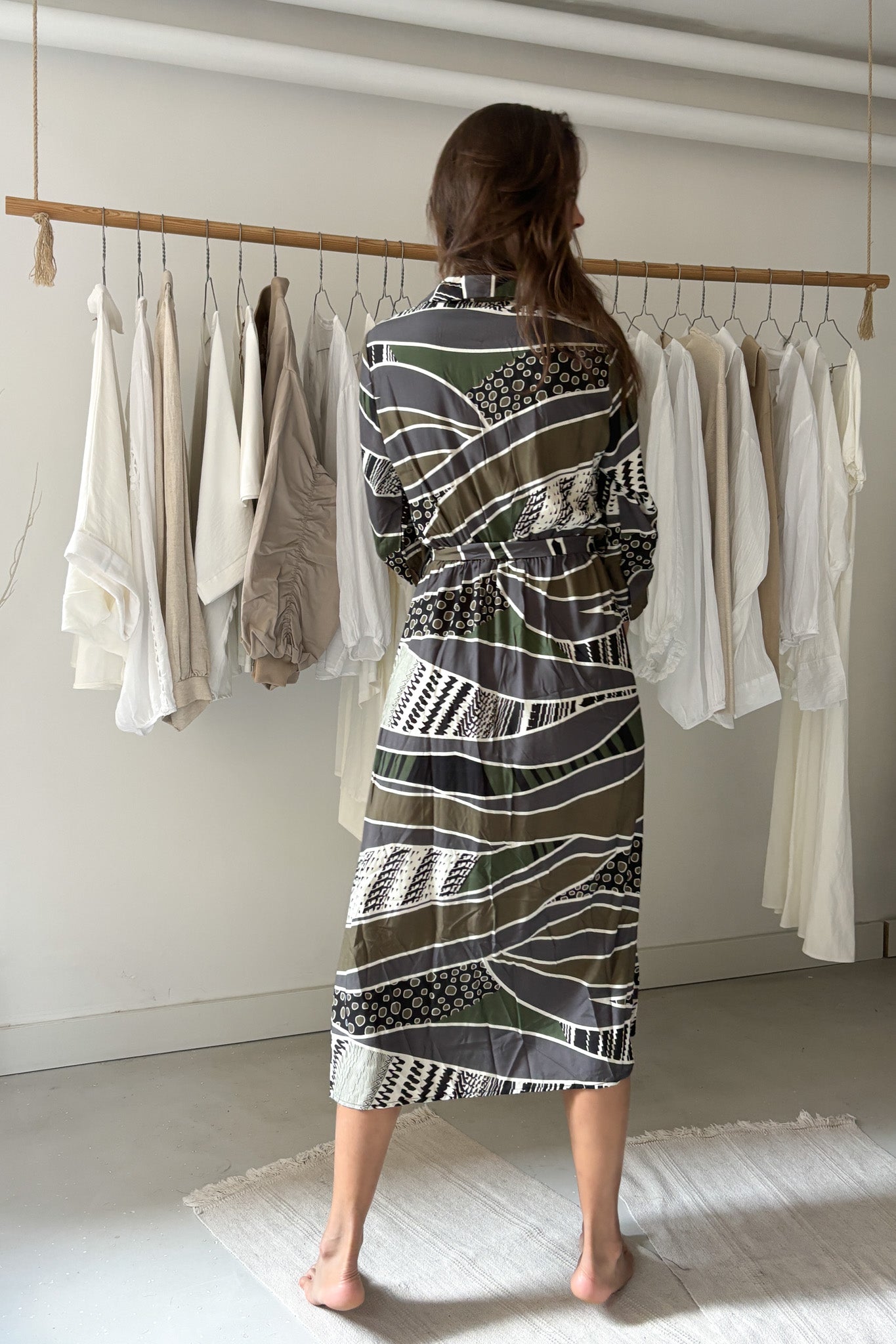 Mintás ruha gallérral, apró gombokkal és passzos ujjal. Derékon húzott, valamint saját anyagából készült övvel megköthető.