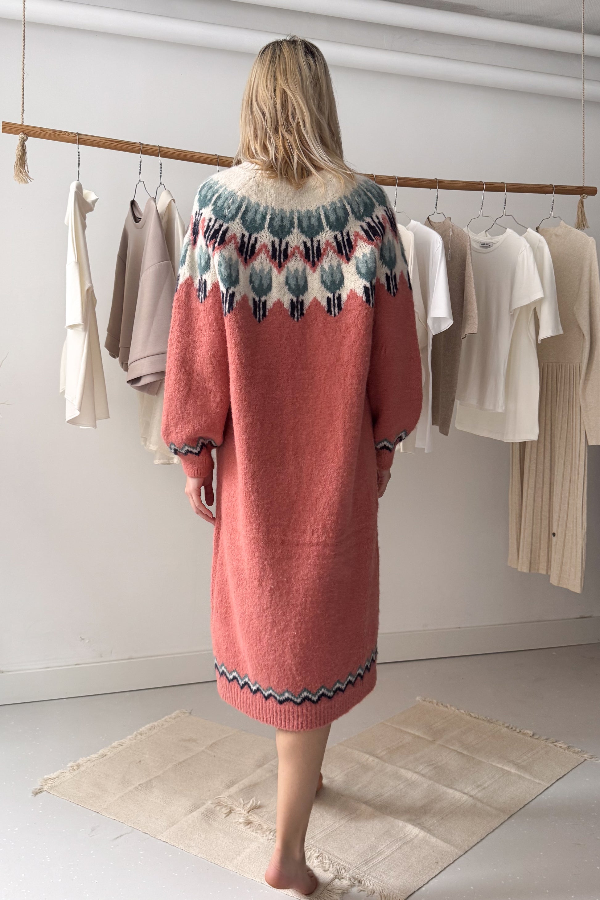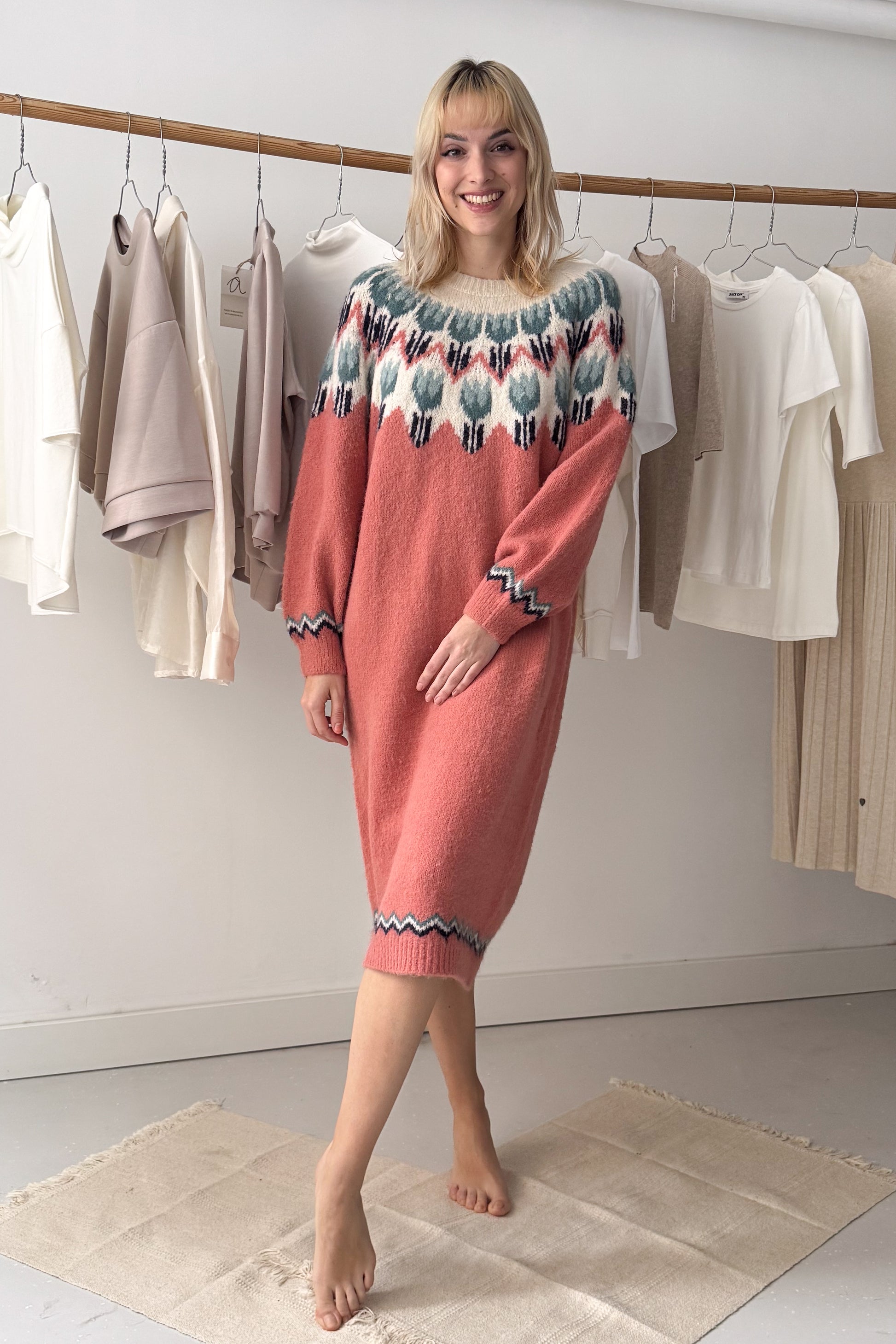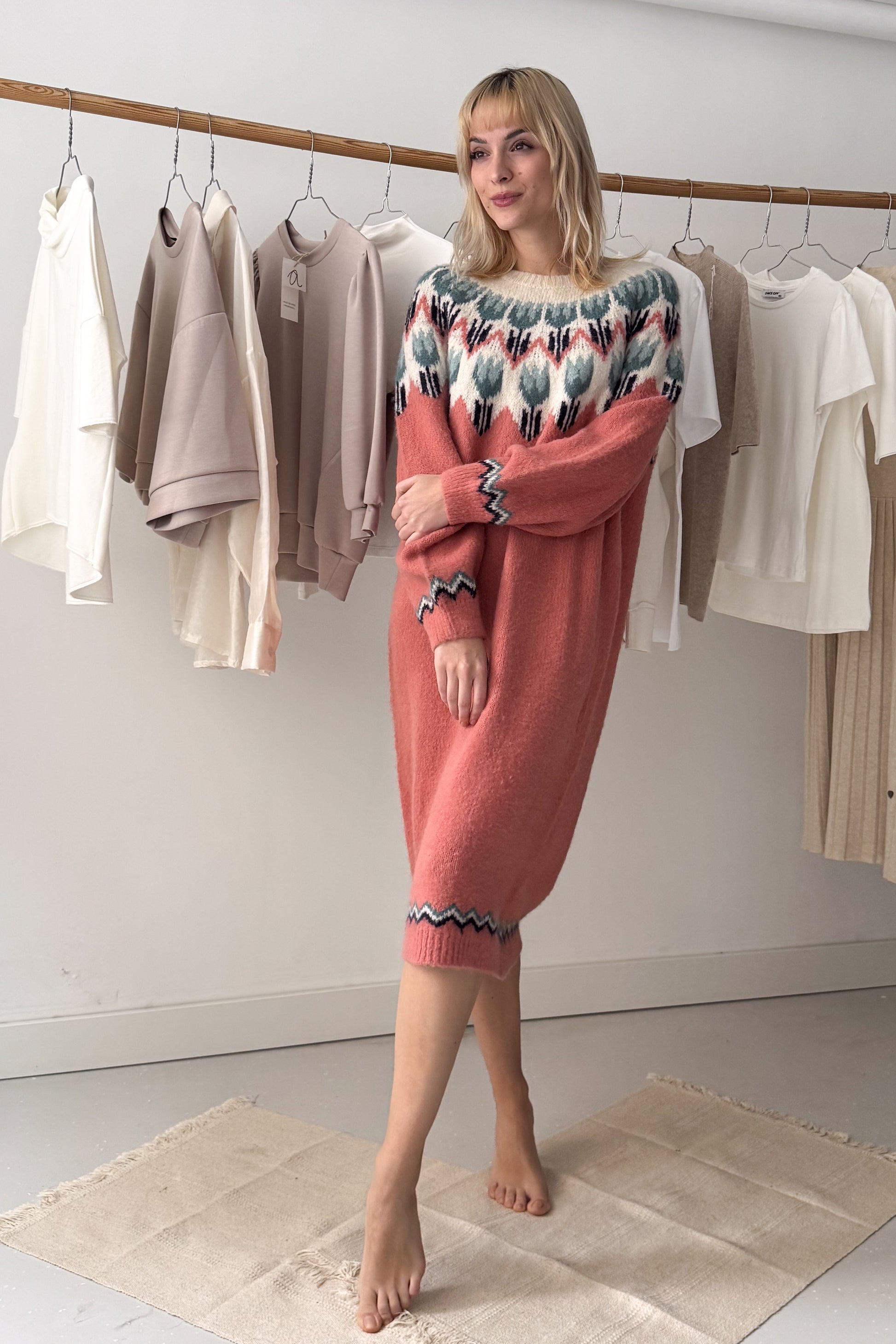 Kerek nyakú, hosszúujjú, lazac színű, mintás kötött ruha. Laza, midi fazon.