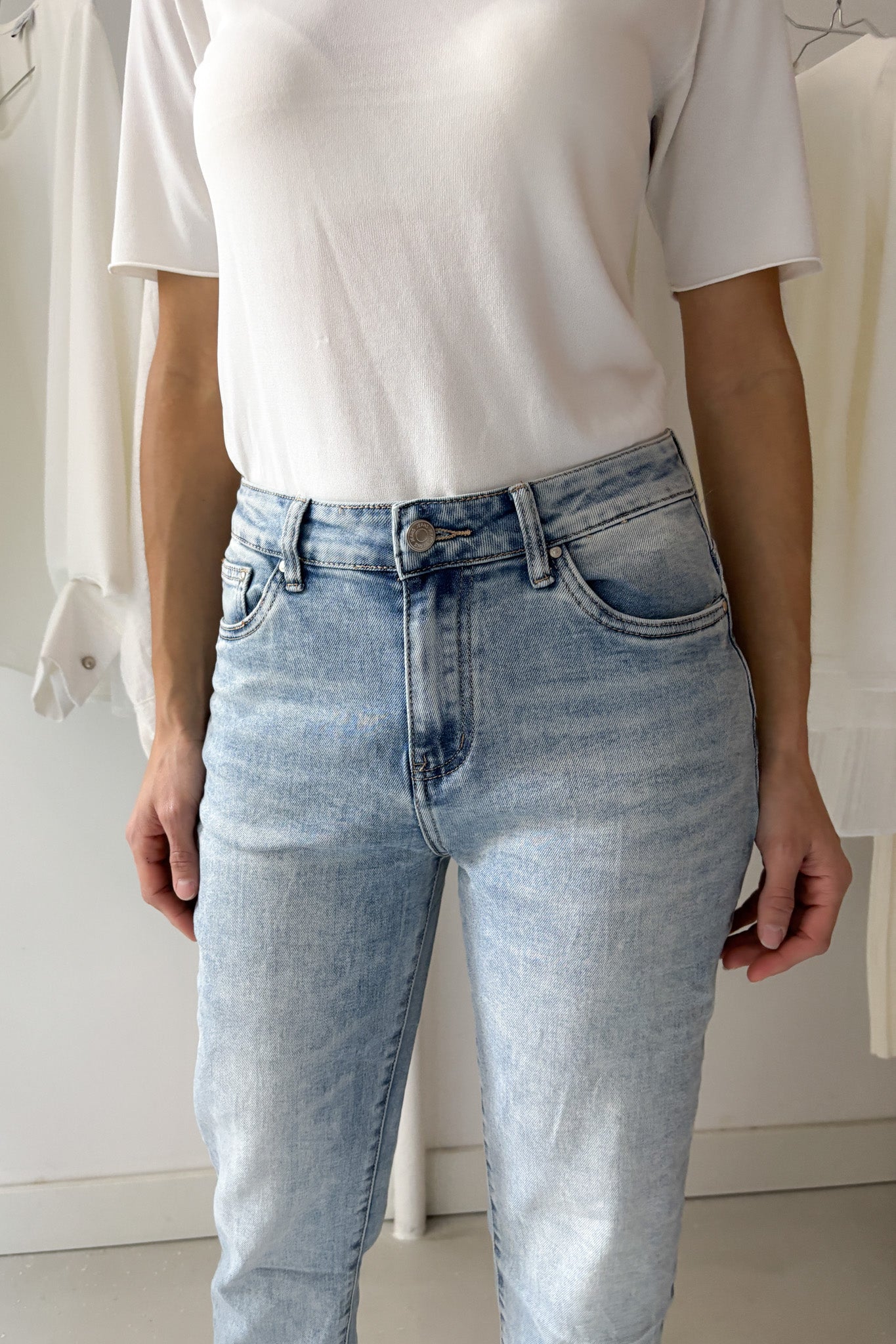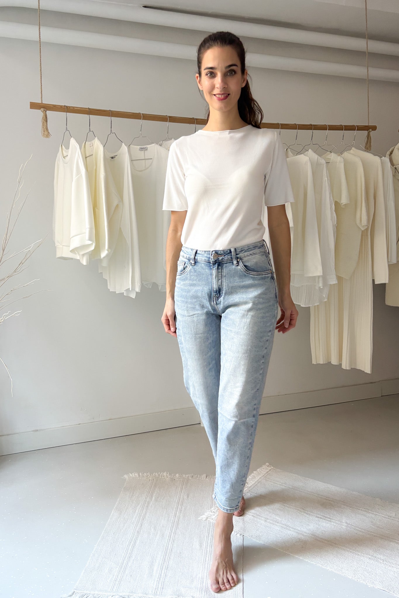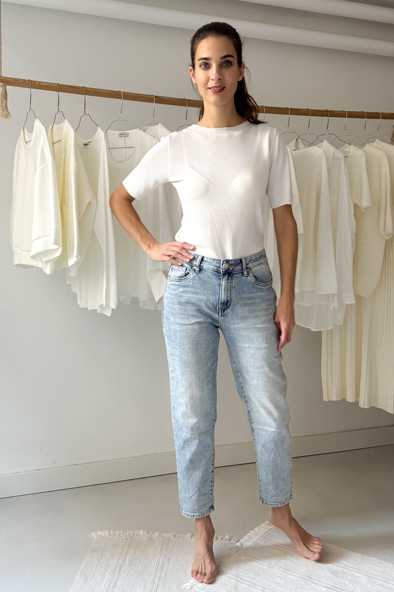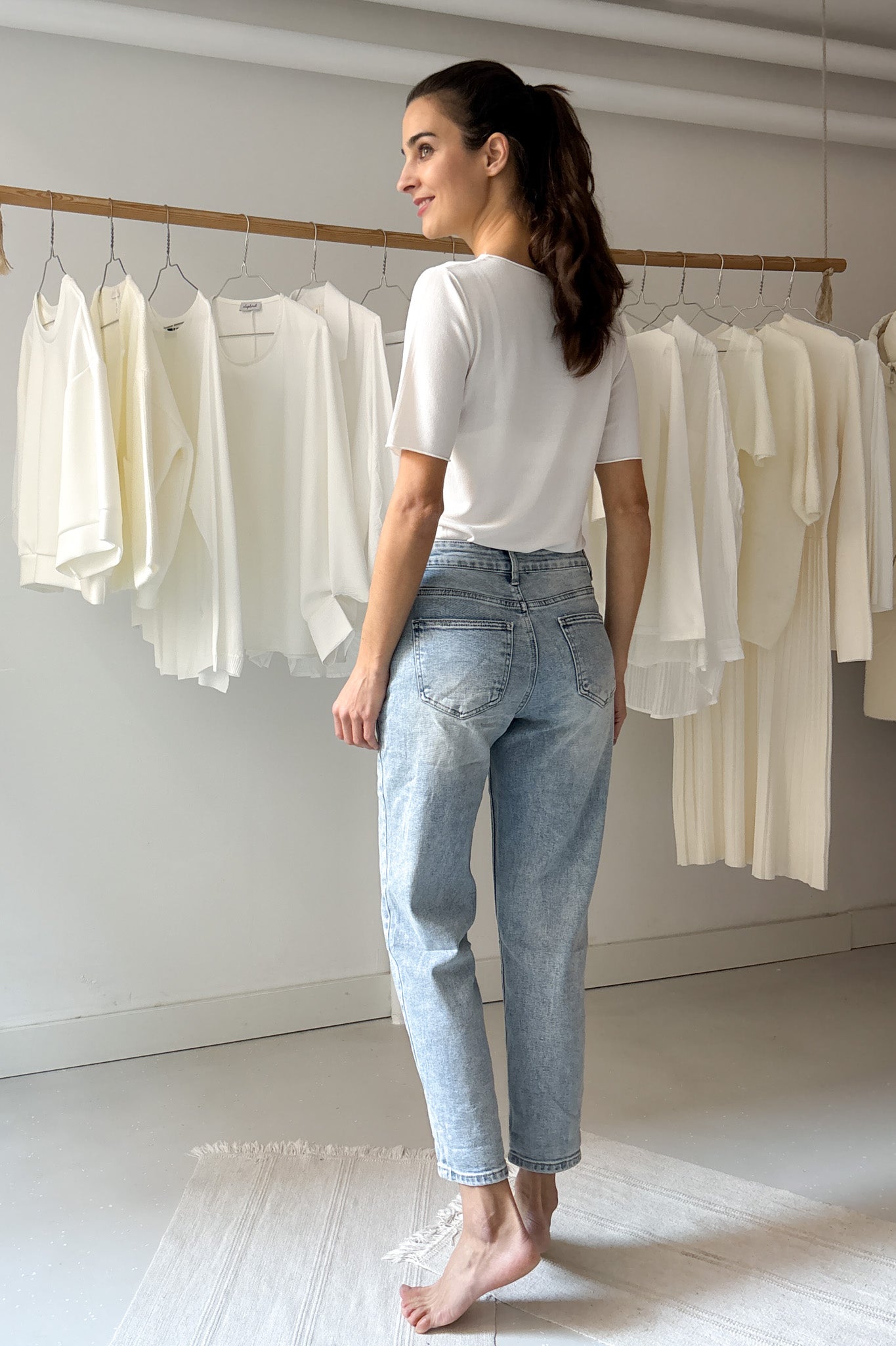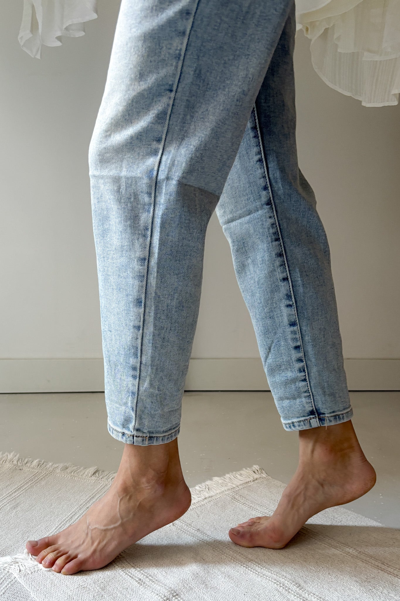 Laza, hétköznapi momfit farmer. Magasított derekú, elasztikus fazon.