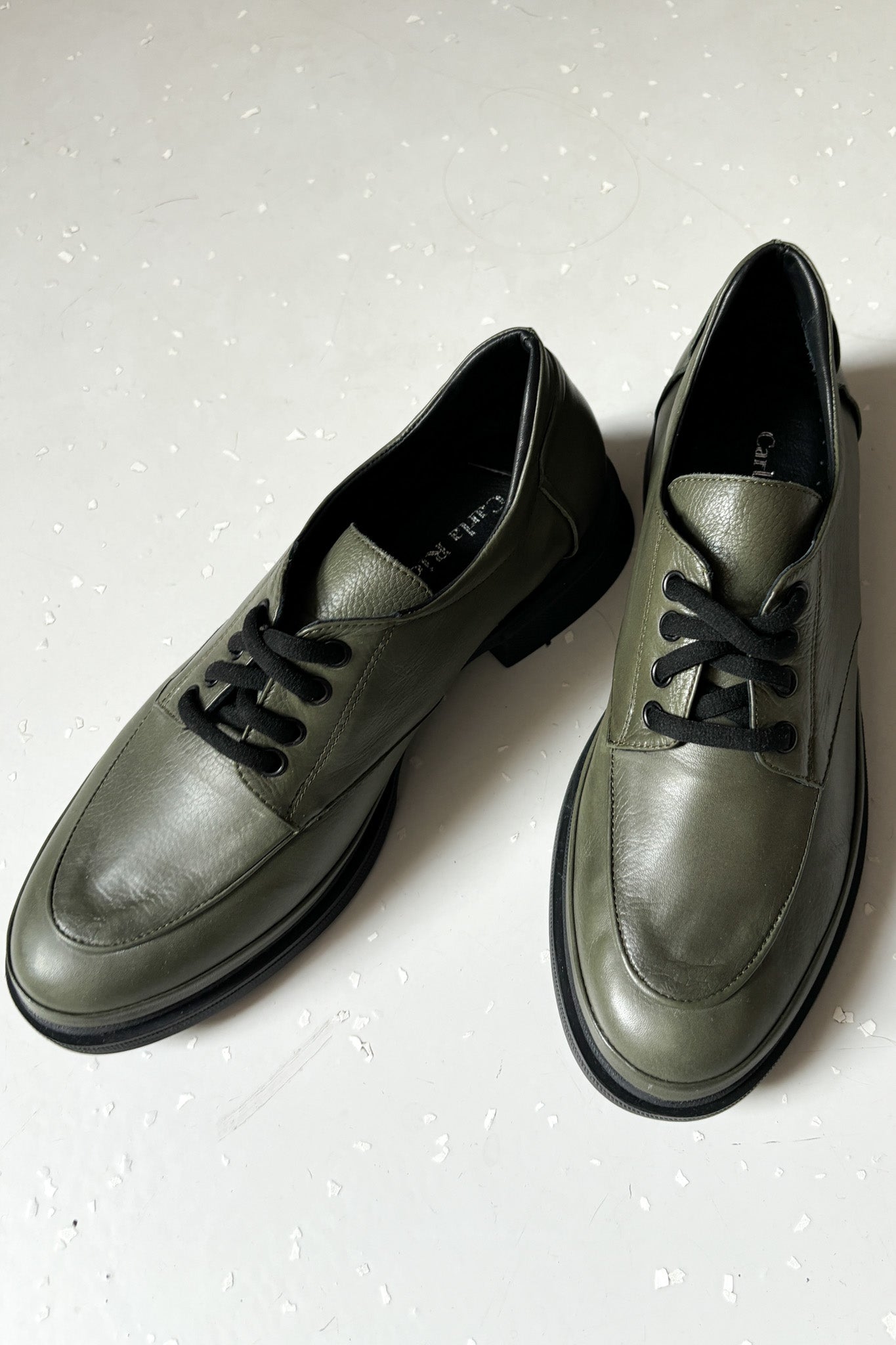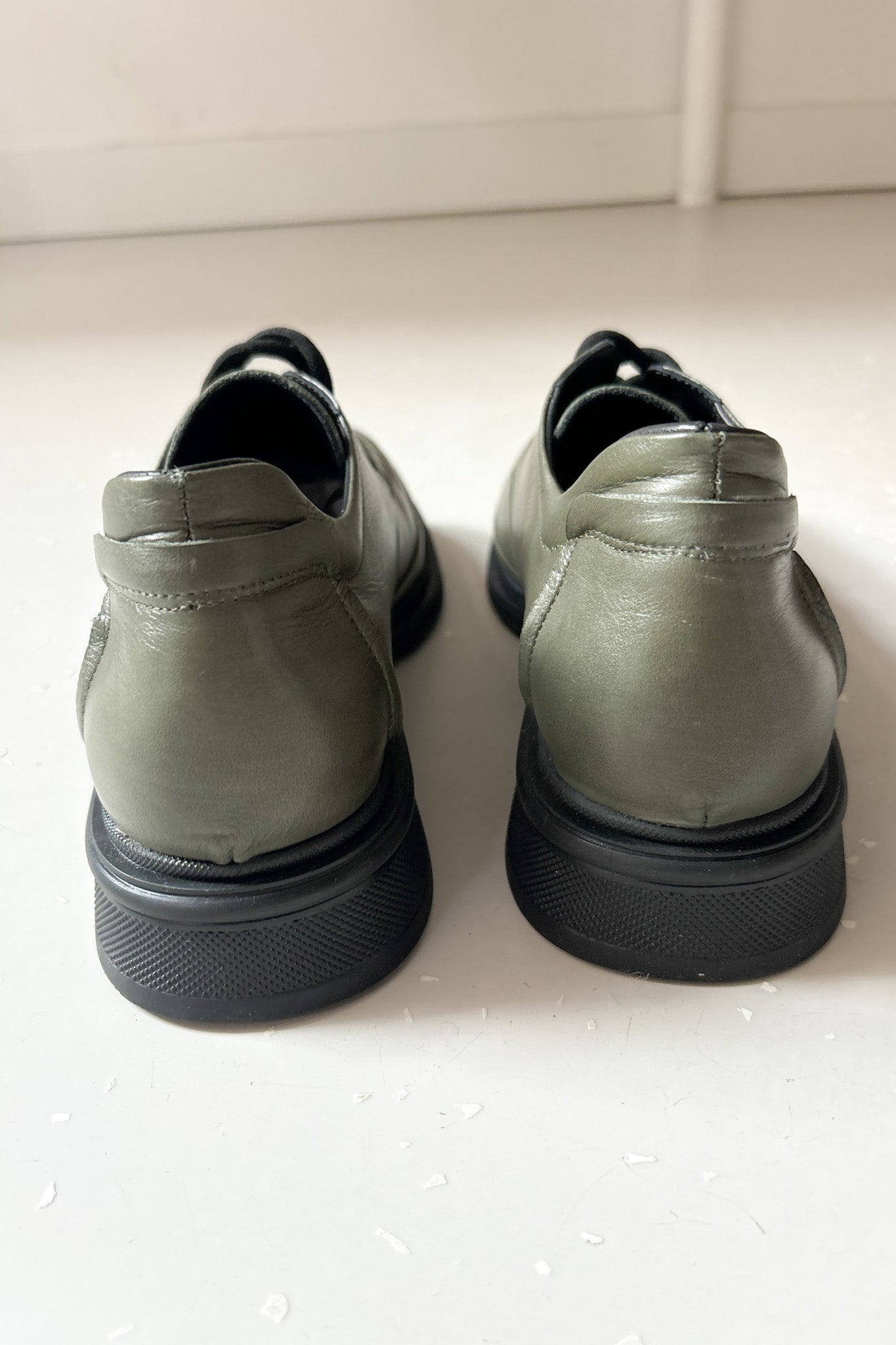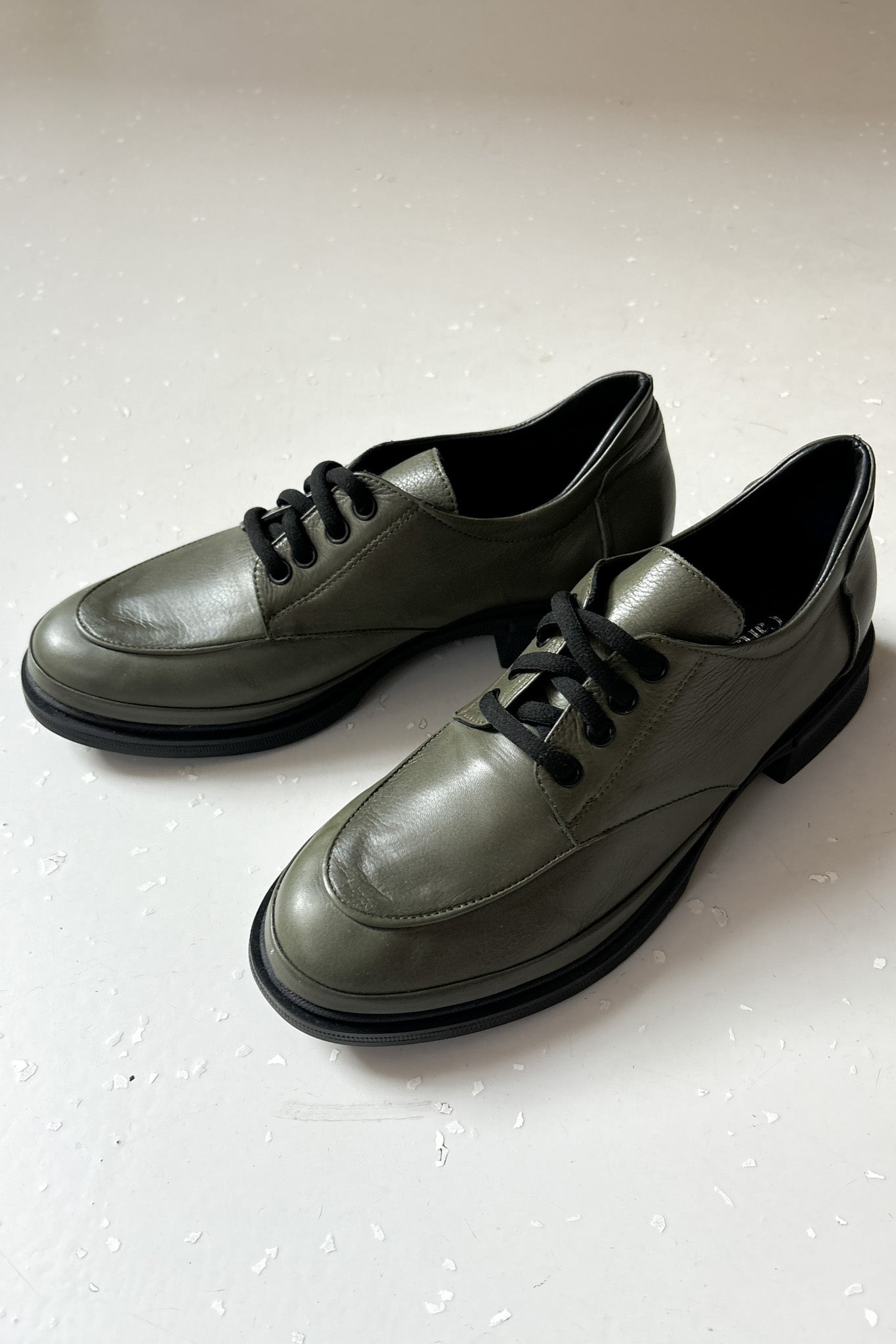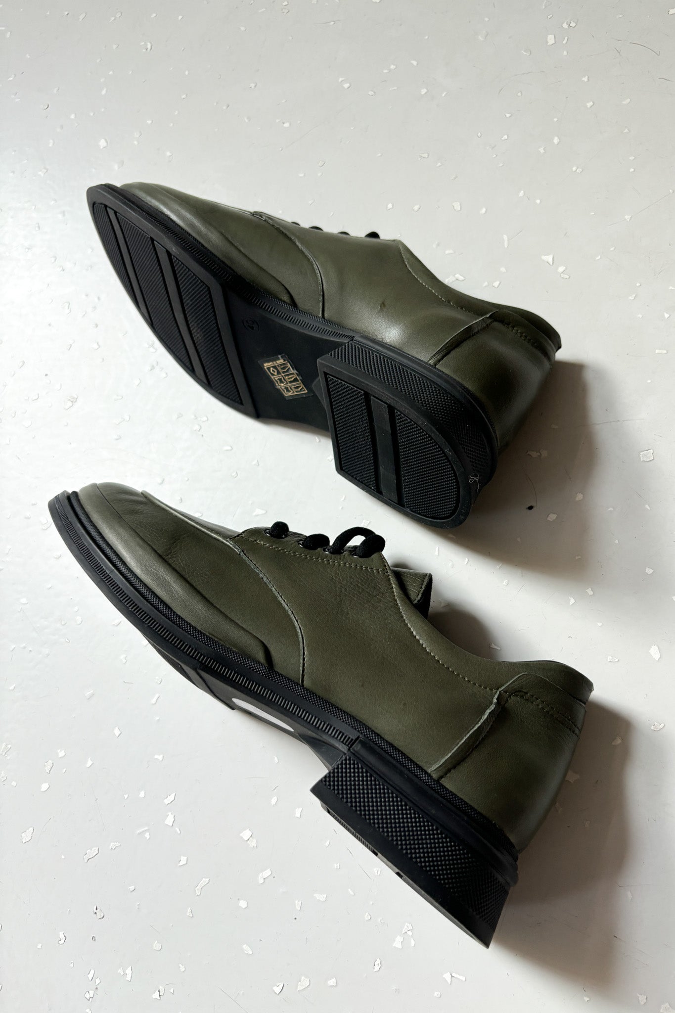 Vastag talpú, olajzöld félcipő. A fűző része rövidített. Puha, bőrből készült.