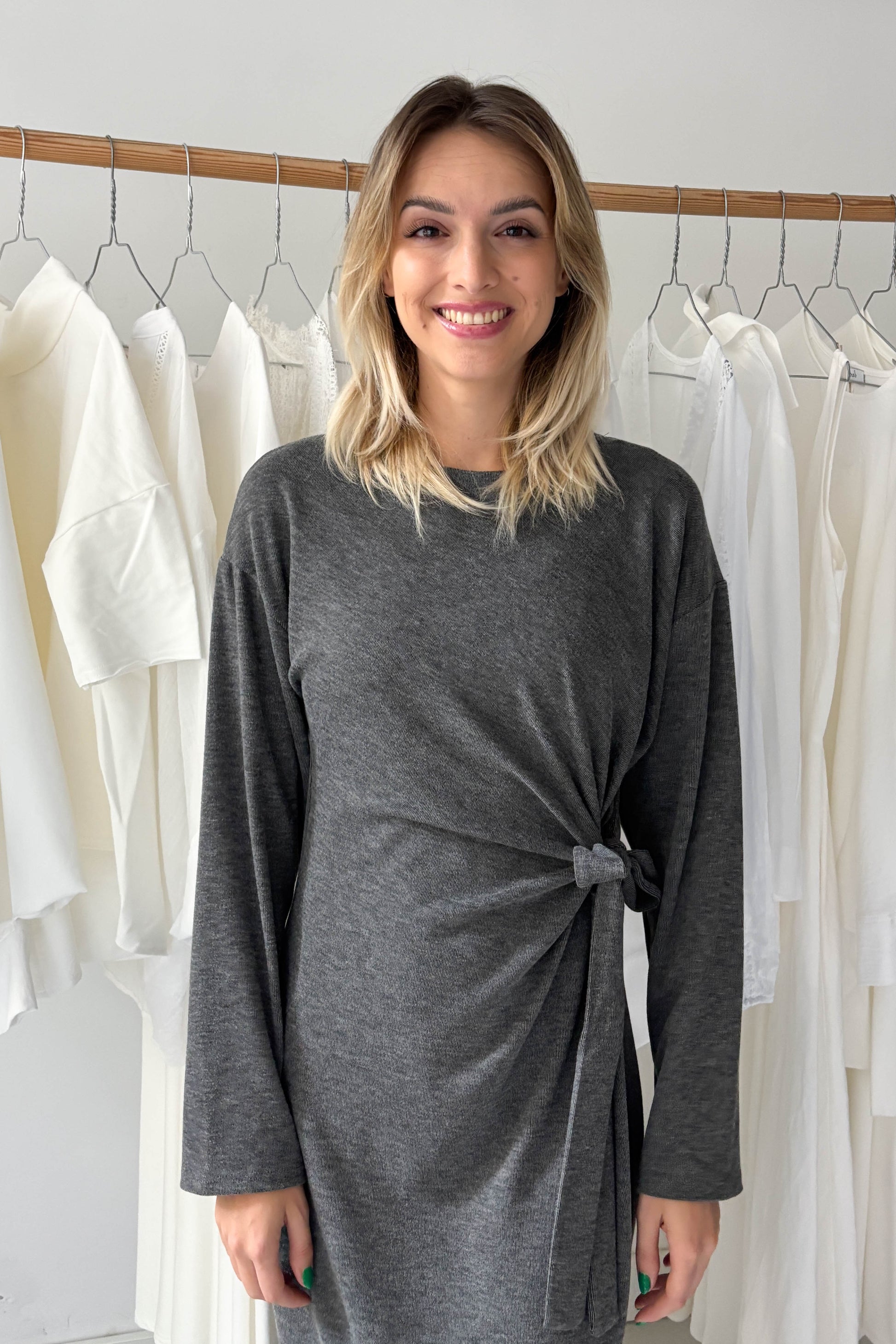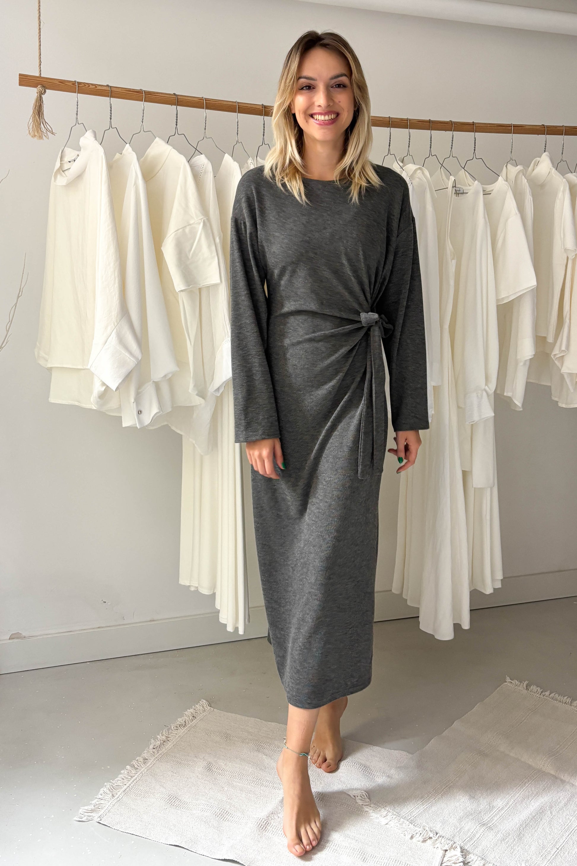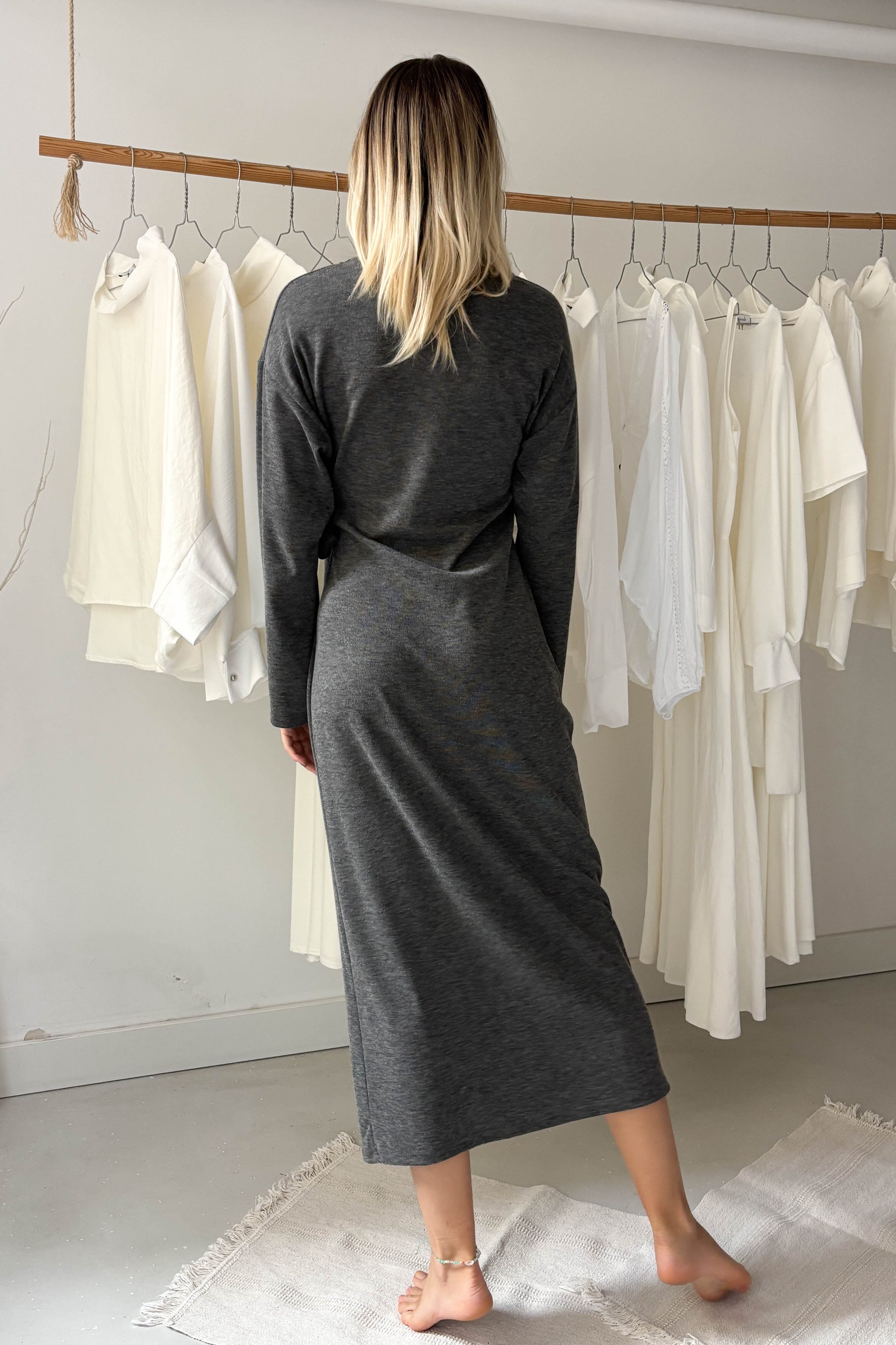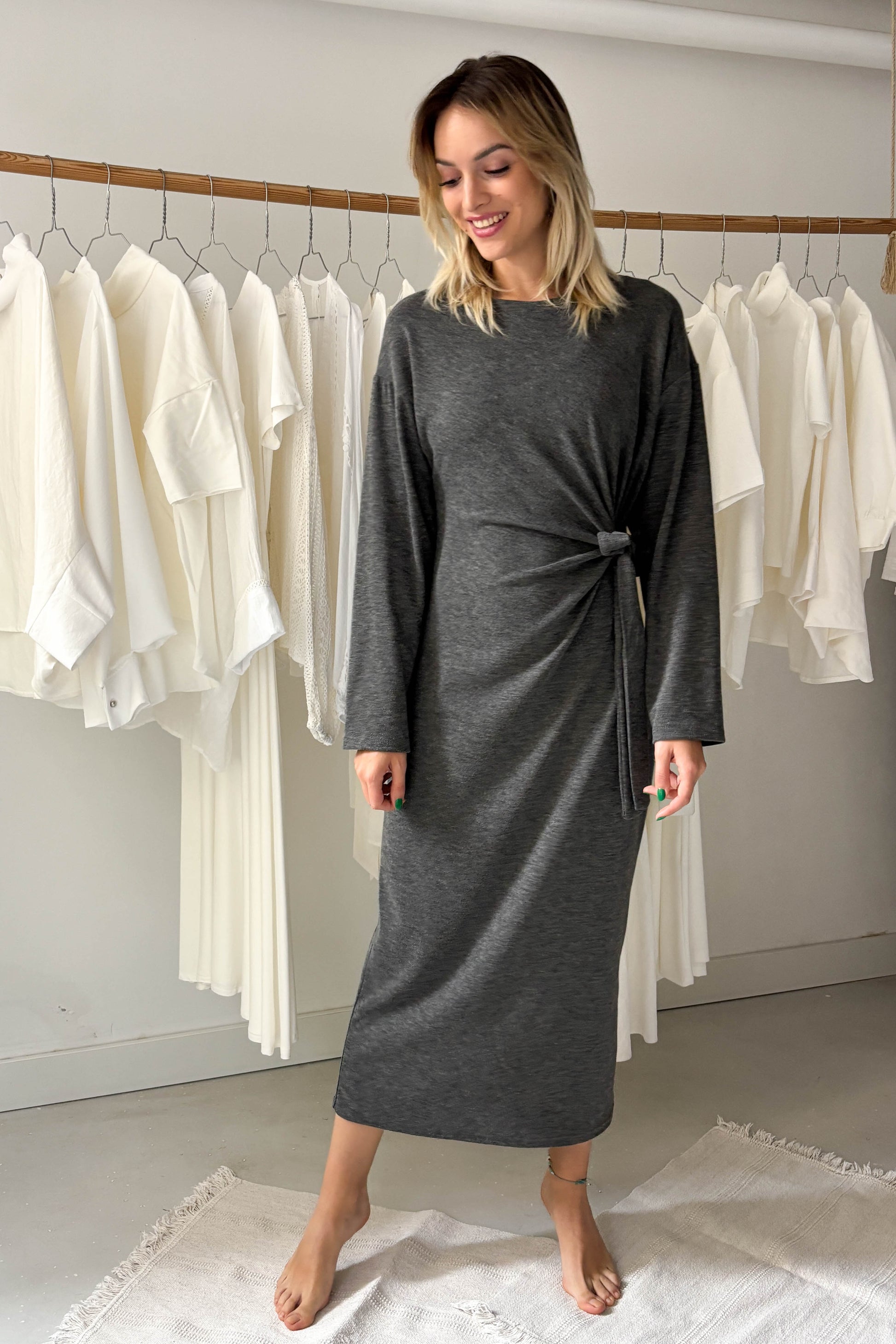 Szürke, puha anyagú, hosszúujjú, kereknyakú, hosszú ruha. A derékrészen egy ruhával egybeszabott megkötővel van ellátva, amely oldalt megkötve, kiemeli az alakot.