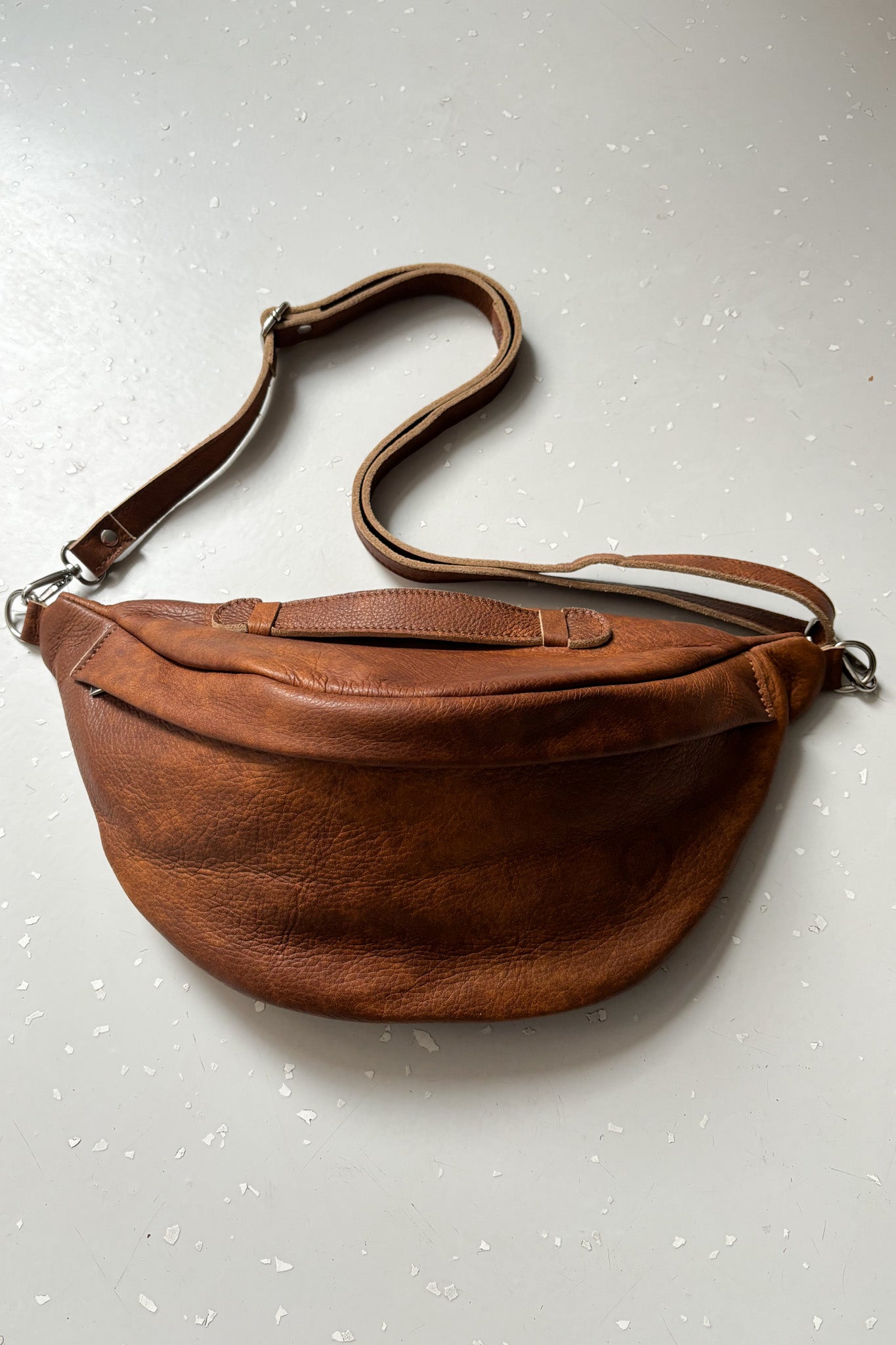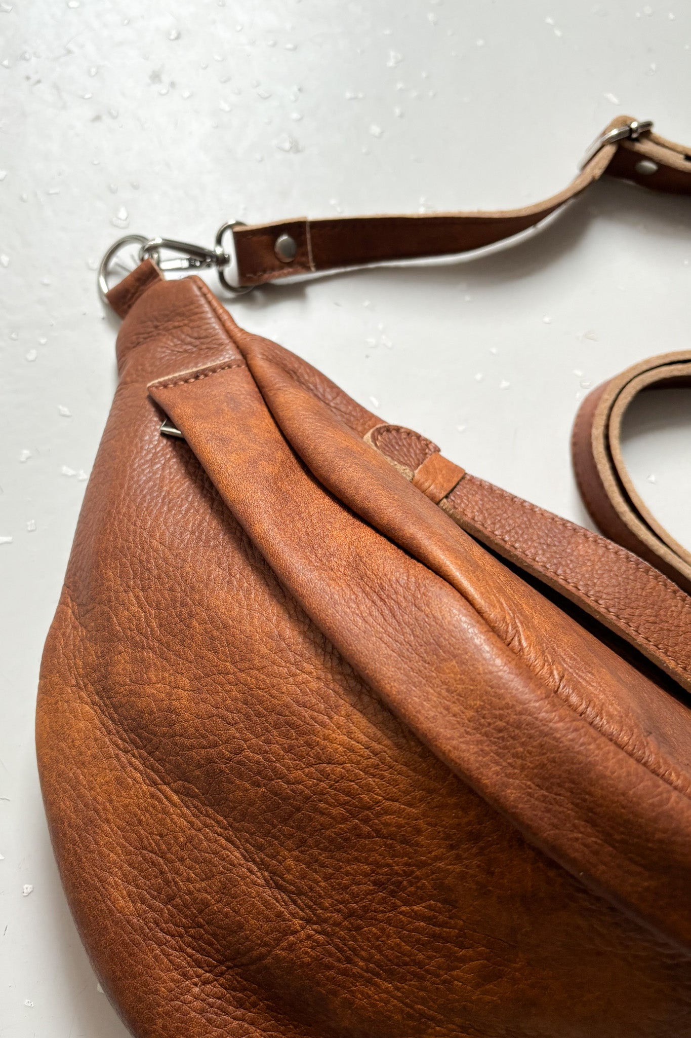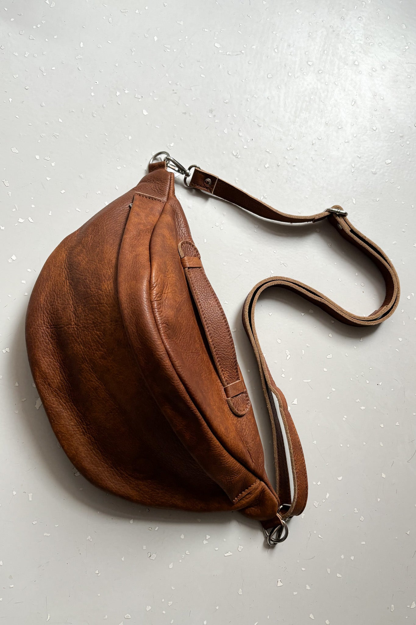 Nagy méretű, kézzel készített táska marhabőrből. Állítható/lecsatolható pánttal. Fakkjai cipzárral záródnak.