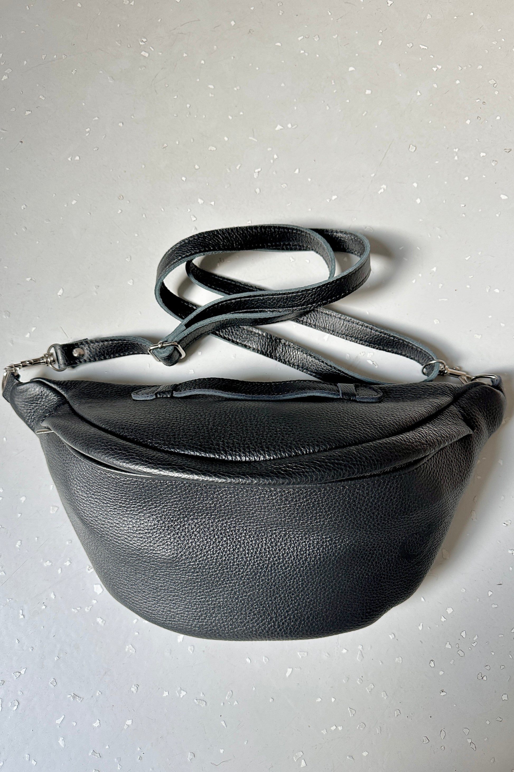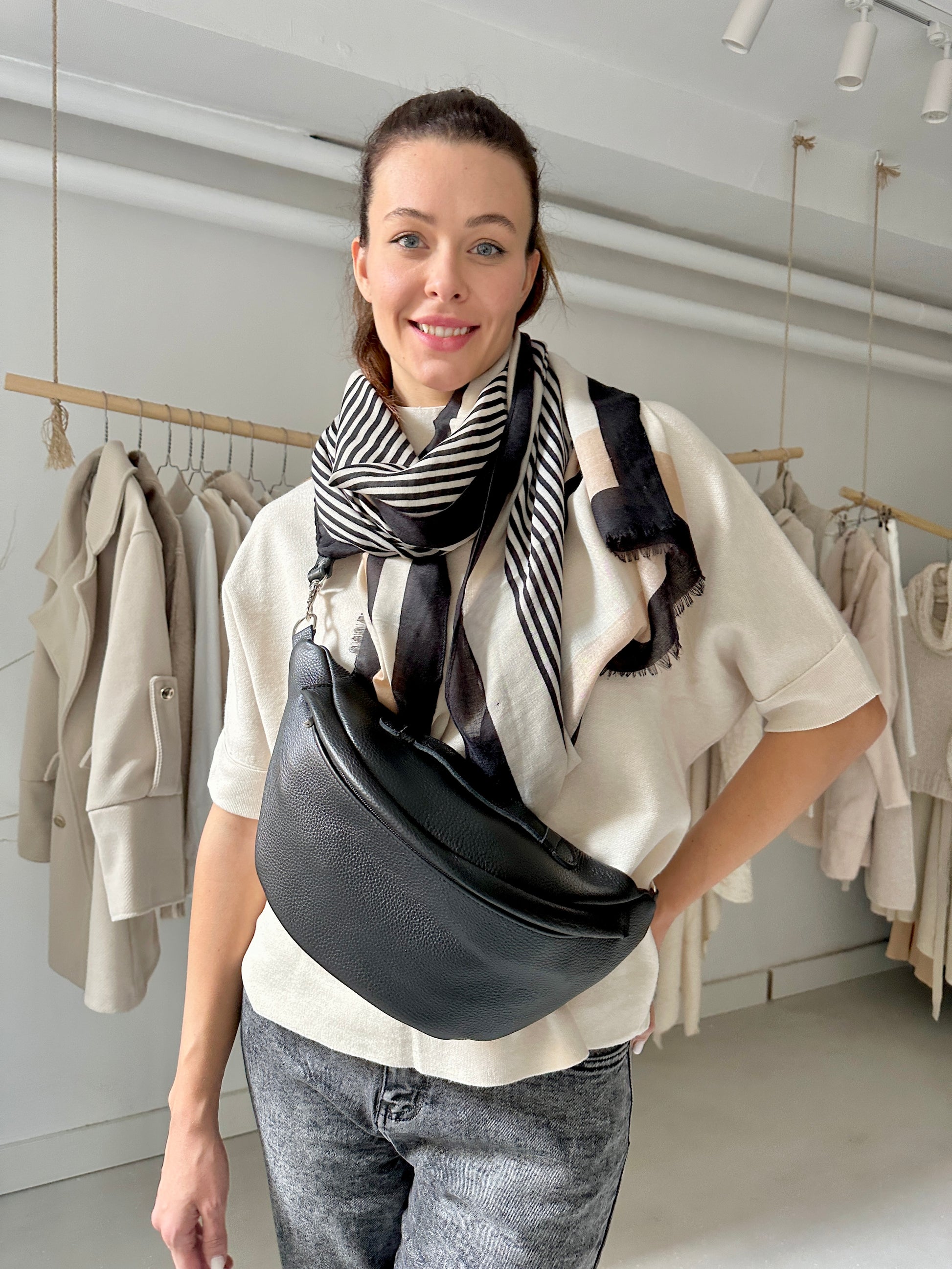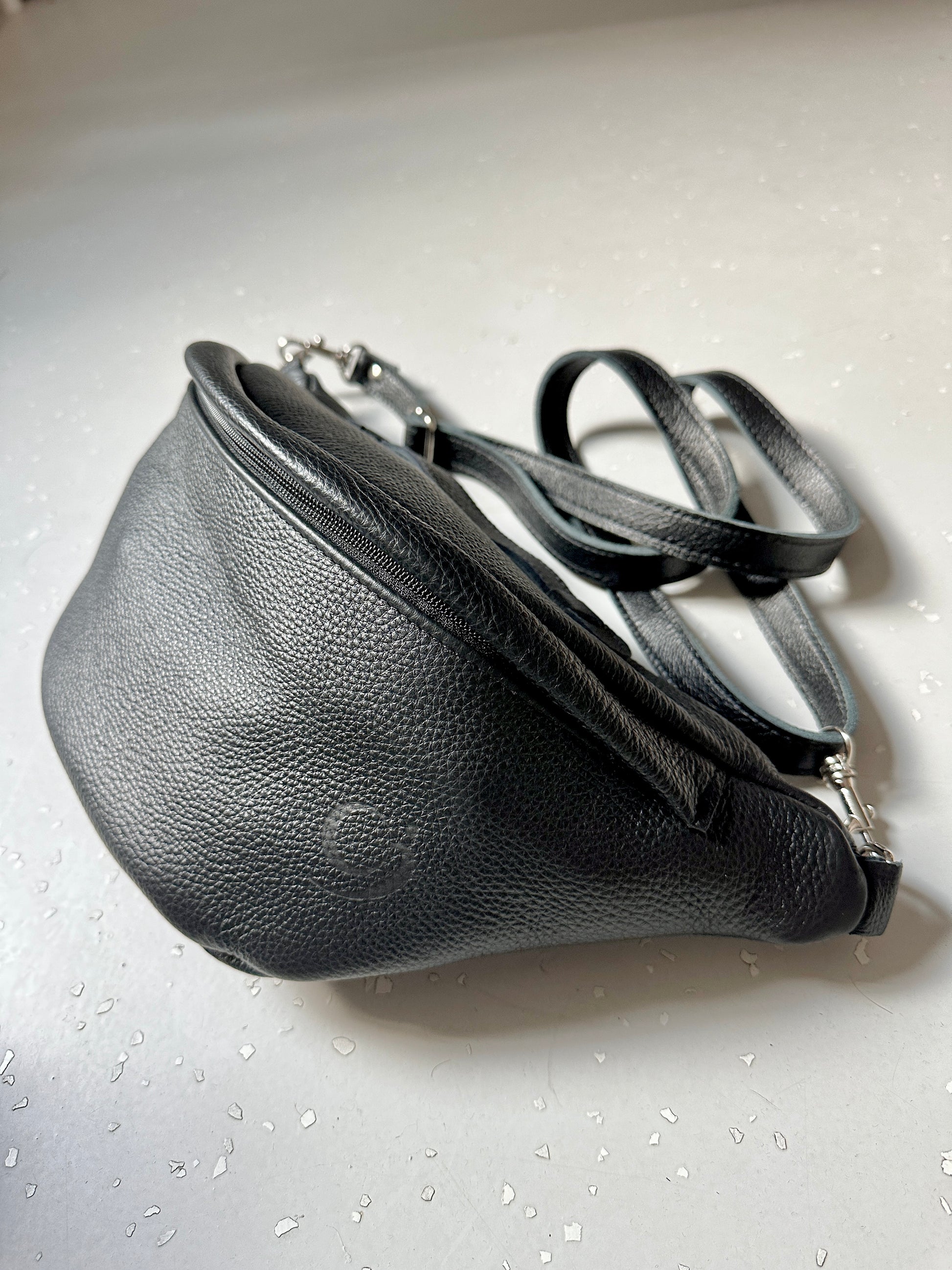 Nagy méretű, kézzel készített táska marhabőrből. Állítható/lecsatolható pánttal. Fakkjai cipzárral záródnak.
