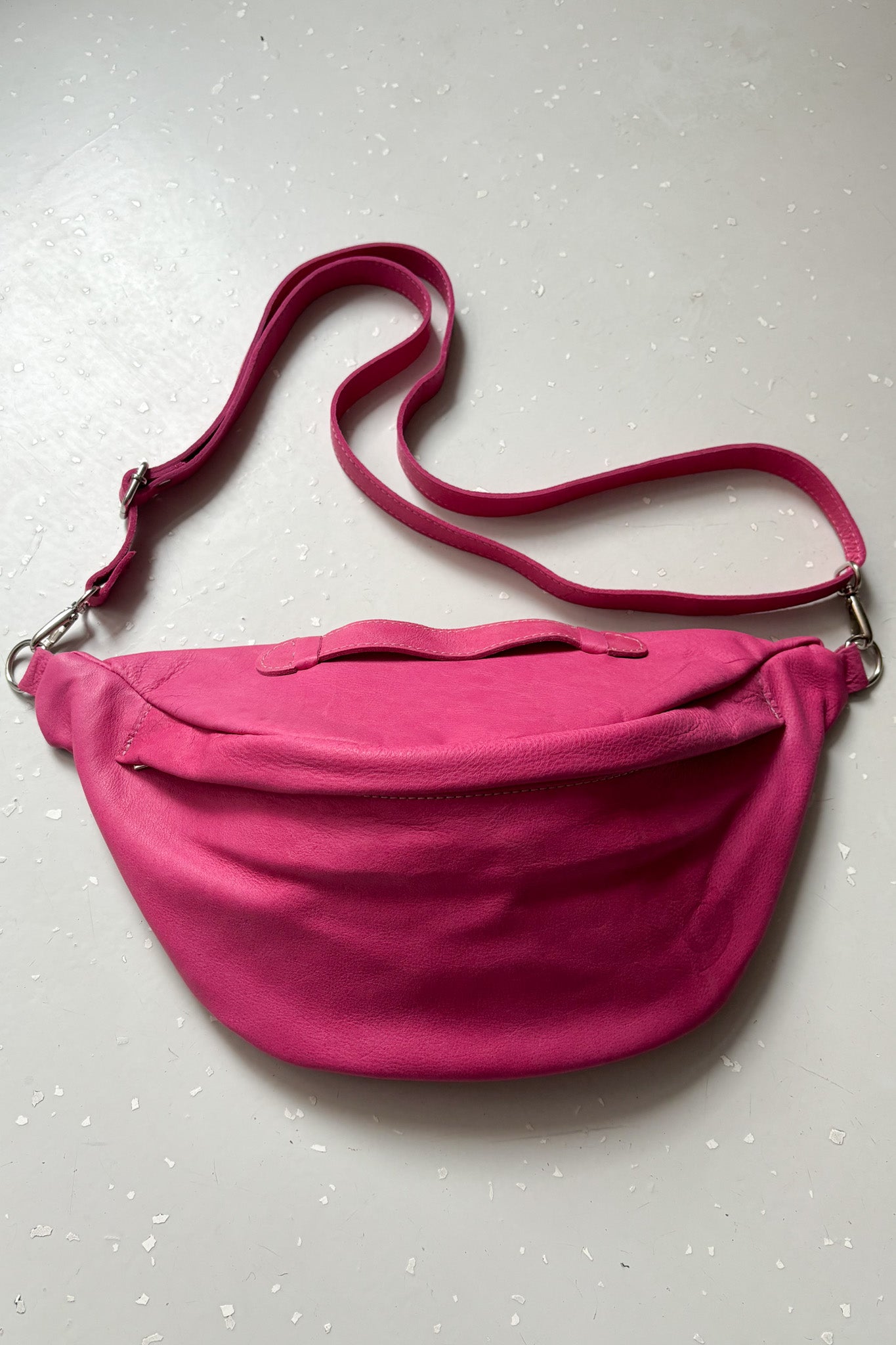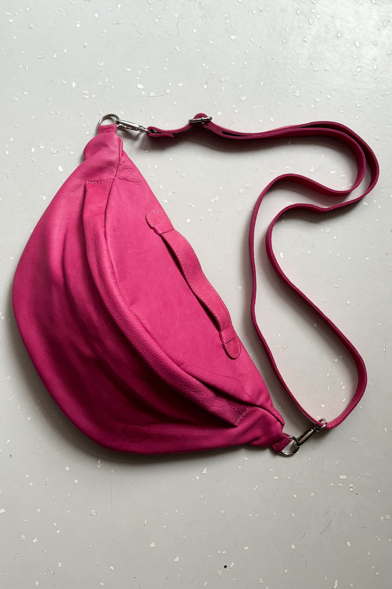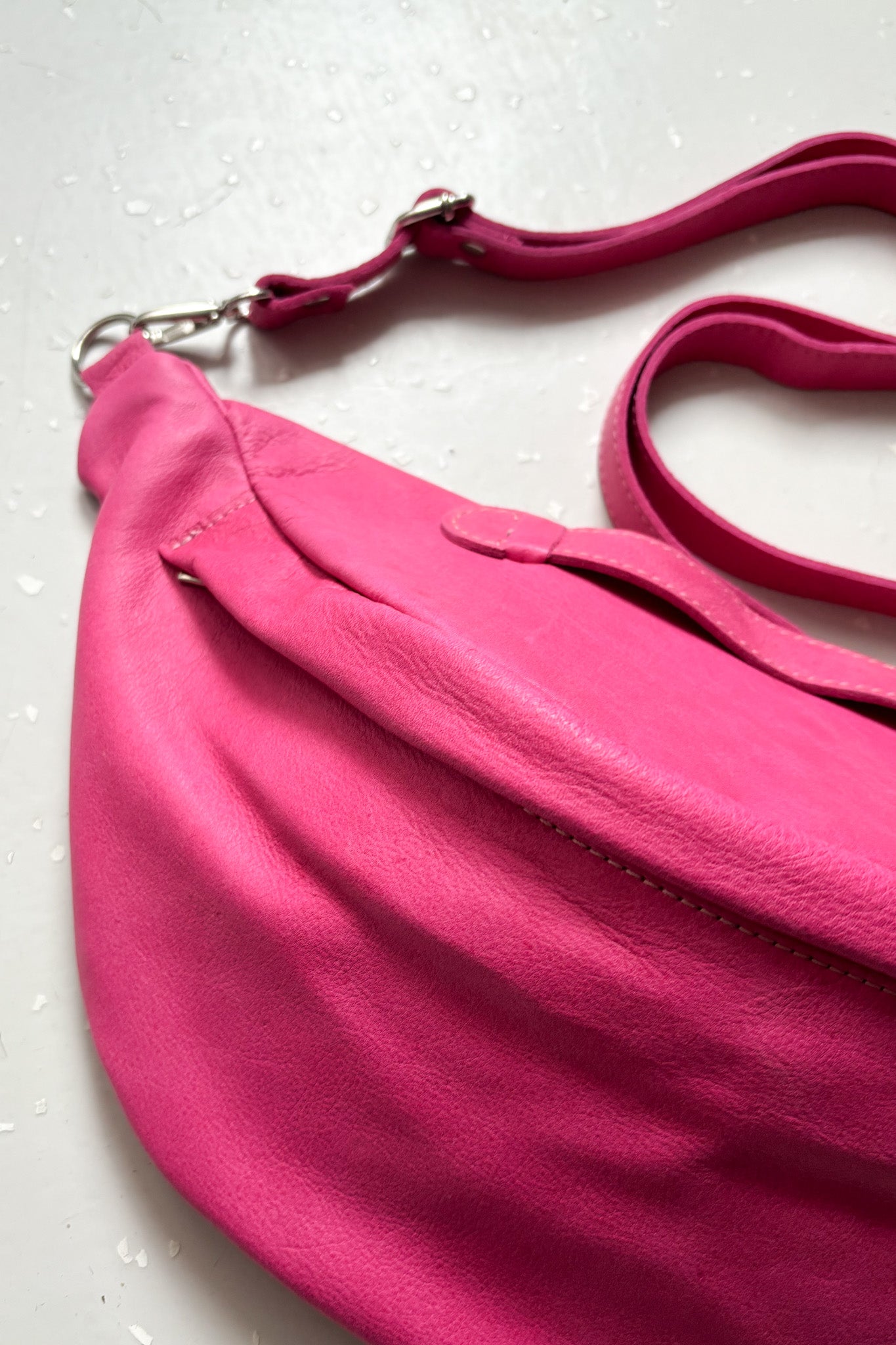 Nagy méretű, kézzel készített táska marhabőrből. Állítható/lecsatolható pánttal. Fakkjai cipzárral záródnak.