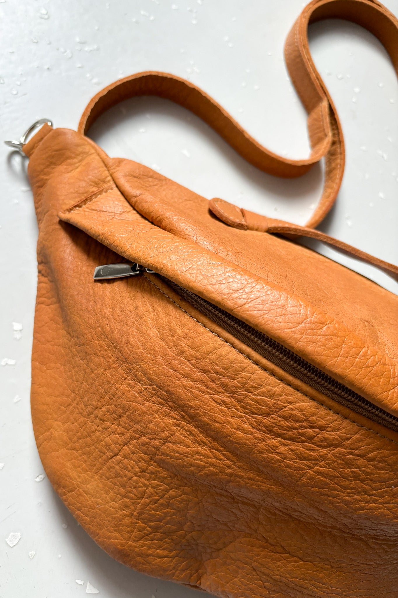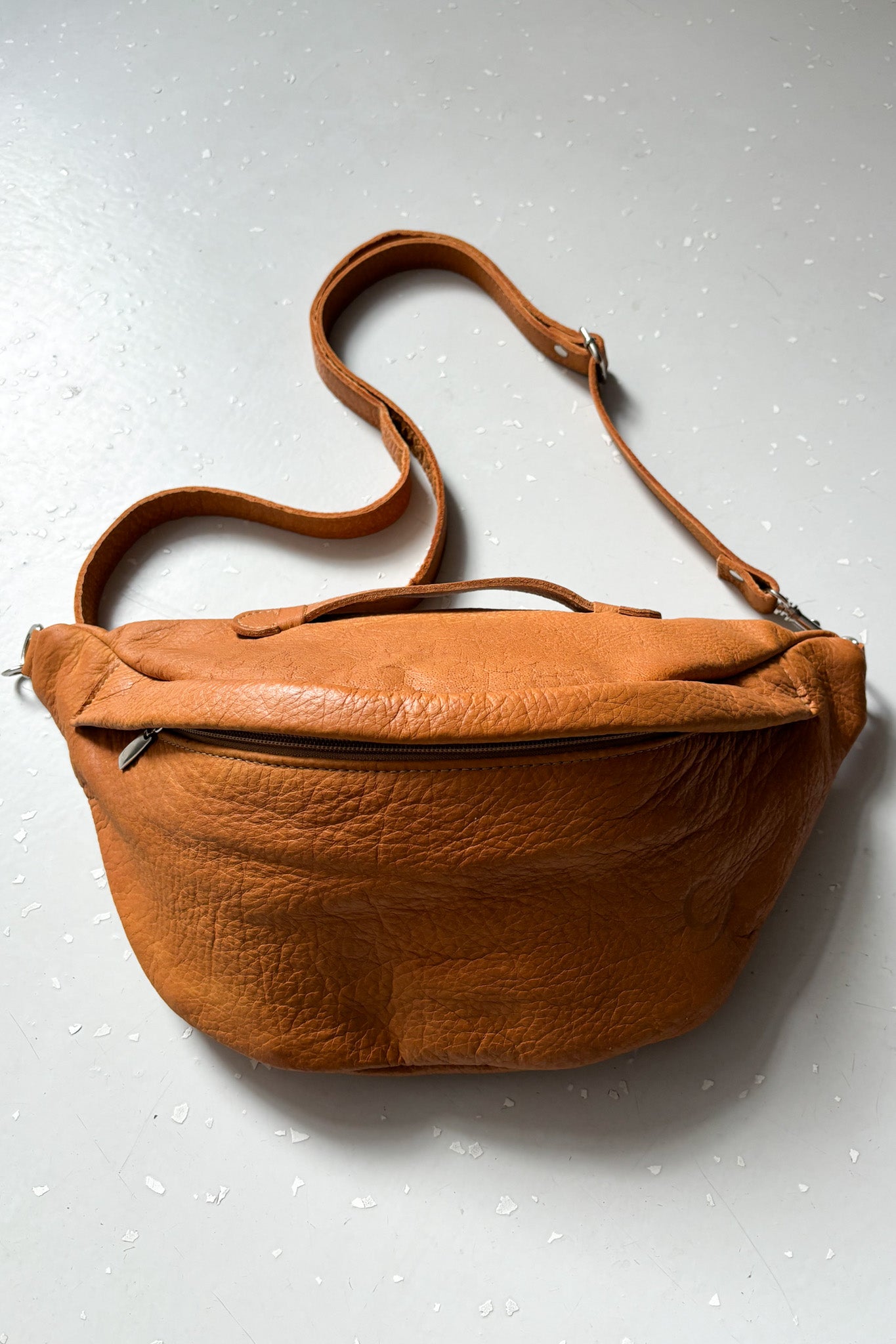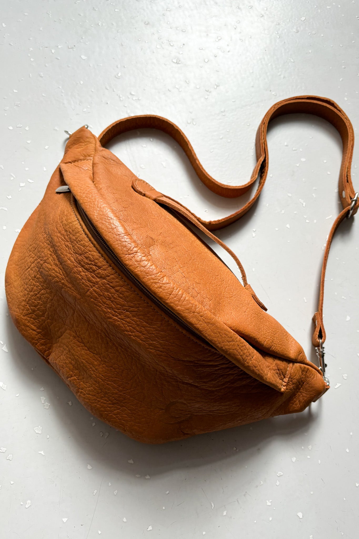 Nagy méretű, kézzel készített táska marhabőrből. Állítható/lecsatolható pánttal. Fakkjai cipzárral záródnak.