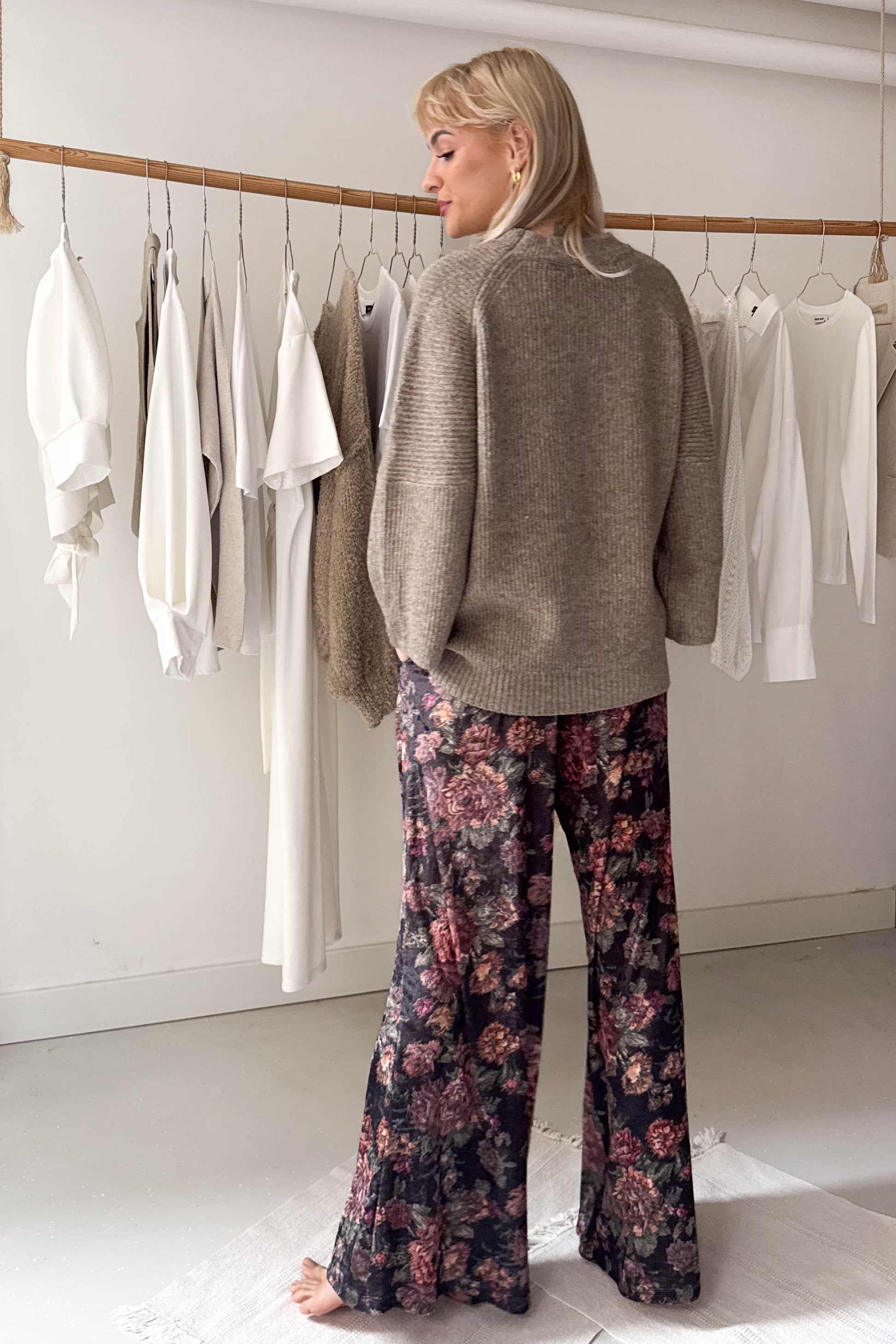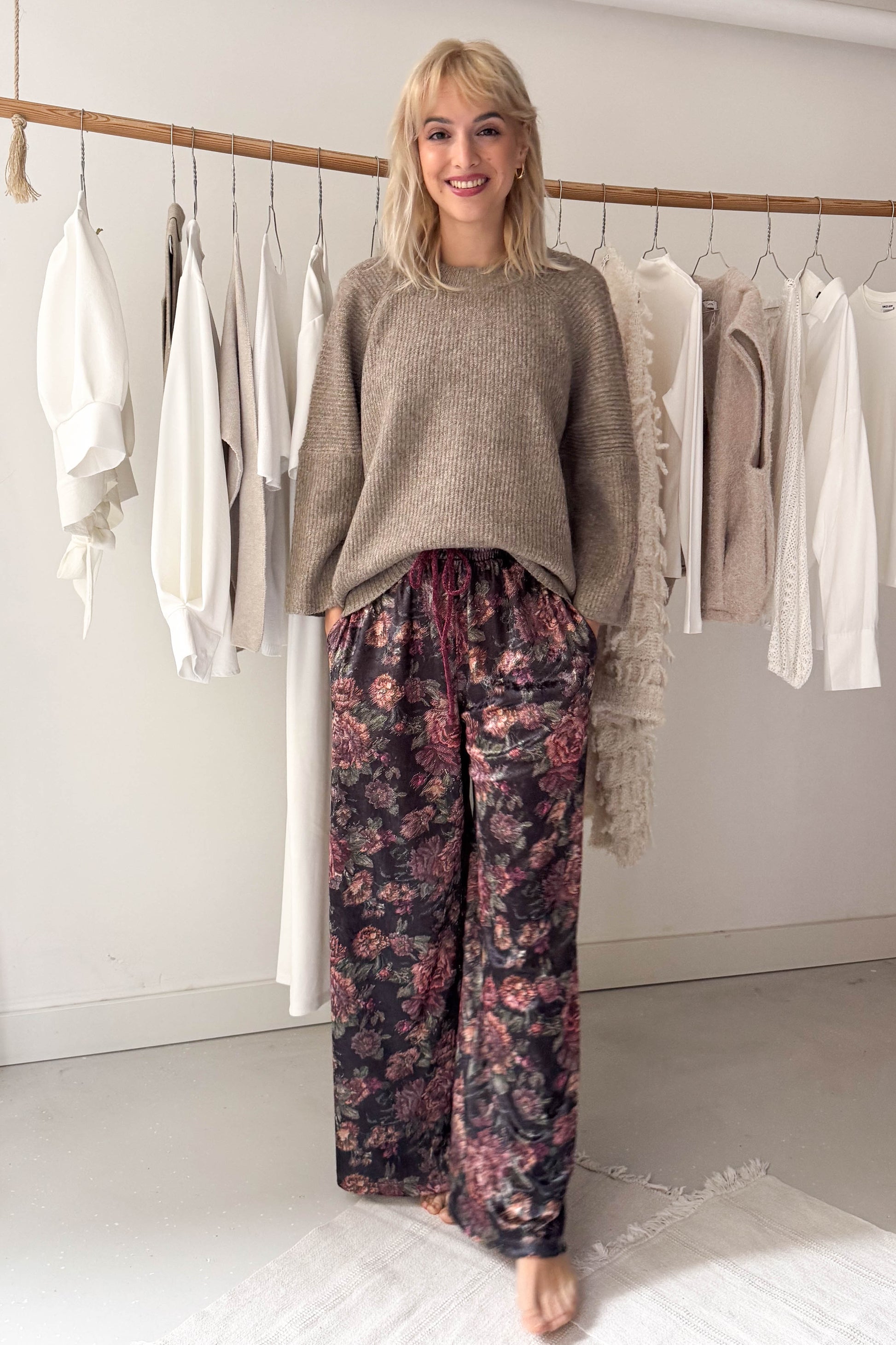 Kerek nyakú, ejtett vállú, széles ujjú, oversize kötött pulcsi, makadámdió színben. A nyakkivágás és az alja passzés. A hátulja enyhén hosszabb.