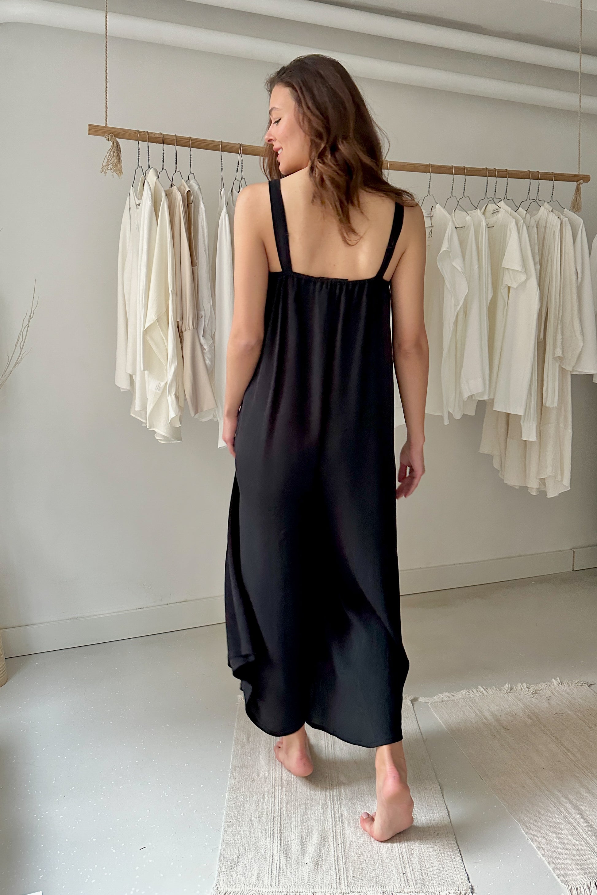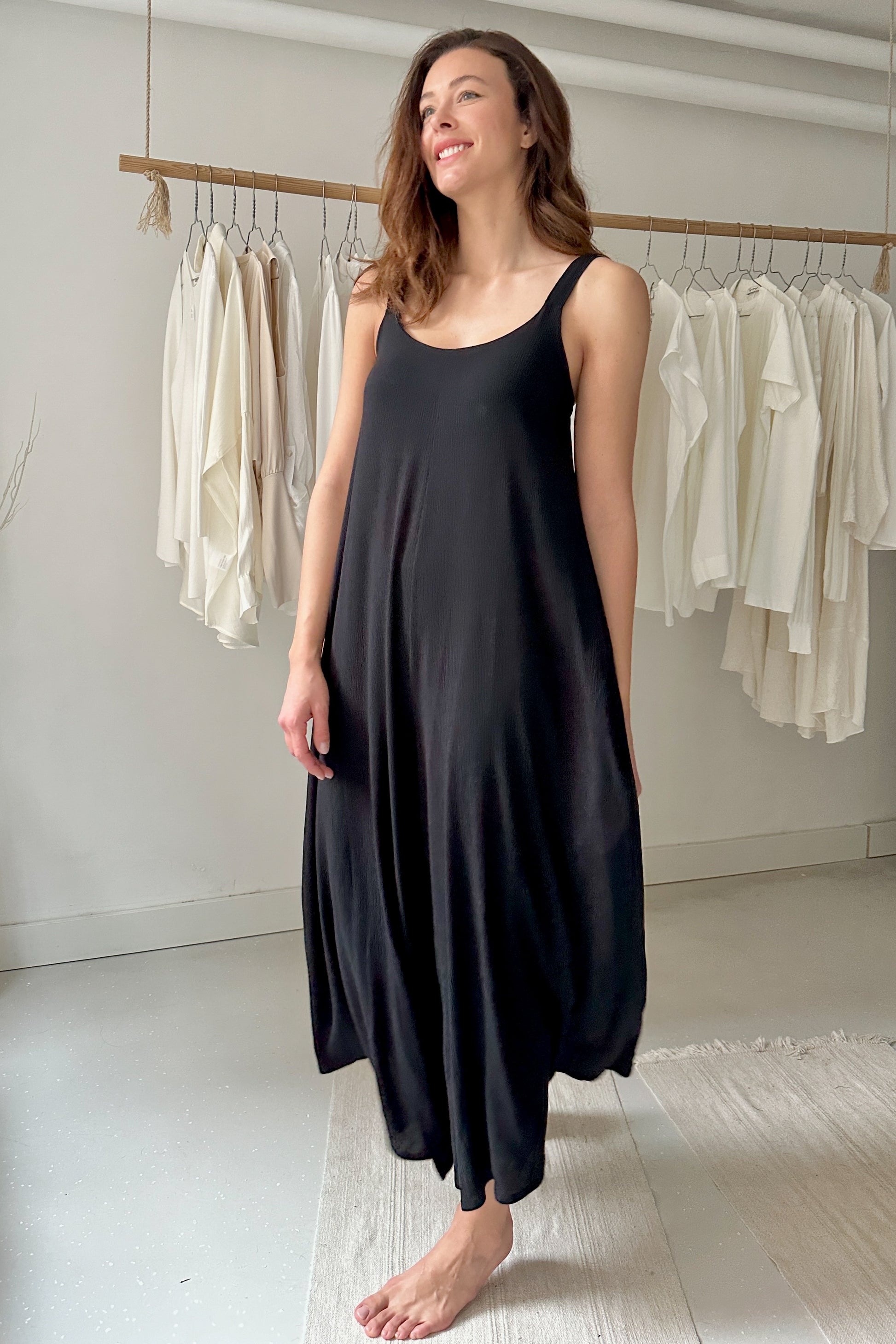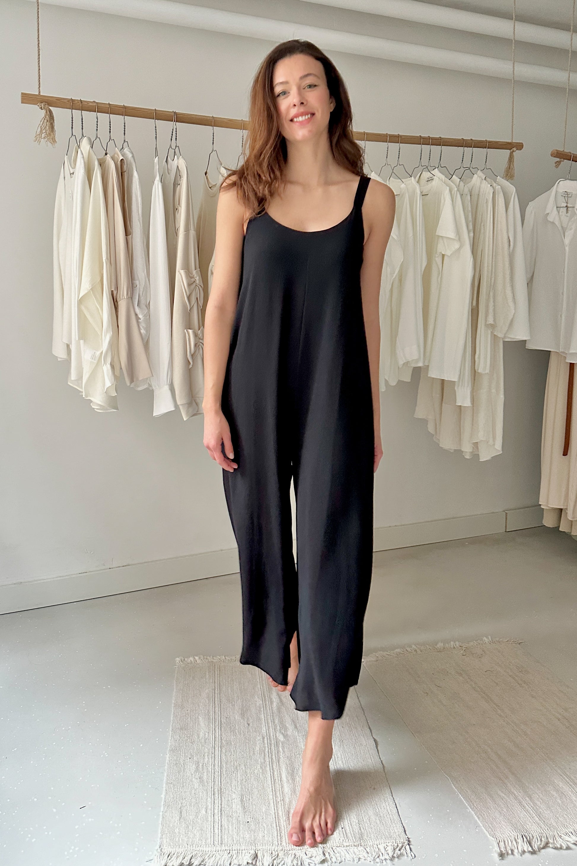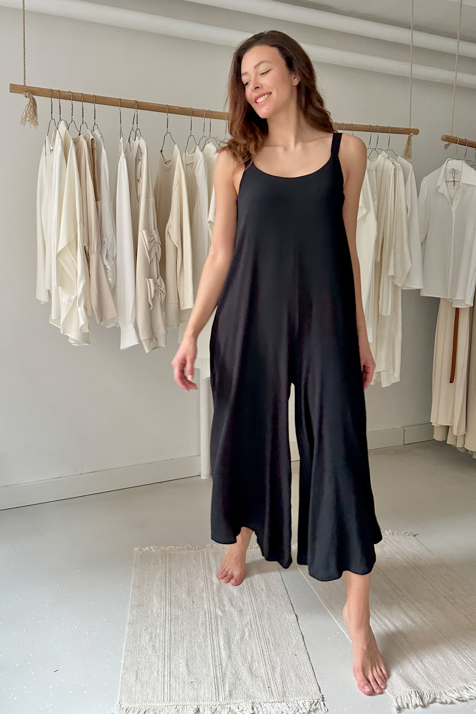 Enyhén gyűrt hatású, 100% viszkóz anyagból készült egyméretes overál. Lenge, bő fazon, széles pánttal, hátul gumírozással. 34-38-as konfekcióméretig ajánljuk. Csak kézi mosással mosható.