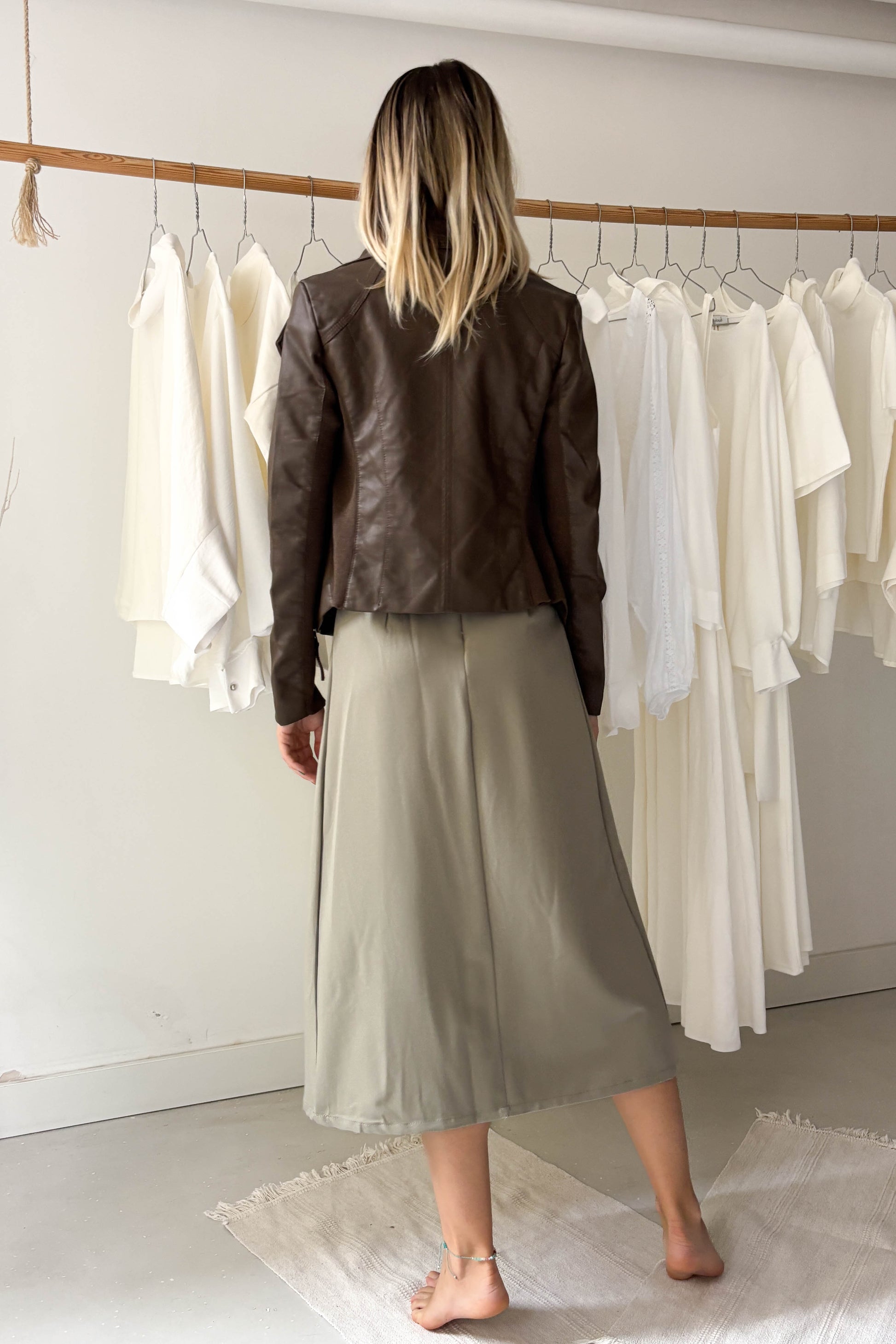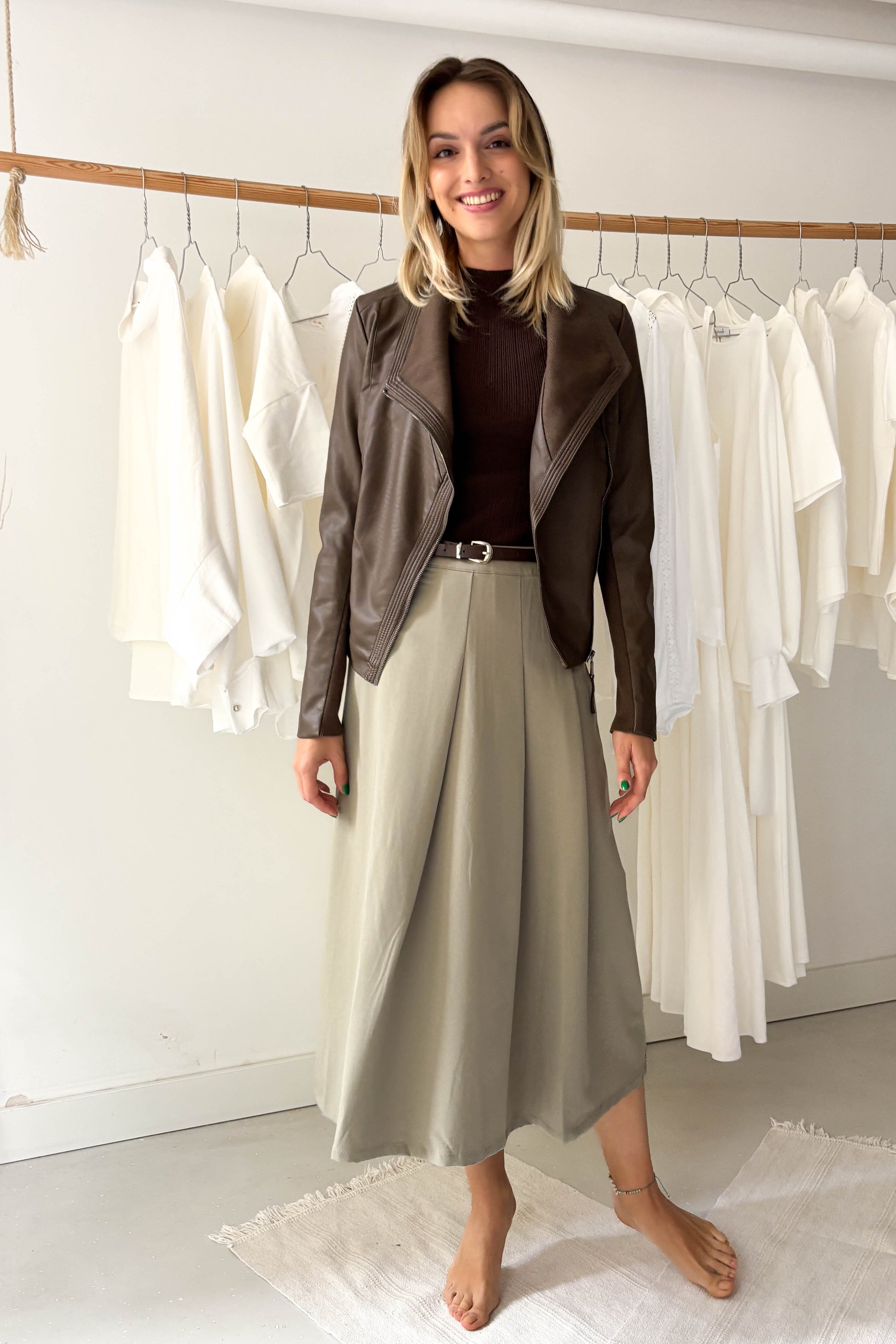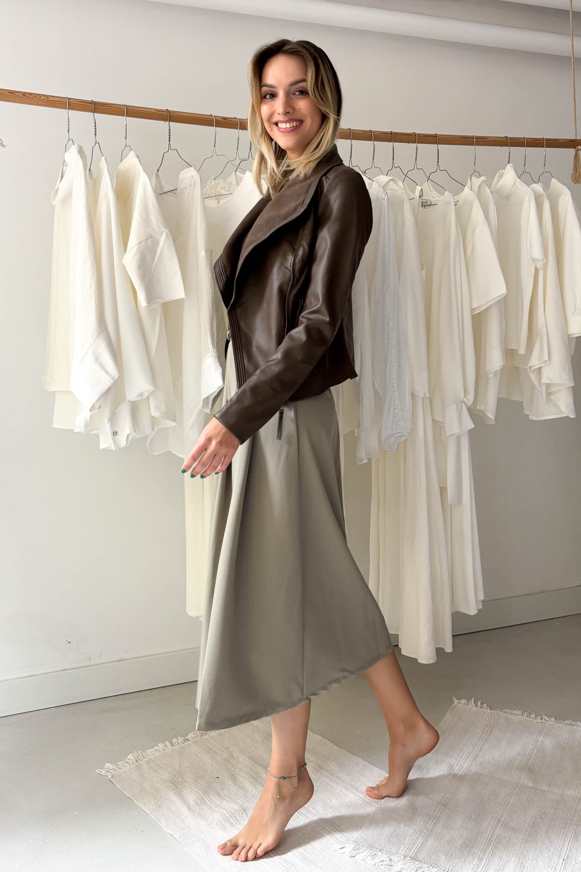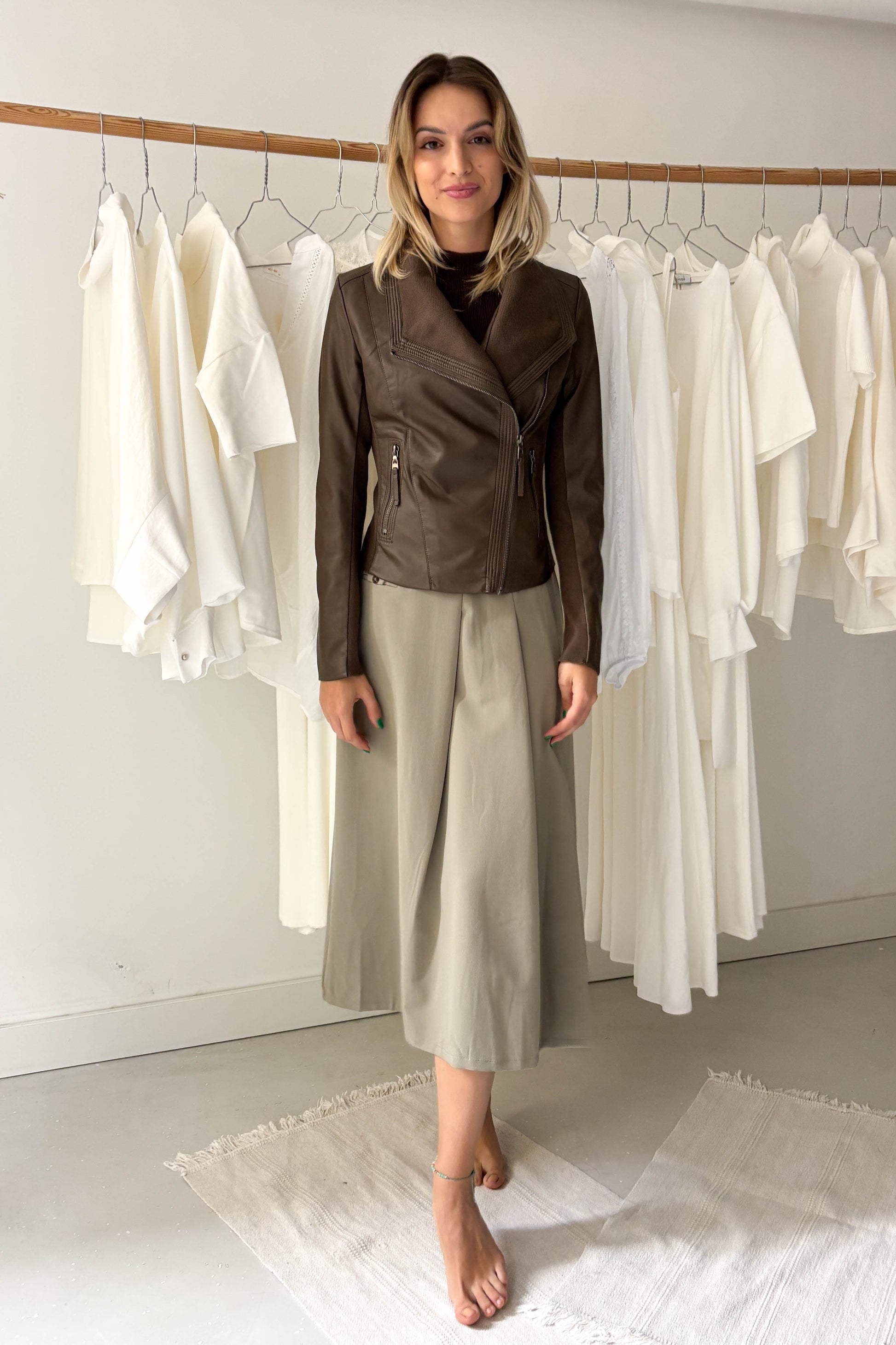 Asszimetrikusan cipzárral záródó, bőrdzseki, pézsmabarna színben. Két oldalt, a hónalj részen át, egészen az ujjak végéig sztreccses anyag fut végig. Derékrészen szűkített, zsebes fazon.