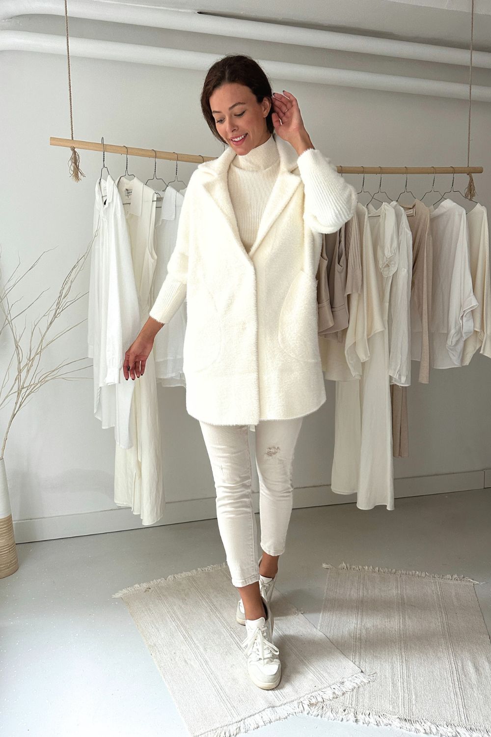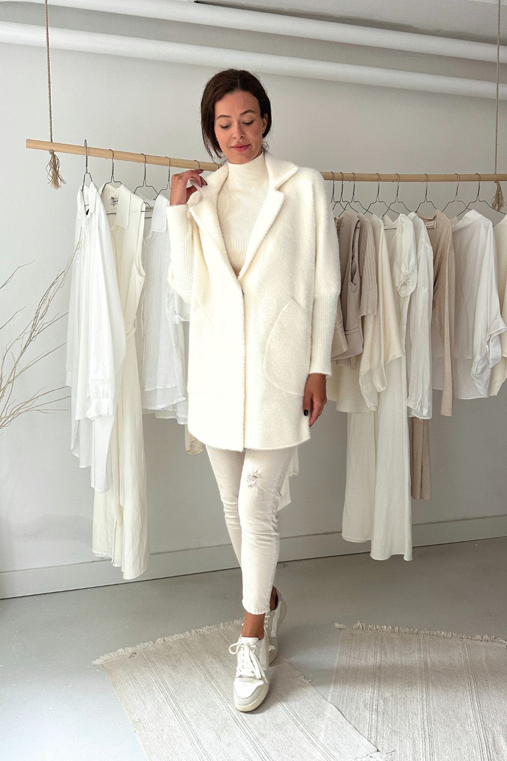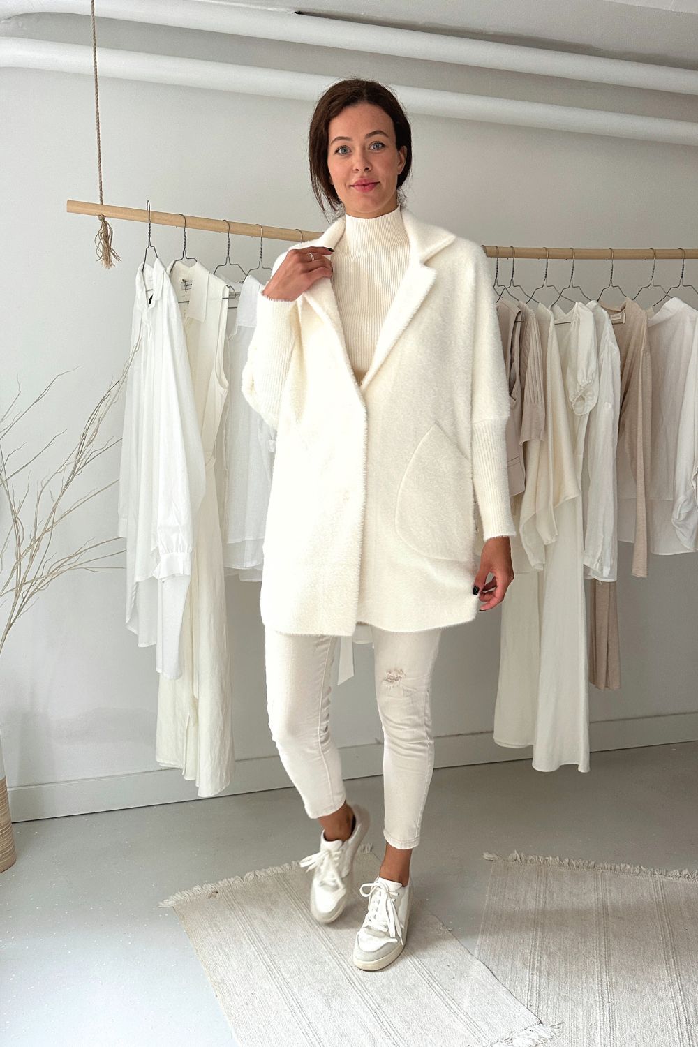 A modell 177 cm magas, Egyméretes. Anyaga: 38,4% gyapjú, 23,5% poliészter, 15,3% angora, 22,8% viszkóz.