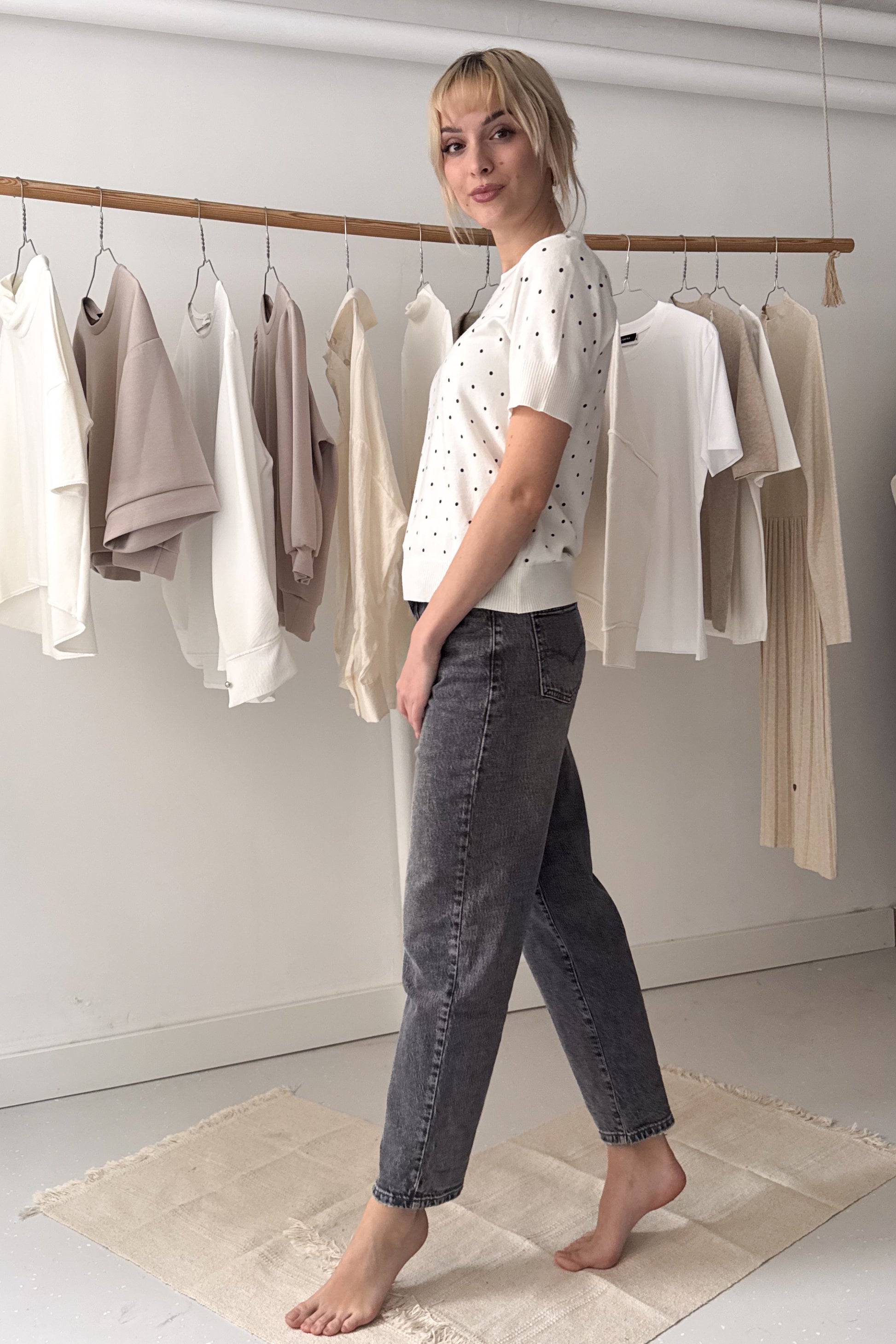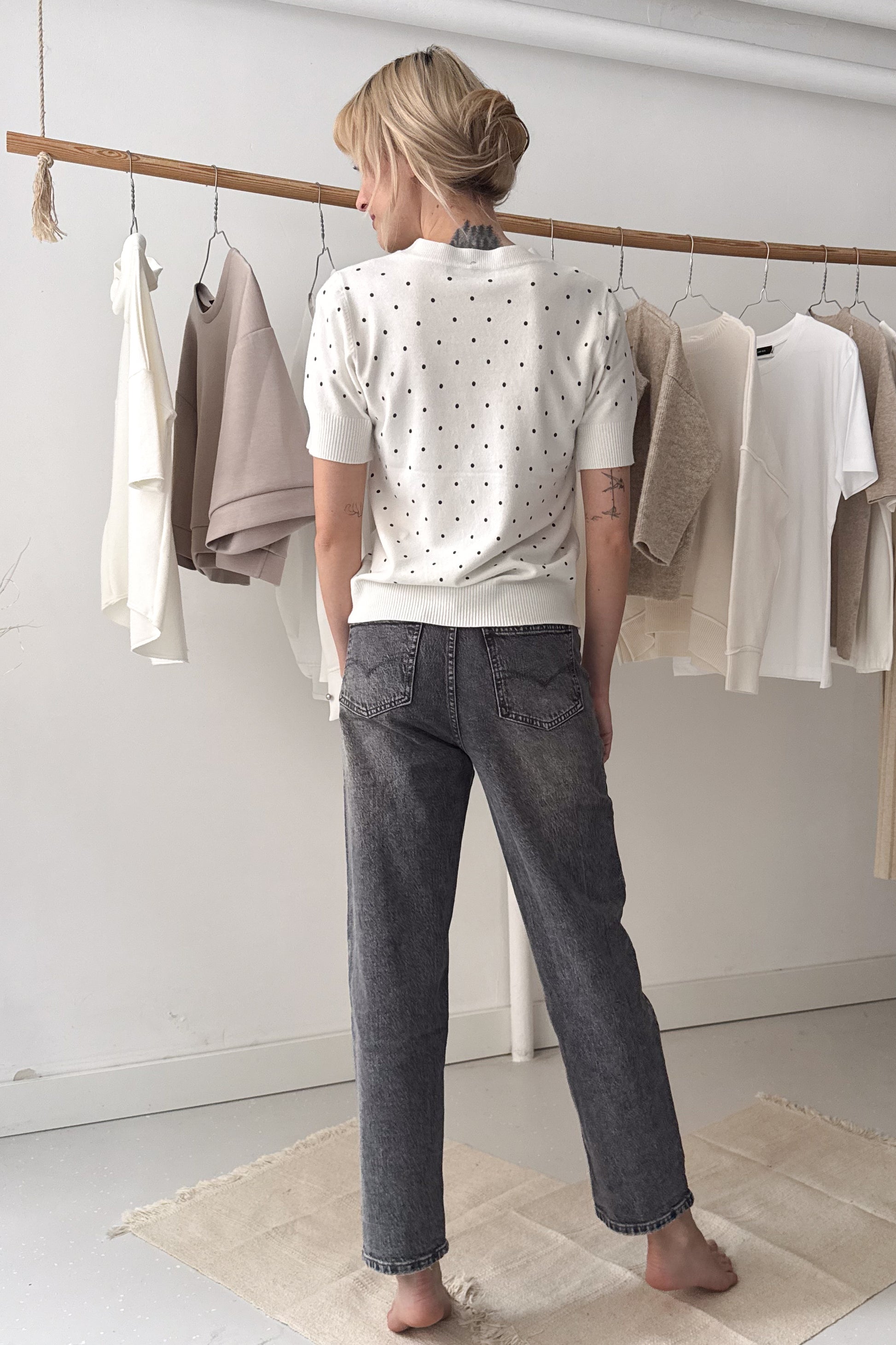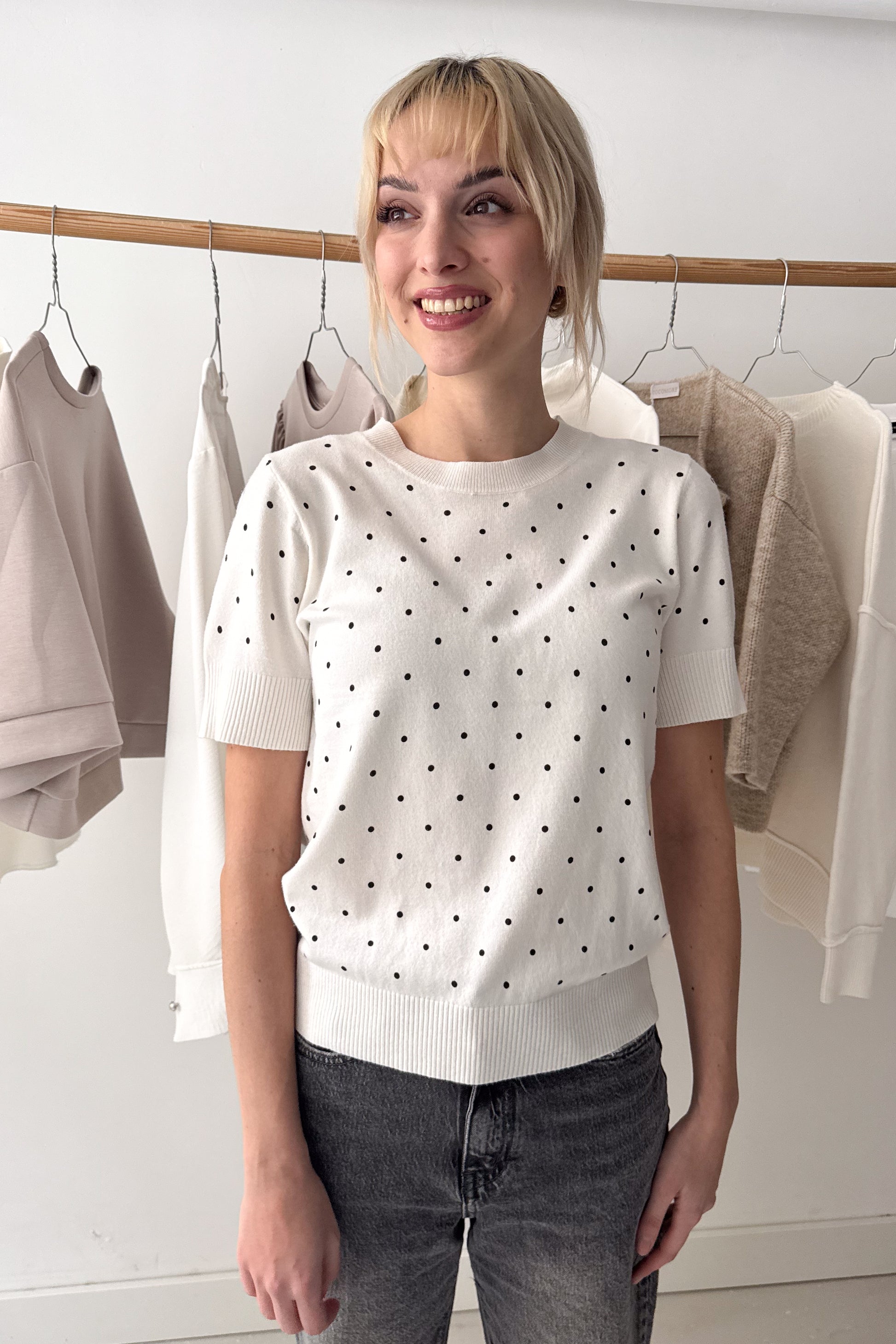 Fehér alapon apró fekete pöttyös kötött felső. Rövidujjú, kereknyakú fazon. Az ujjak végén, az alján és a nyakán passzés.