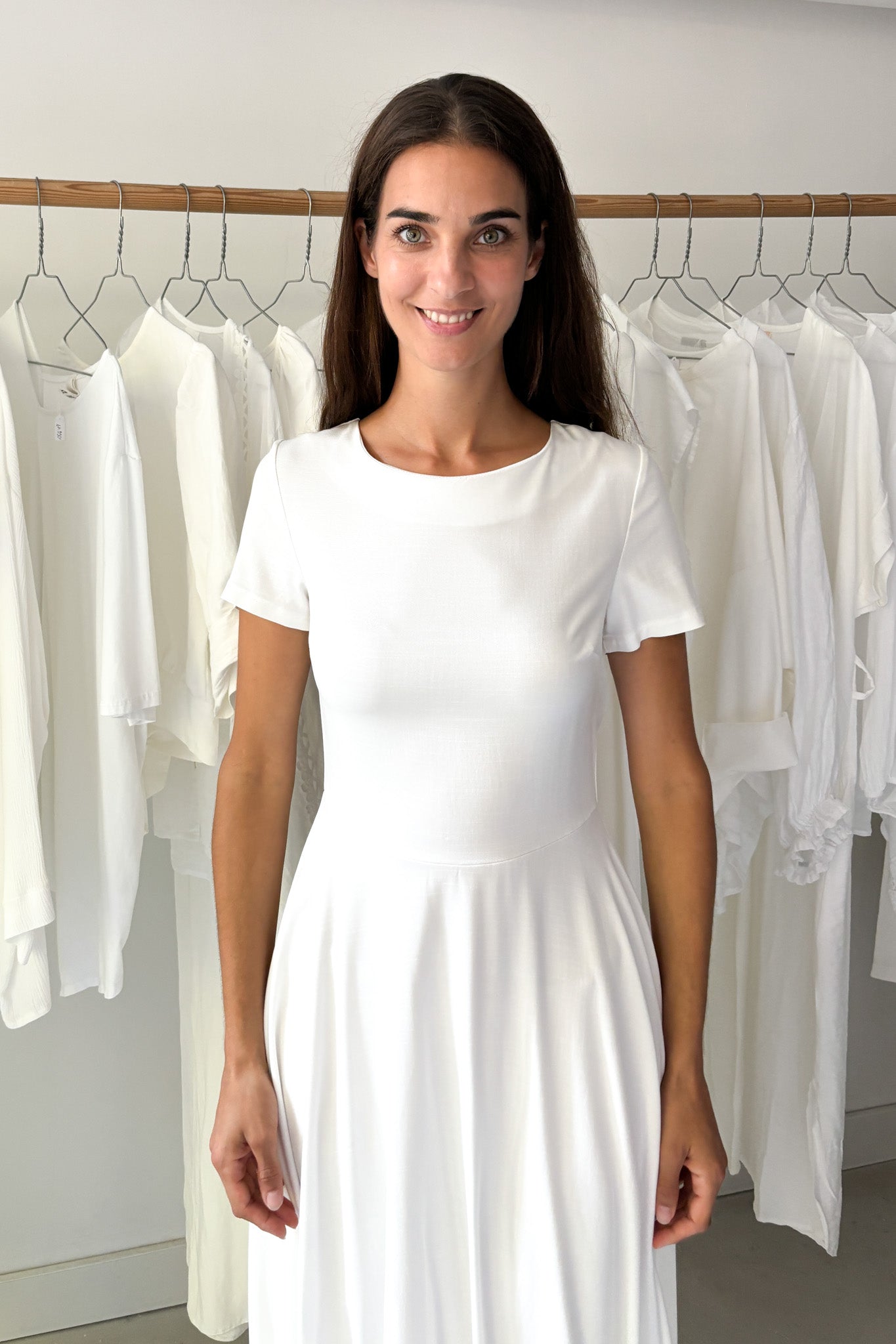 Lágy esésű, letisztult ruha fehér színben. Hátán cipzárral ellátott. Menyasszonyi ruhának is tökéletes viselet.