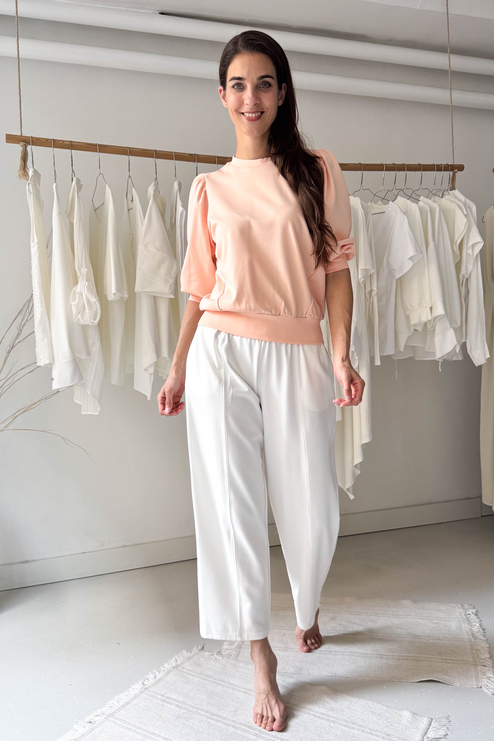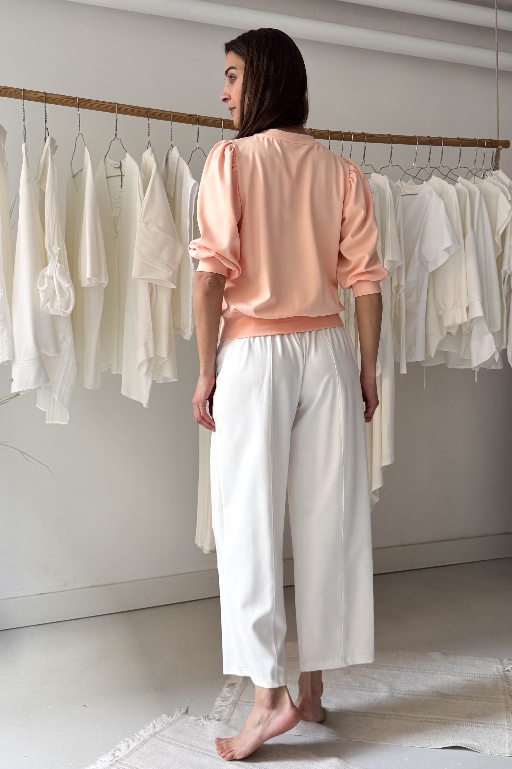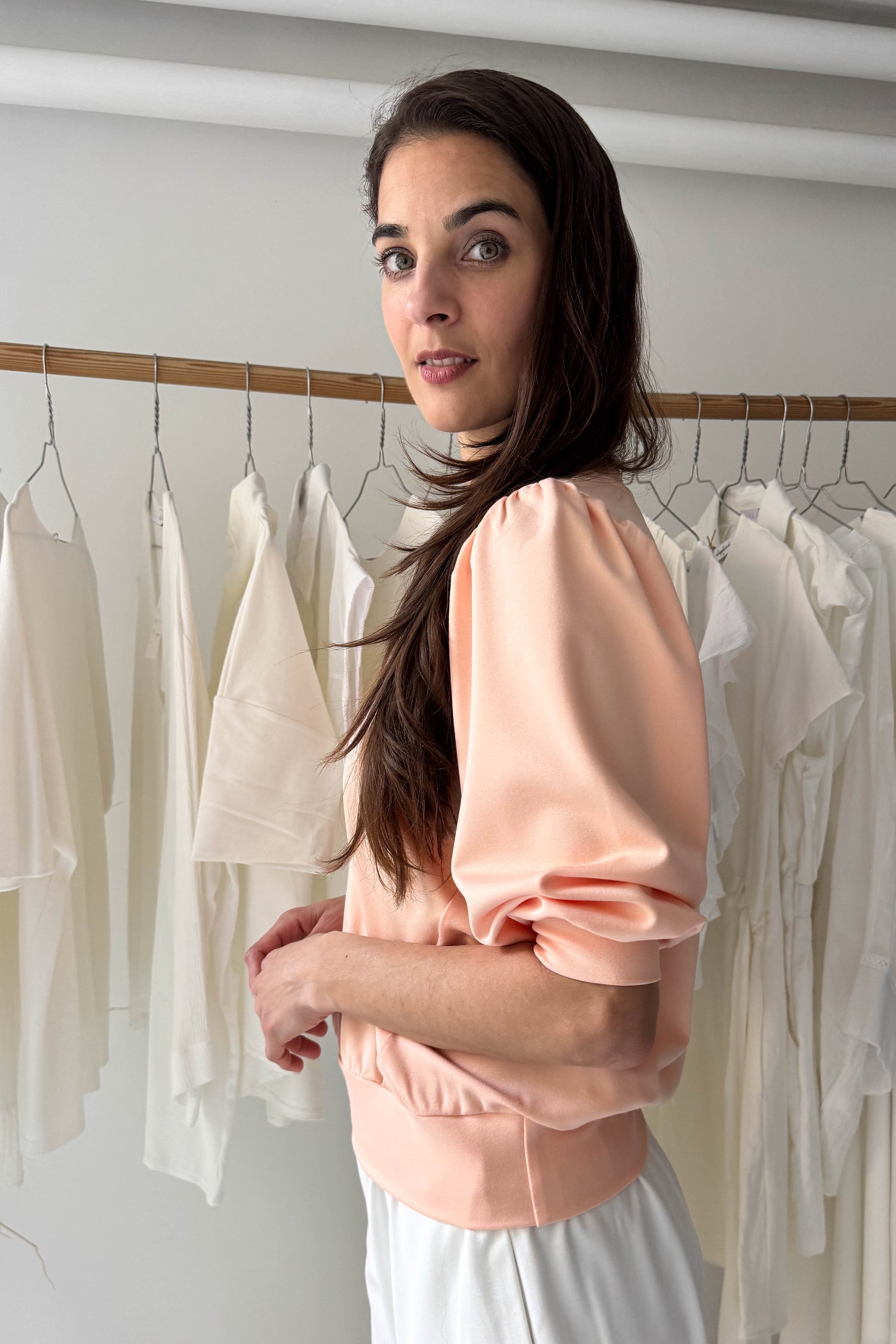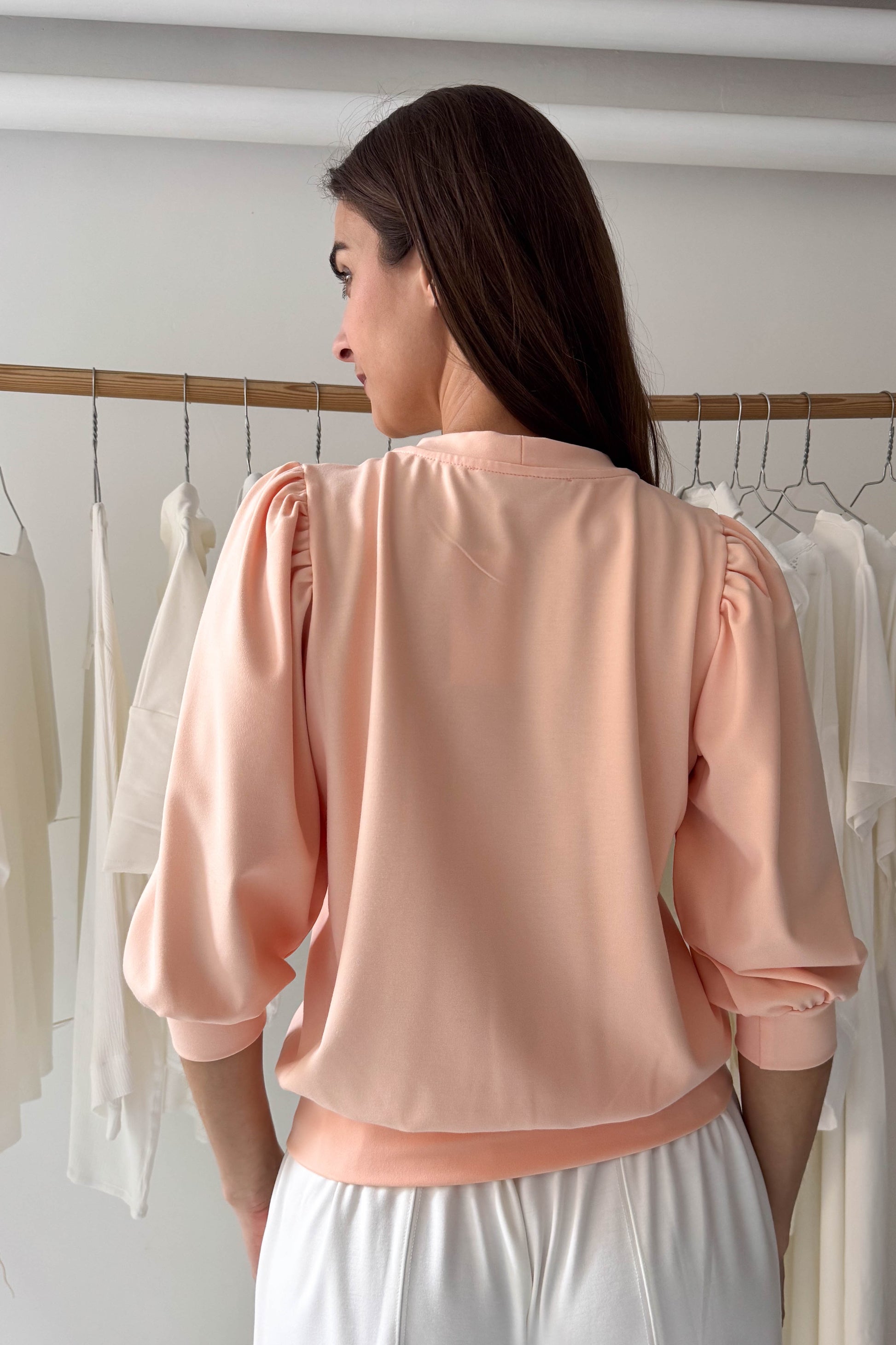 Kerek nyakú, laza szabású, 3/4-es ujjú felső, puffos ujjszabással, barack színben. Derékon és az ujjak végén passzéval van ellátva. Több színben elérhető.