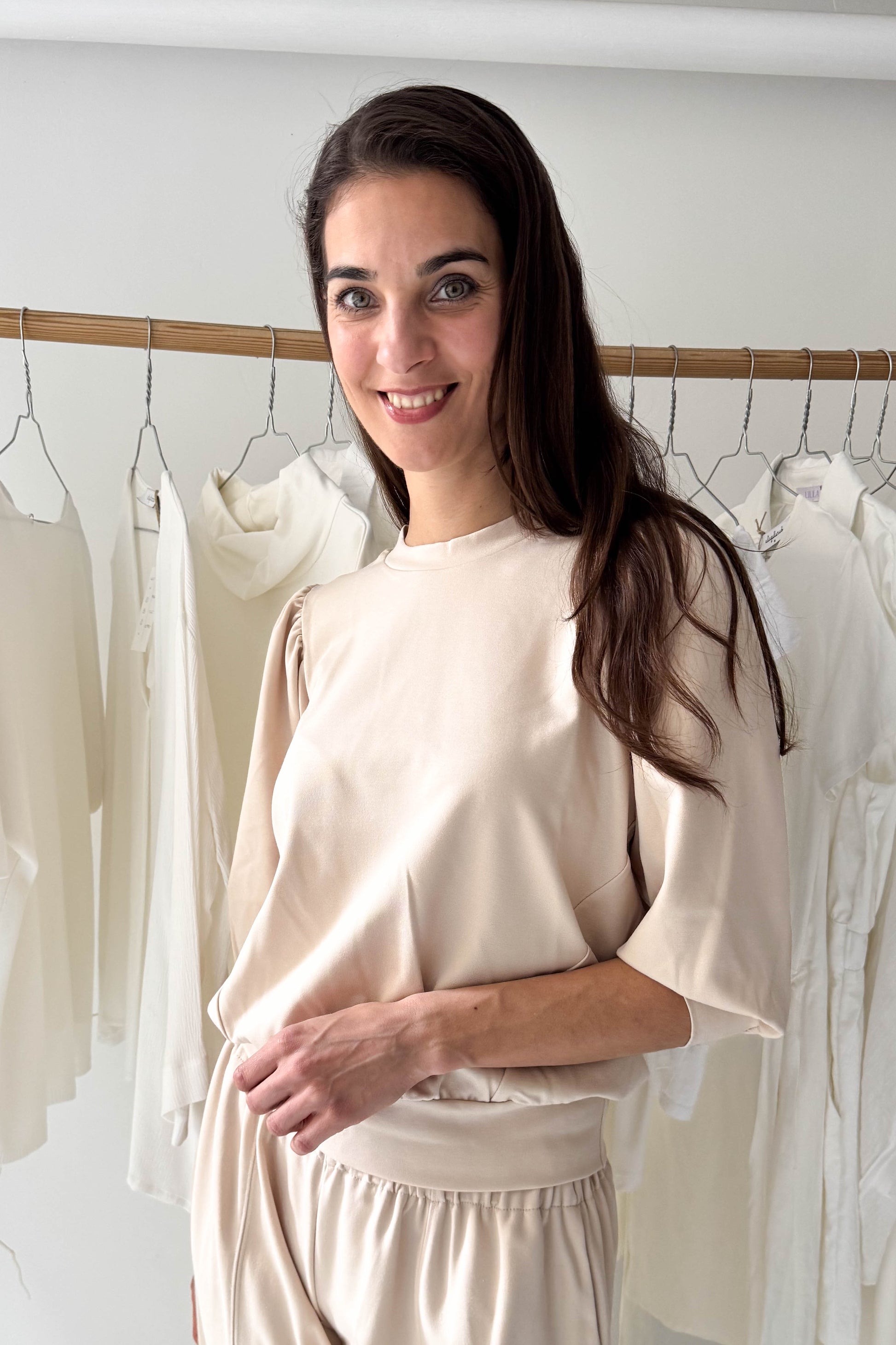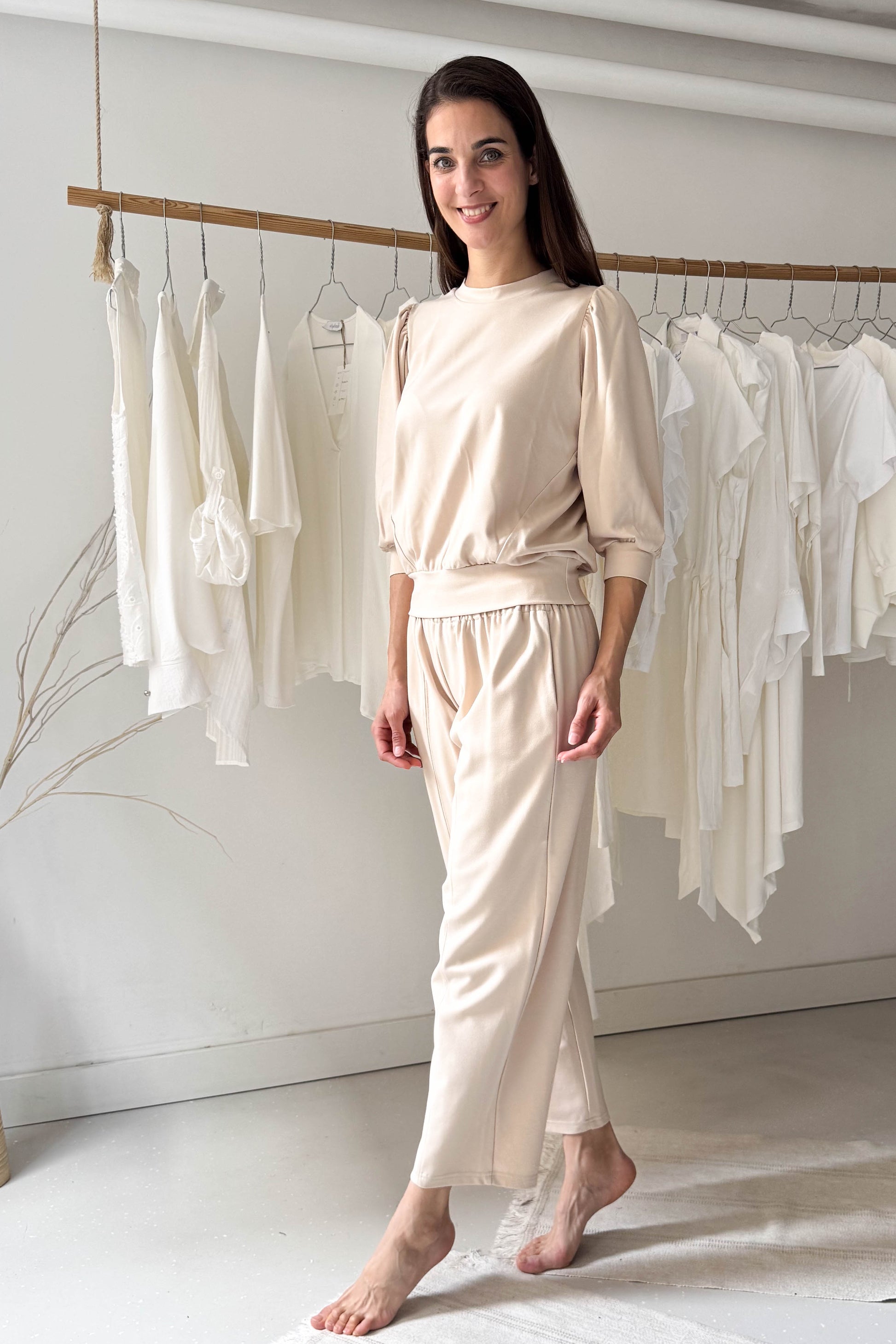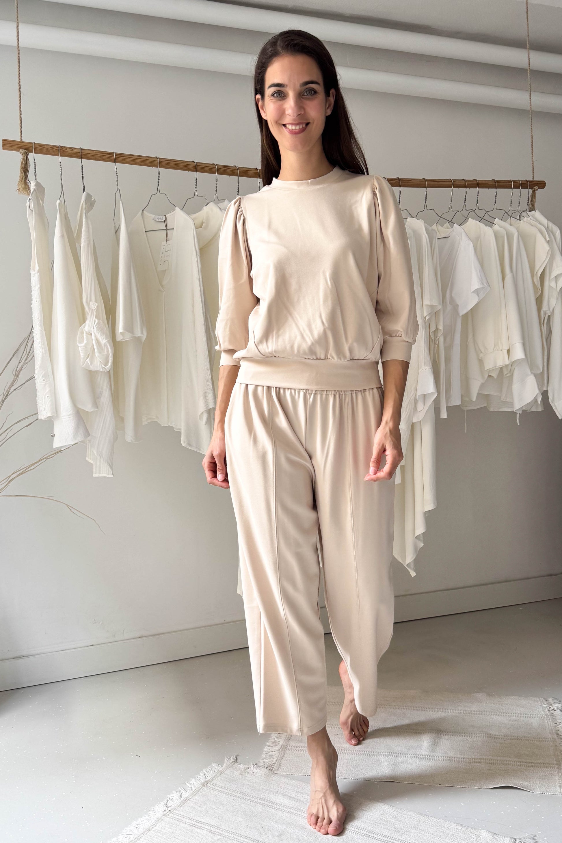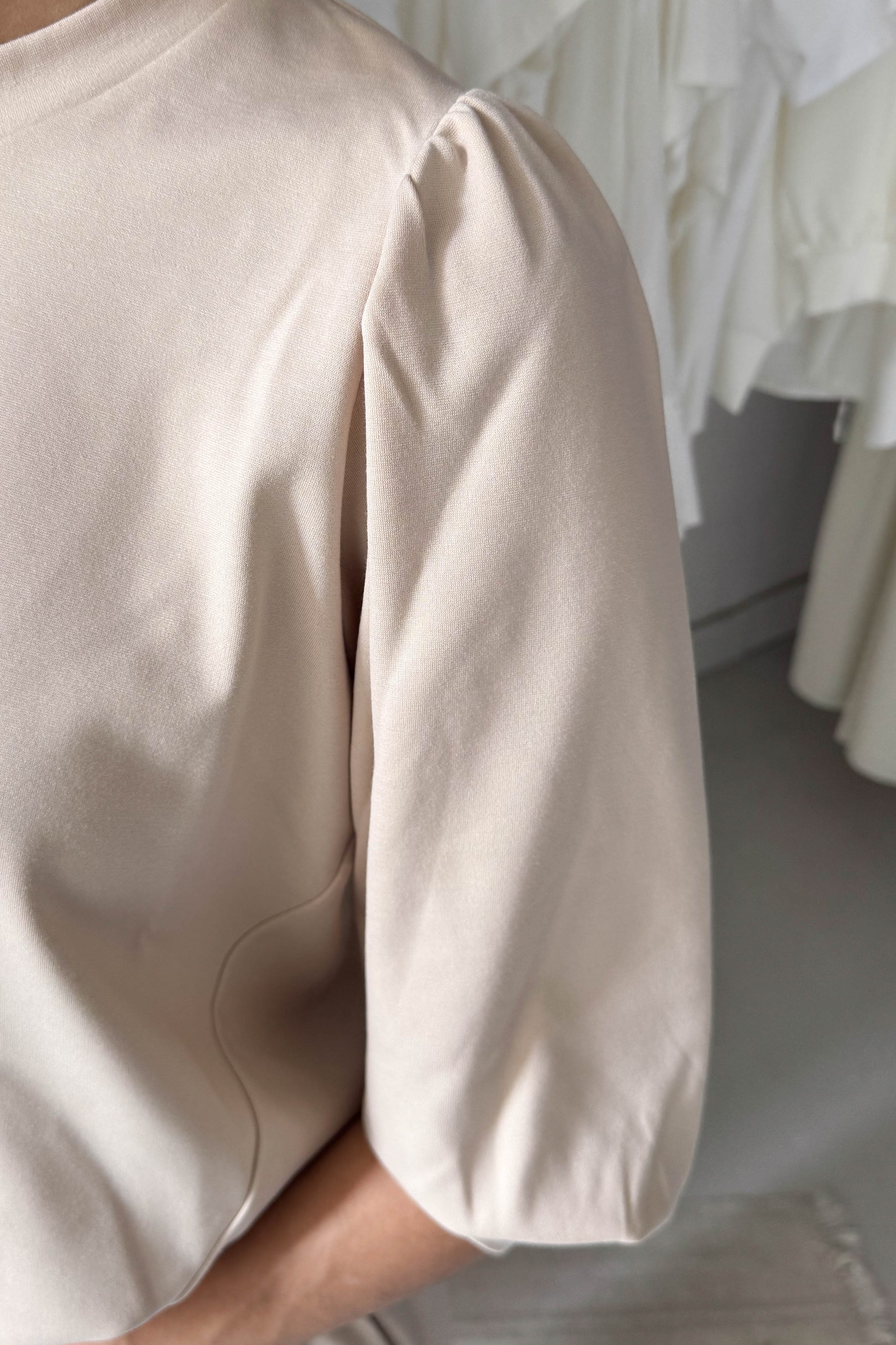 Fehér kerek nyakú, laza szabású, 3/4-es ujjú felső, puffos ujjszabással. Derékon és az ujjak végén passzéval van ellátva.