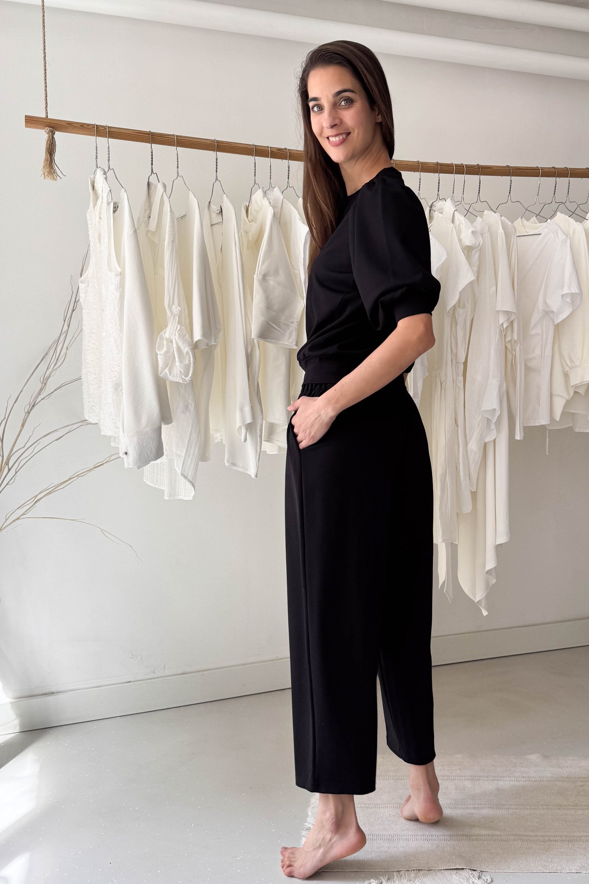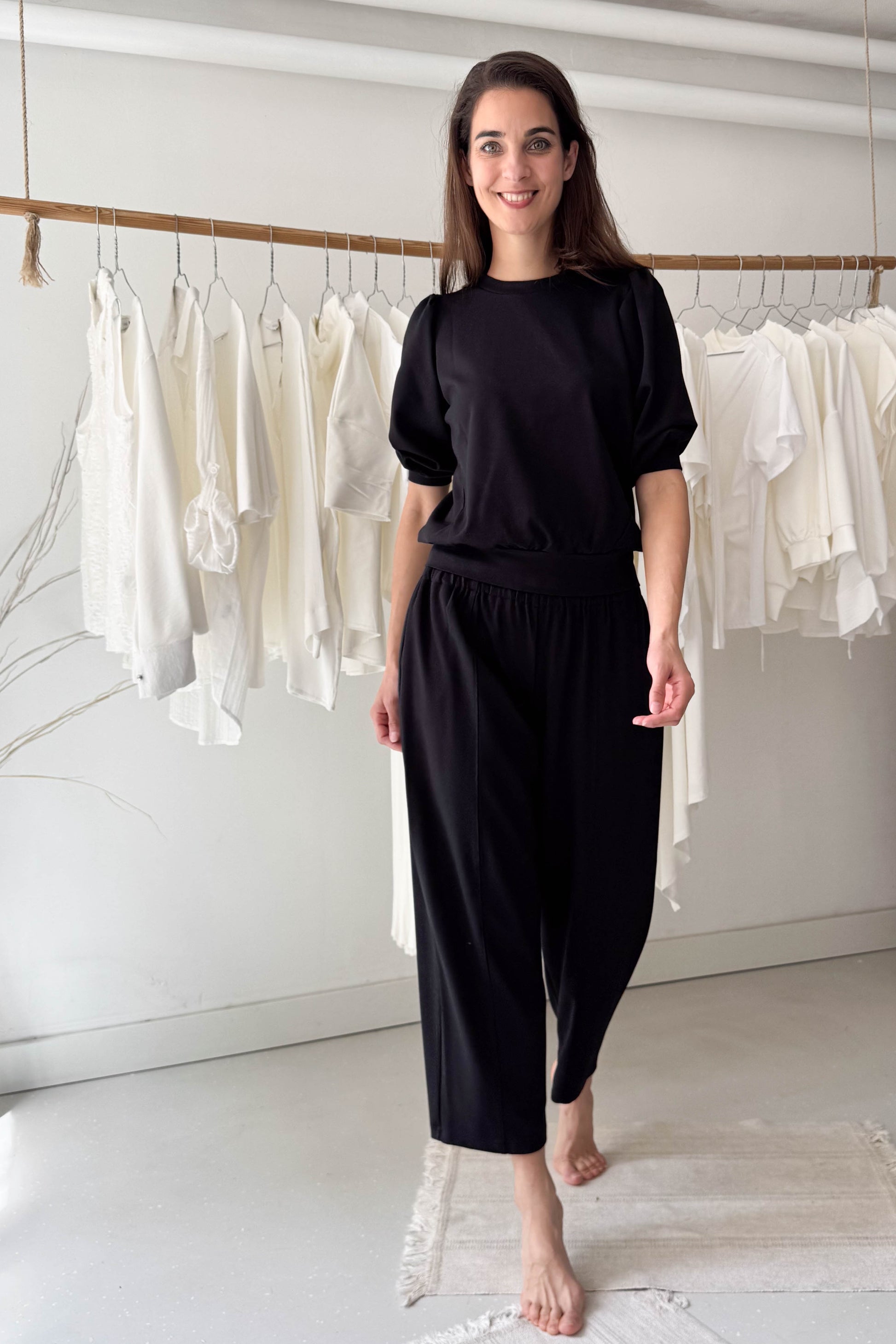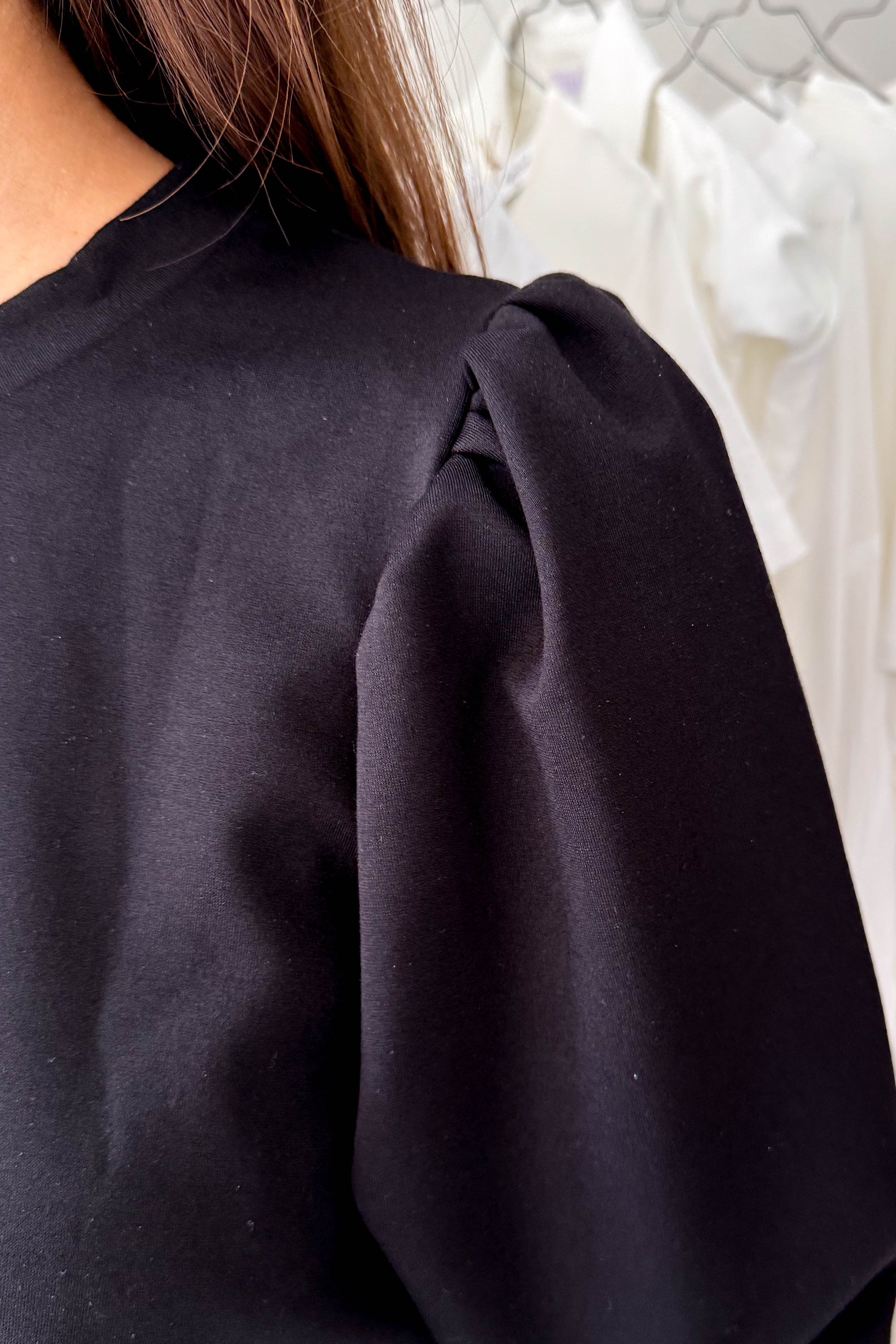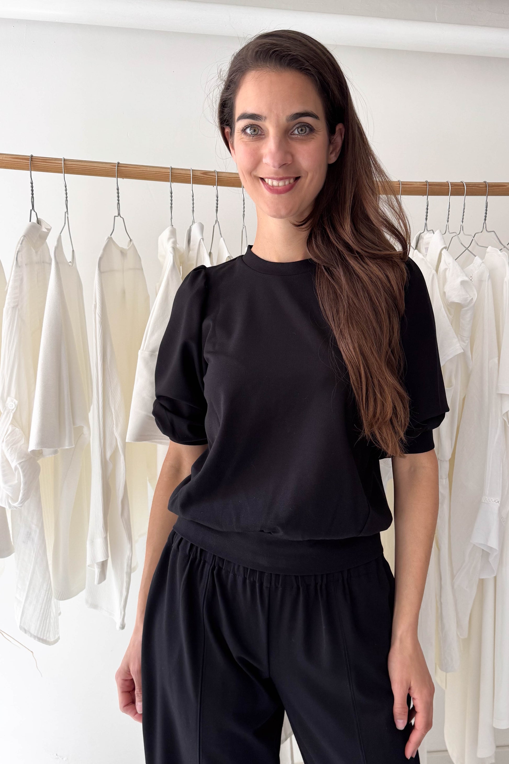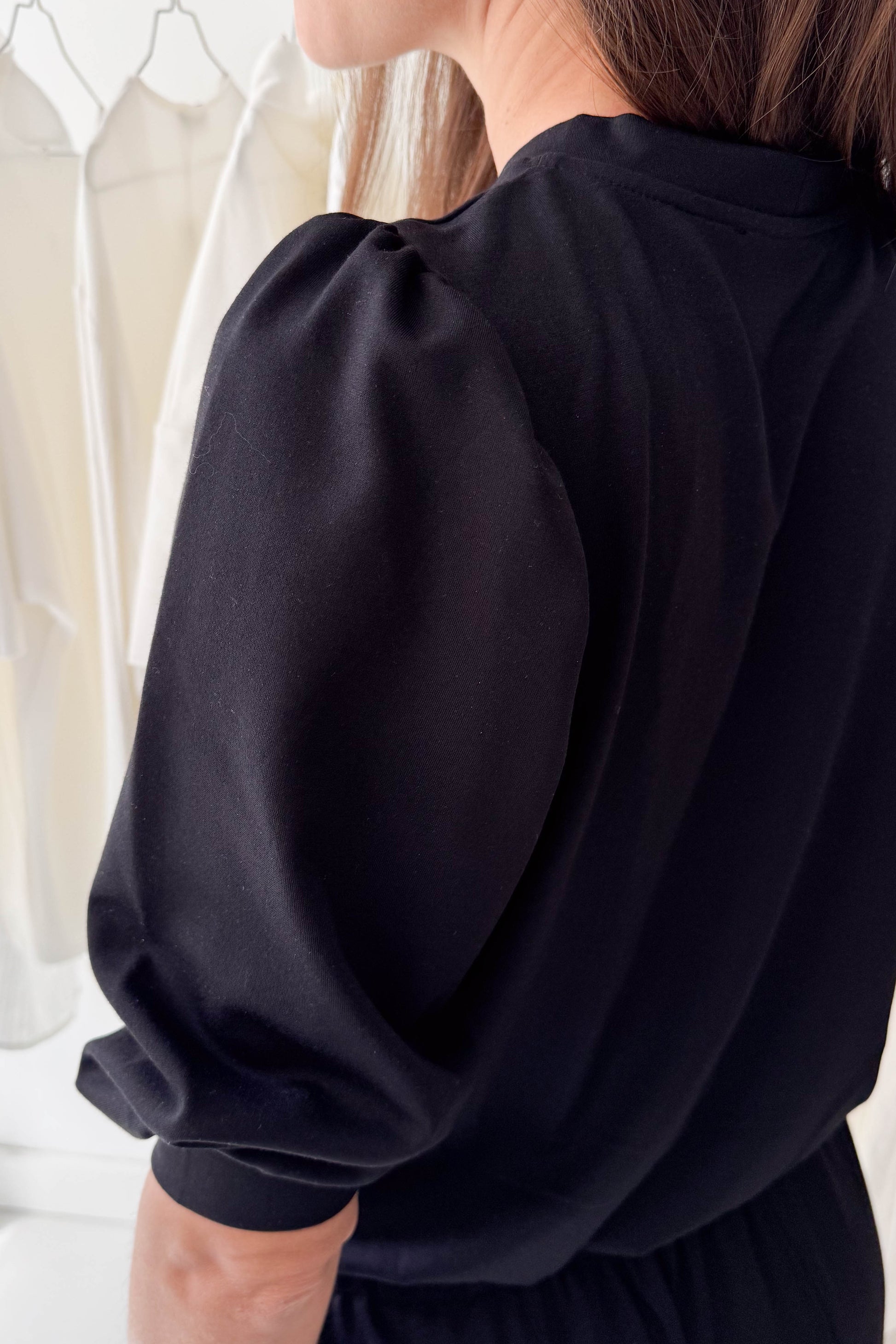 Fekete, kerek nyakú, laza szabású, 3/4-es ujjú felső, puffos ujjszabással. Derékon és az ujjak végén passzéval van ellátva. Több színben elérhető.