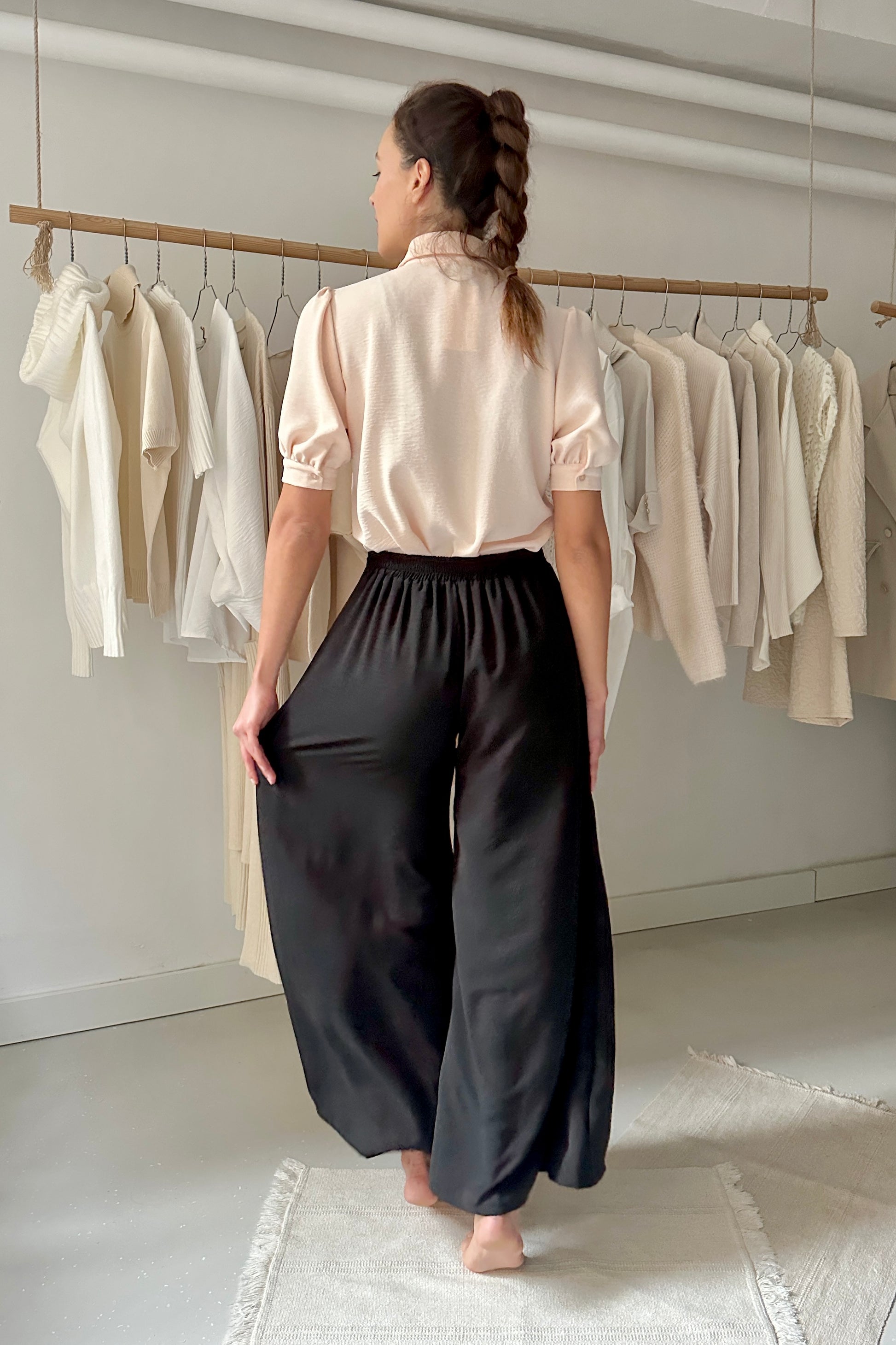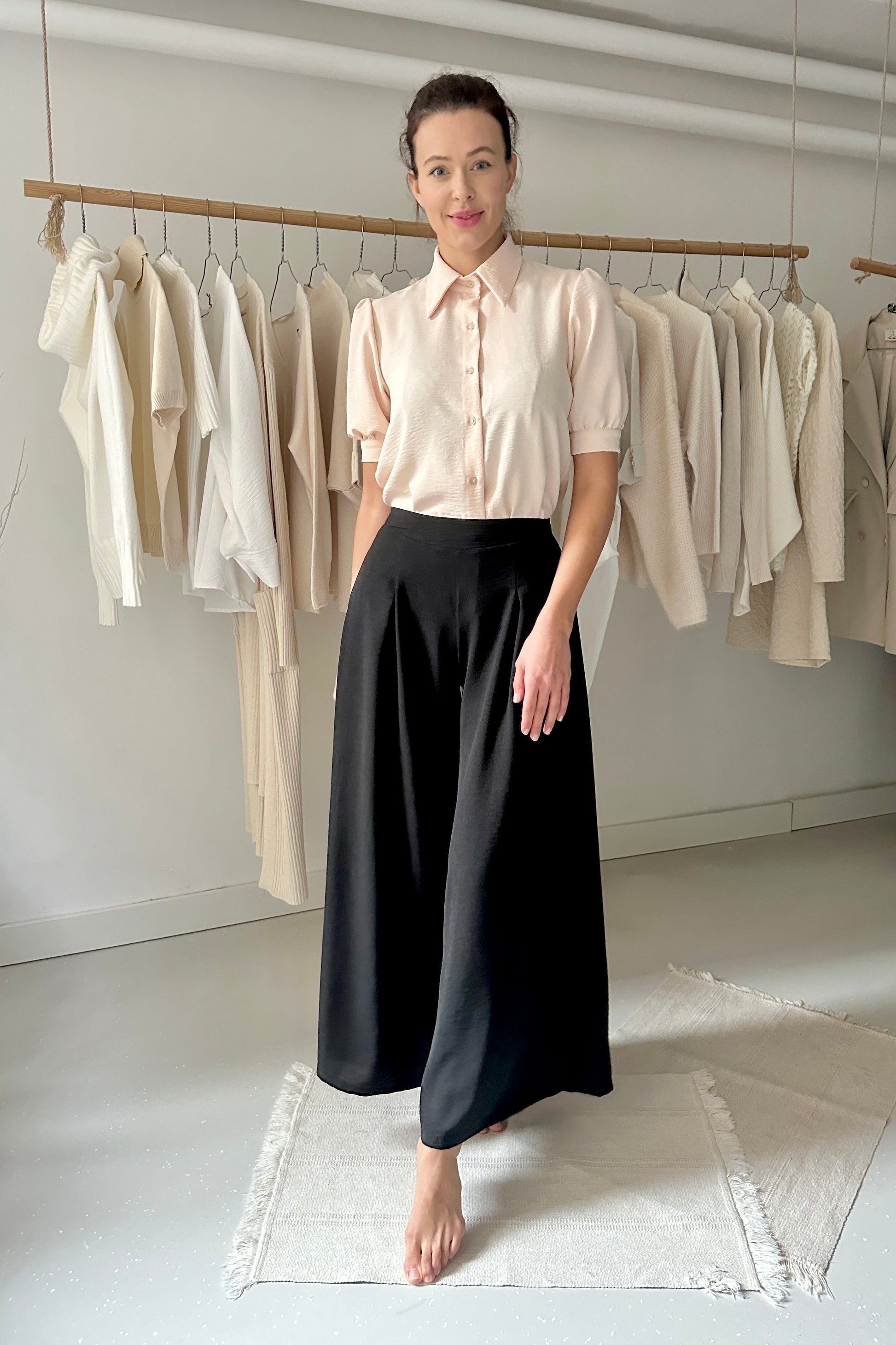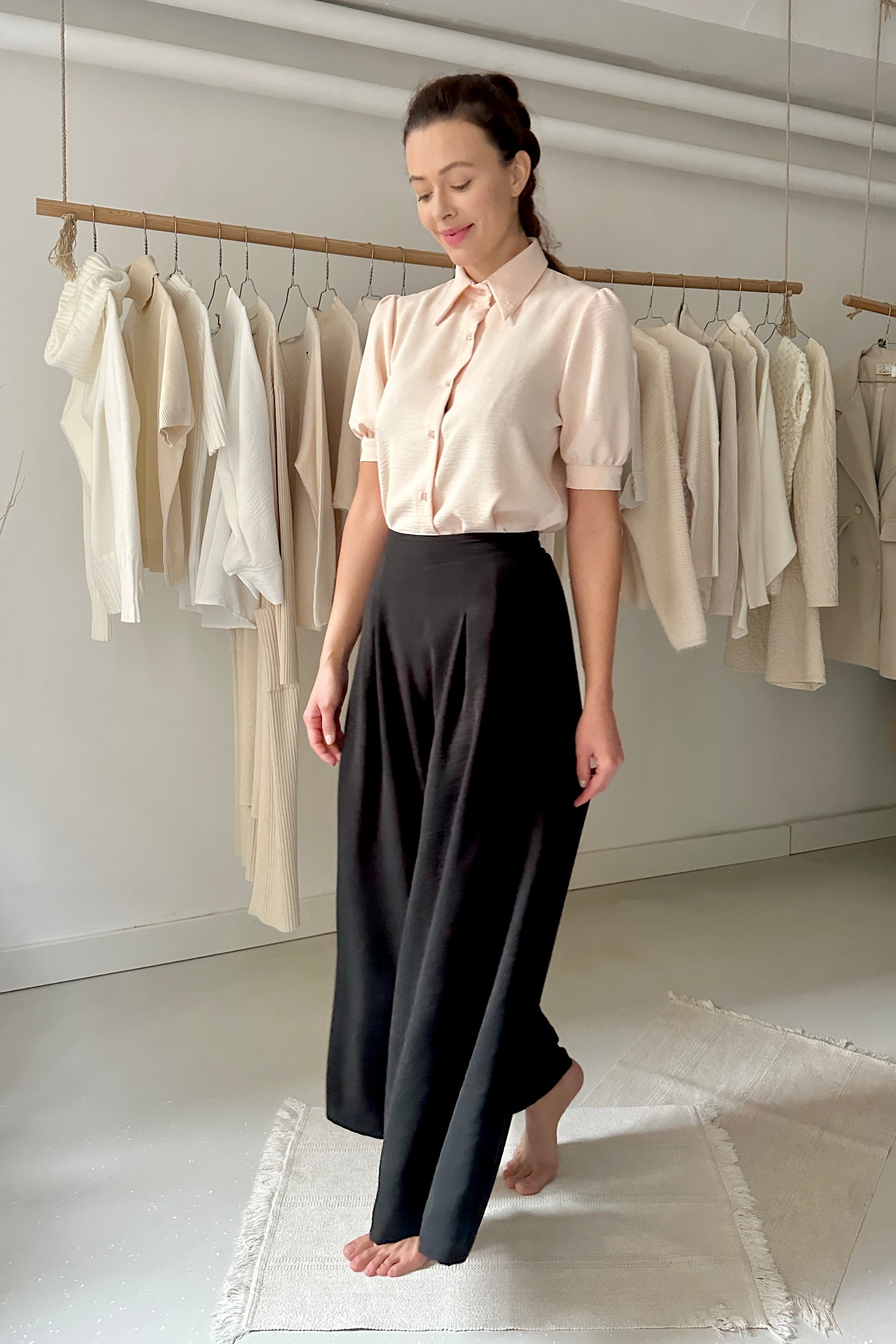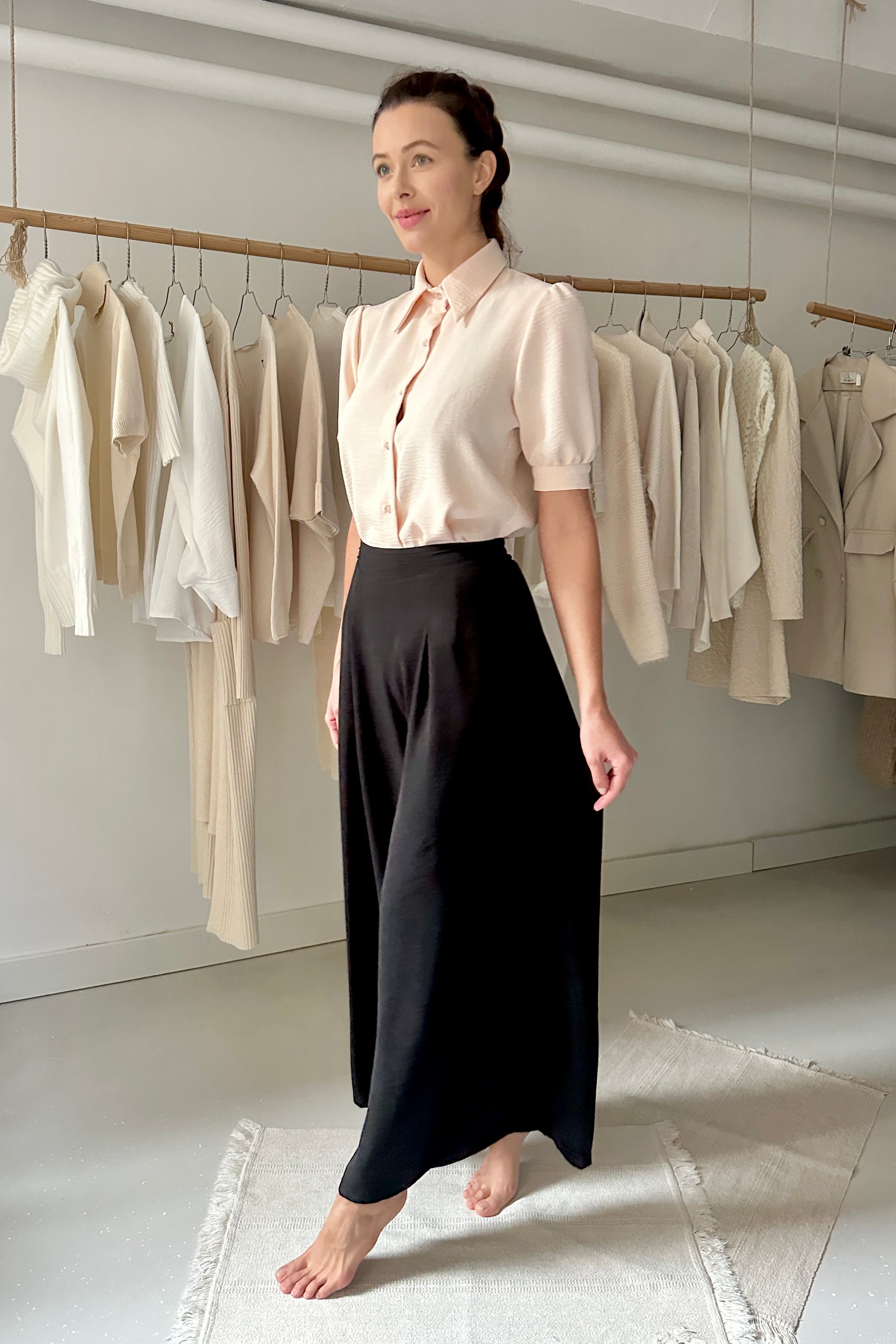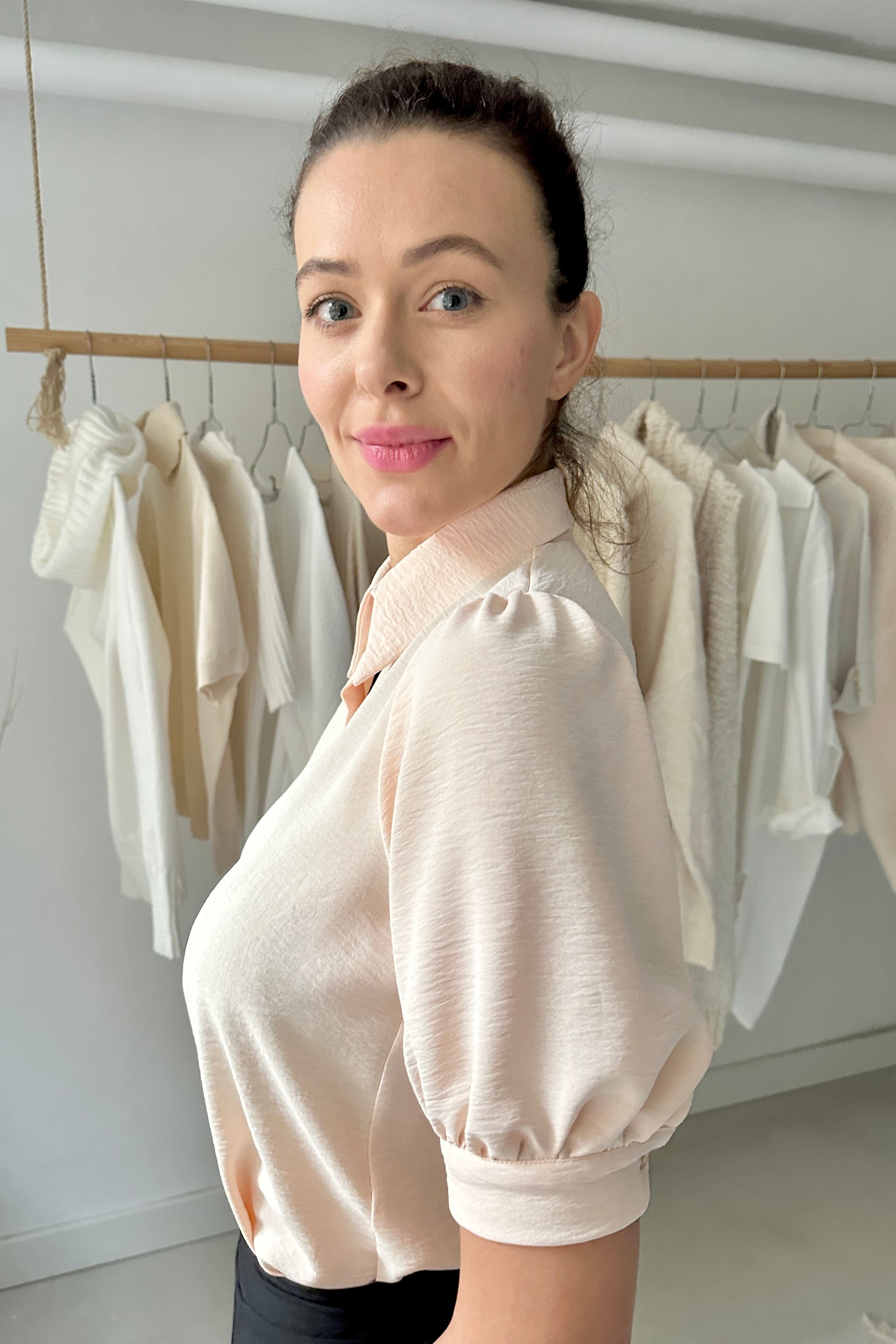 Könnyű anyagú blúz gallérral, elöl gombokkal, könyékig érő puffos ujjal, gombos kézelővel.