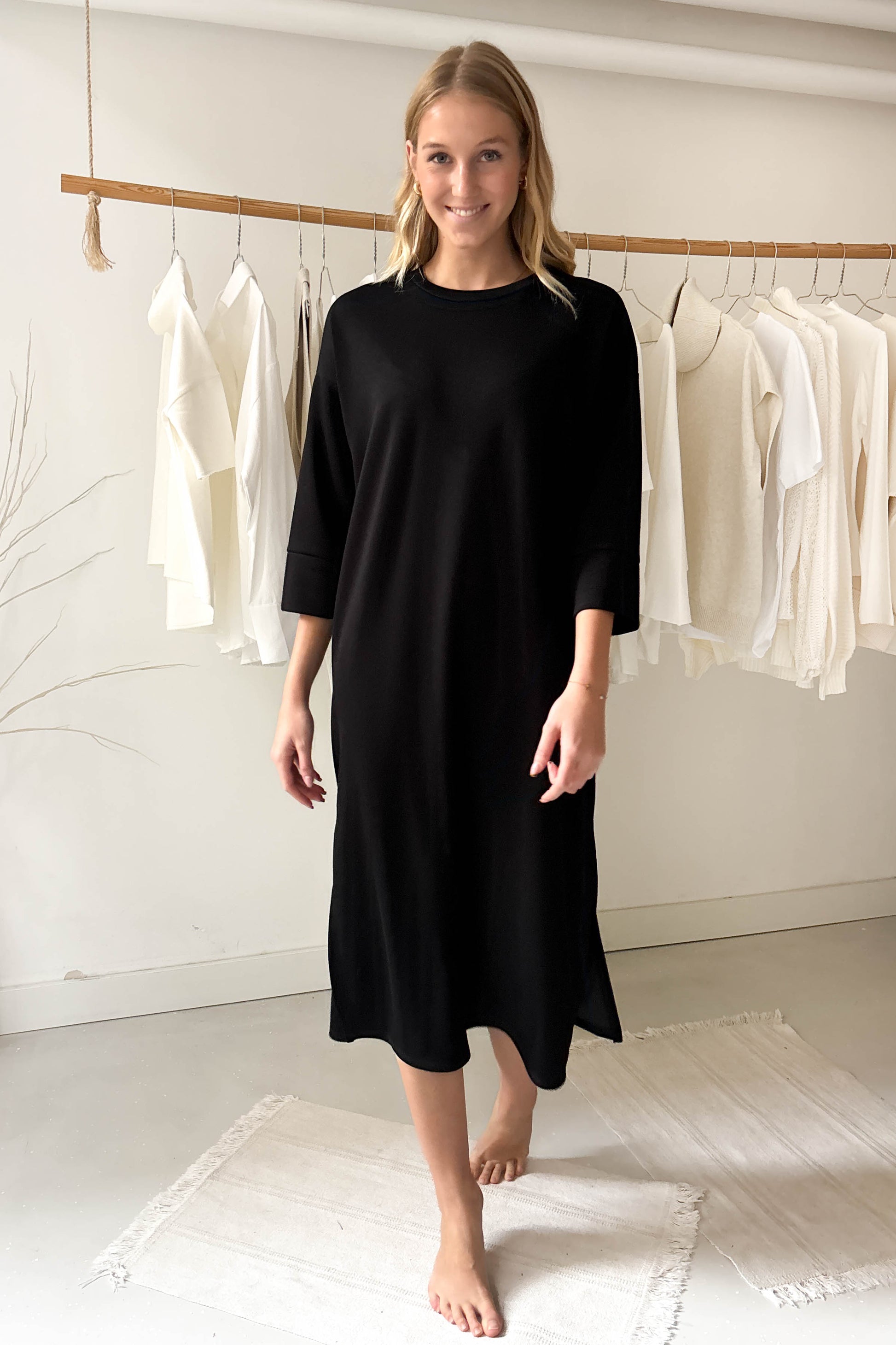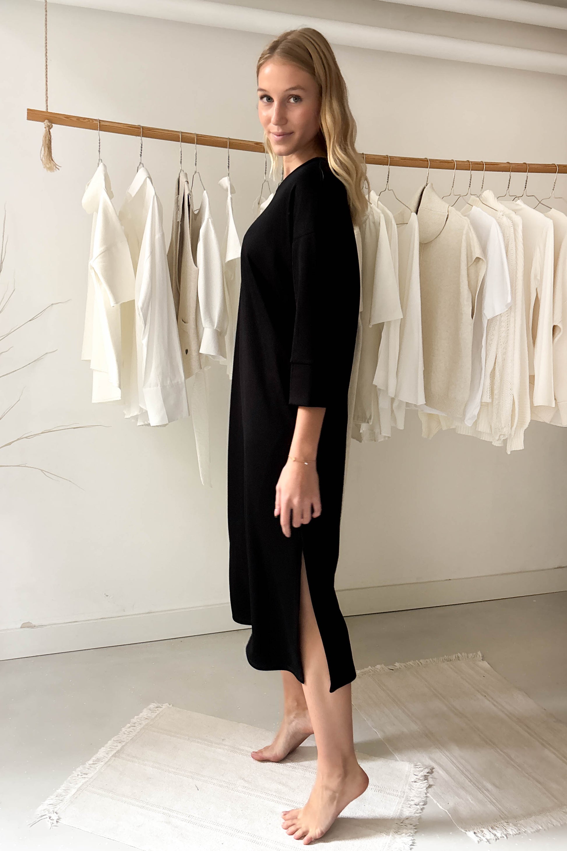 Kerek nyakú, 3/4-es ujjú, egyenes szabású, hosszú fekete ruha. Puha, elasztikus anyagú. Alul két oldalt felsliccelt.