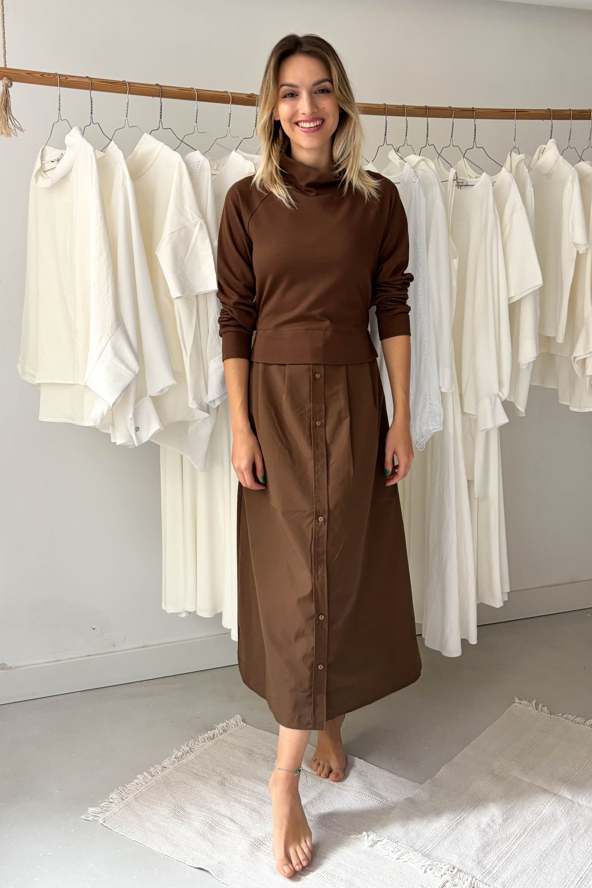 Két féle anyagból készült midi ruha. Az ujjak és a felső részének az eleje pulcsi puhaságú pamutból, a többi része pedig pamutkarton anyagból kászült. Magasított nyakú, hosszúujjú fazon. Alsórésze elől középen apró gombokkal záródik. Derékrészen egy megkötővel szűkíthető fazon.
