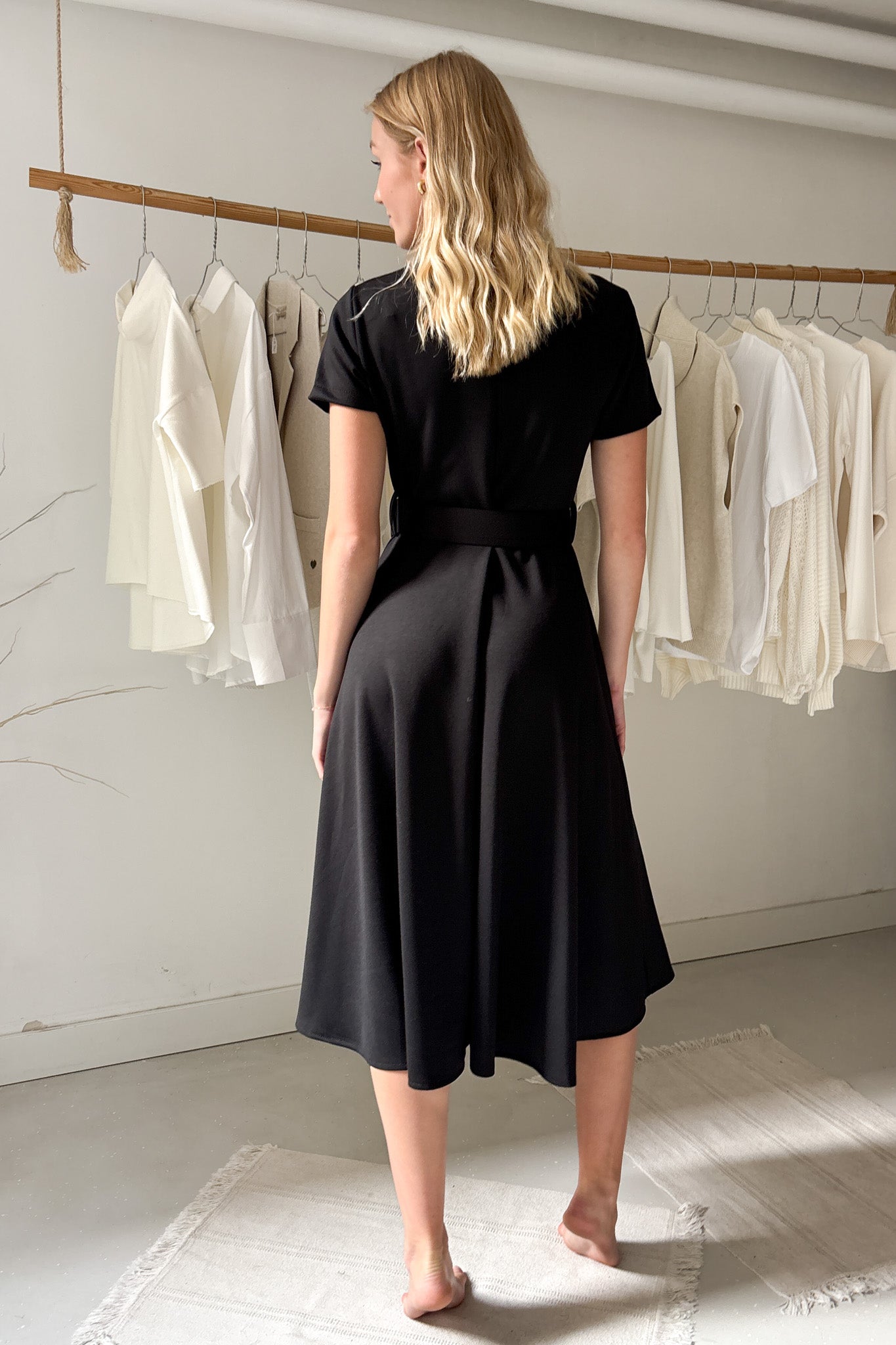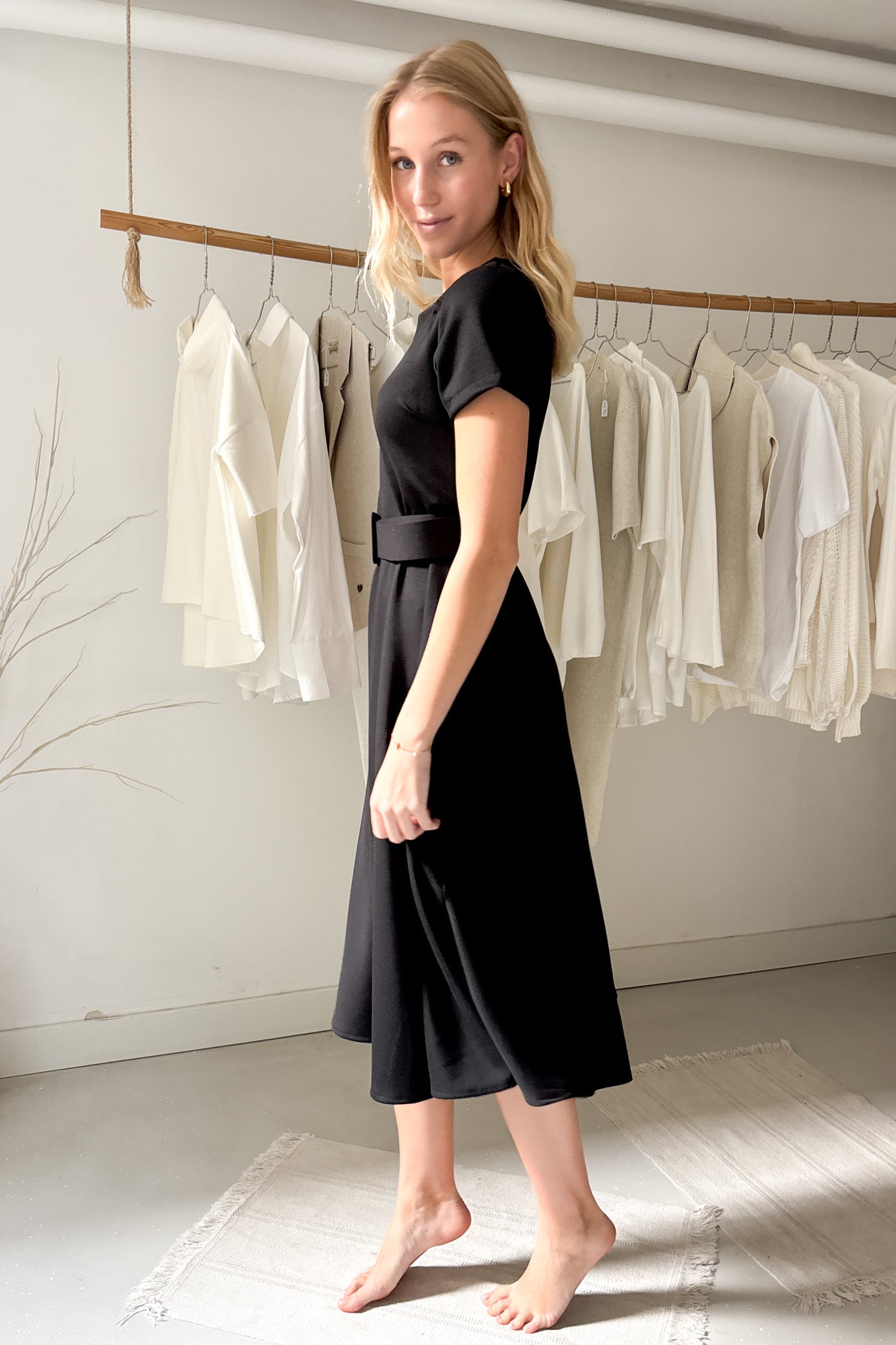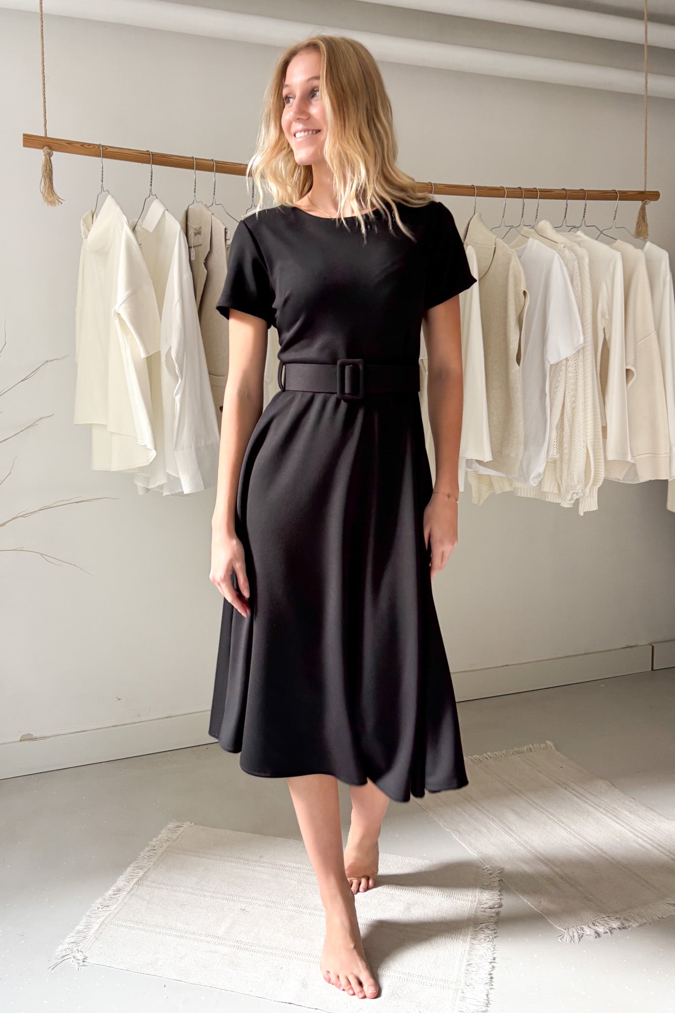 Puha anyagú, rövid ujjas ruha. Övvel ellátott, hátán cipzáros fazon.