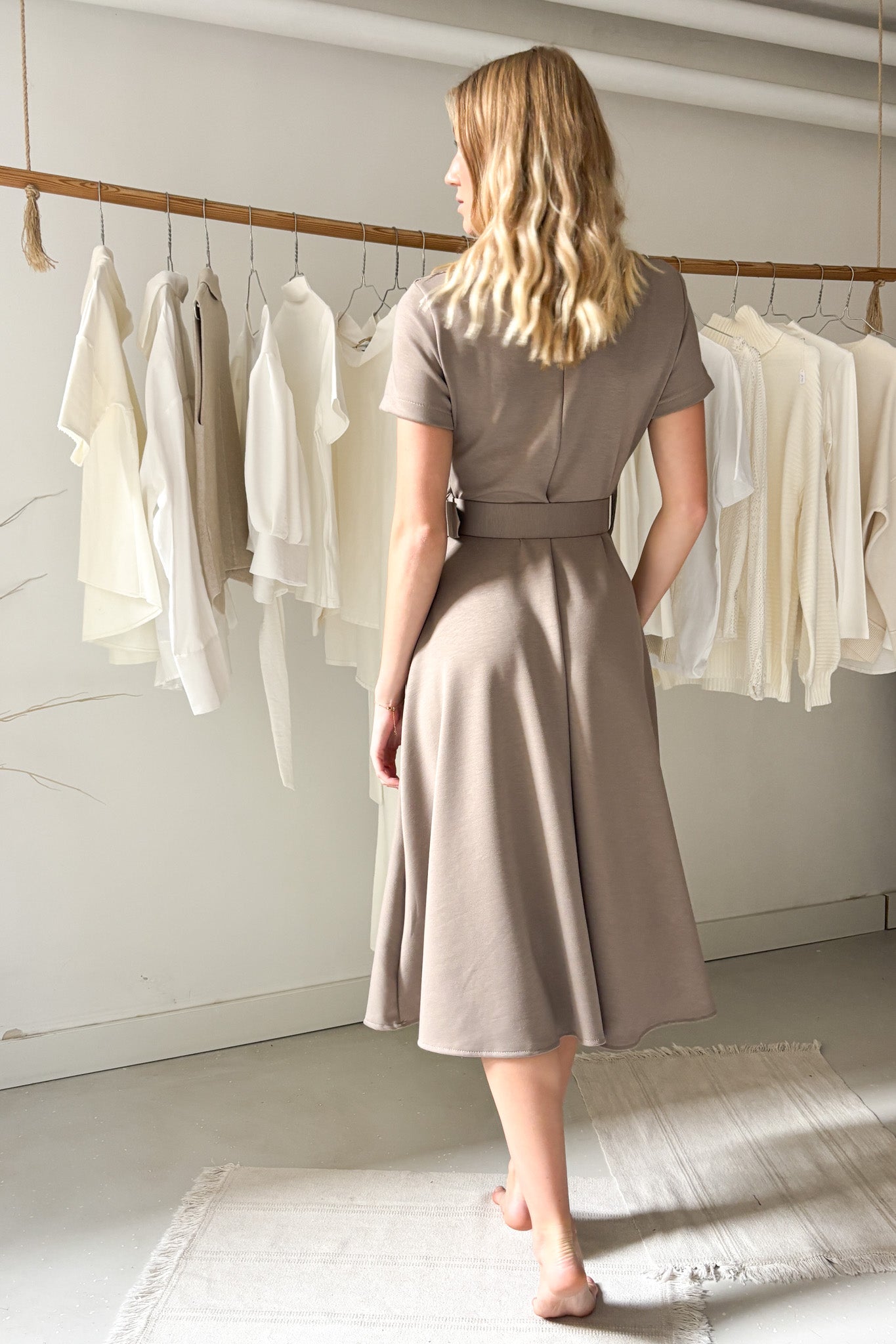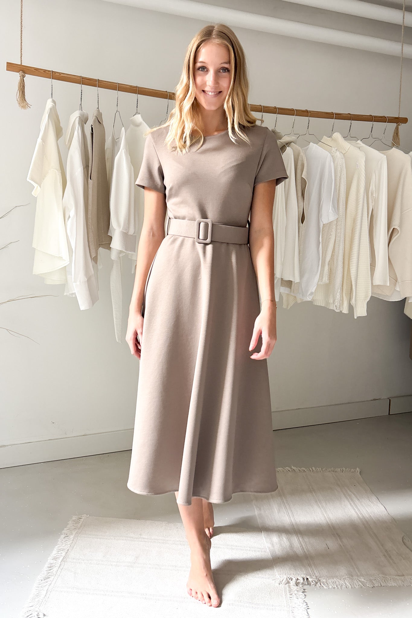 Puha anyagú, rövid ujjas ruha. Övvel ellátott, hátán cipzáros fazon.