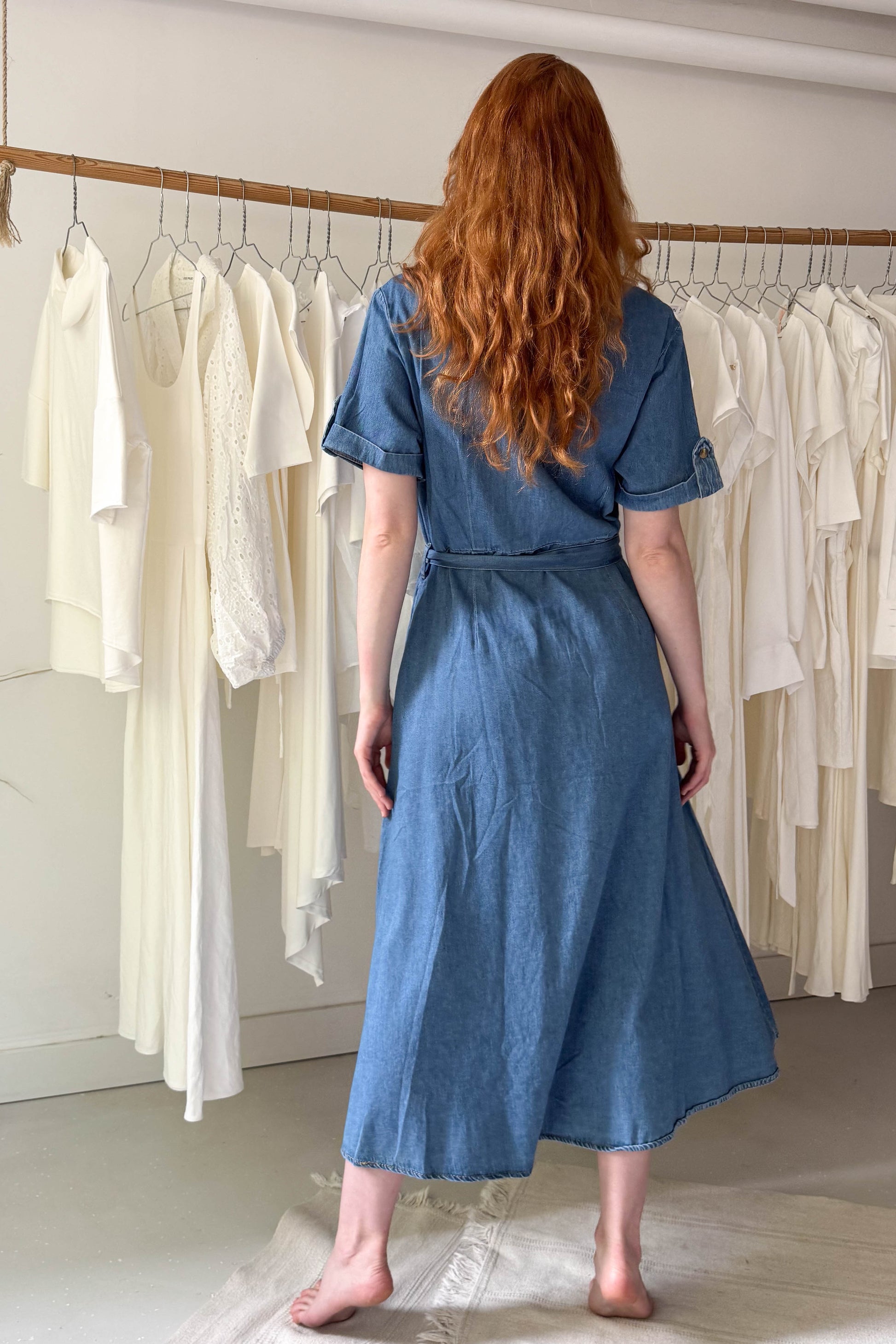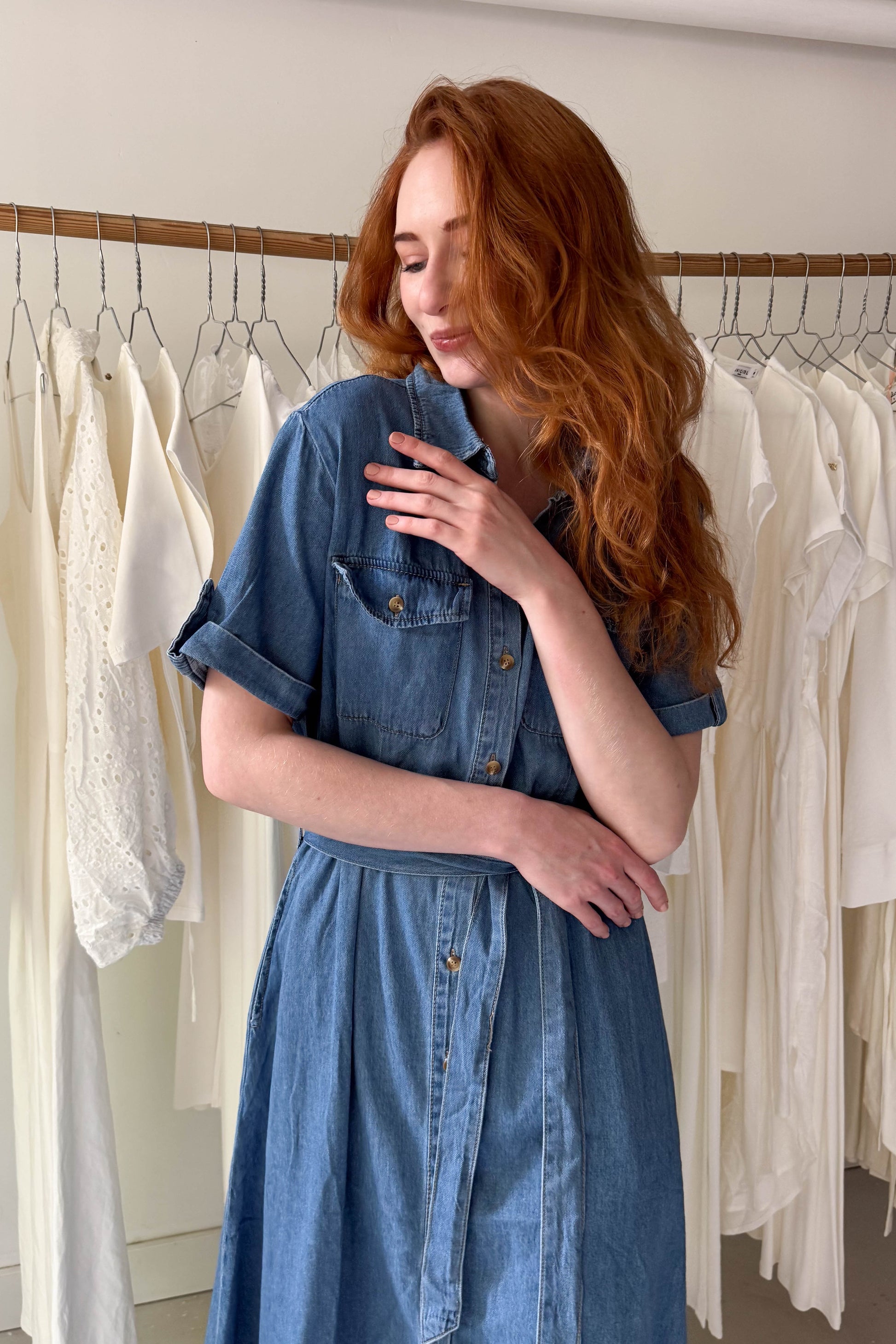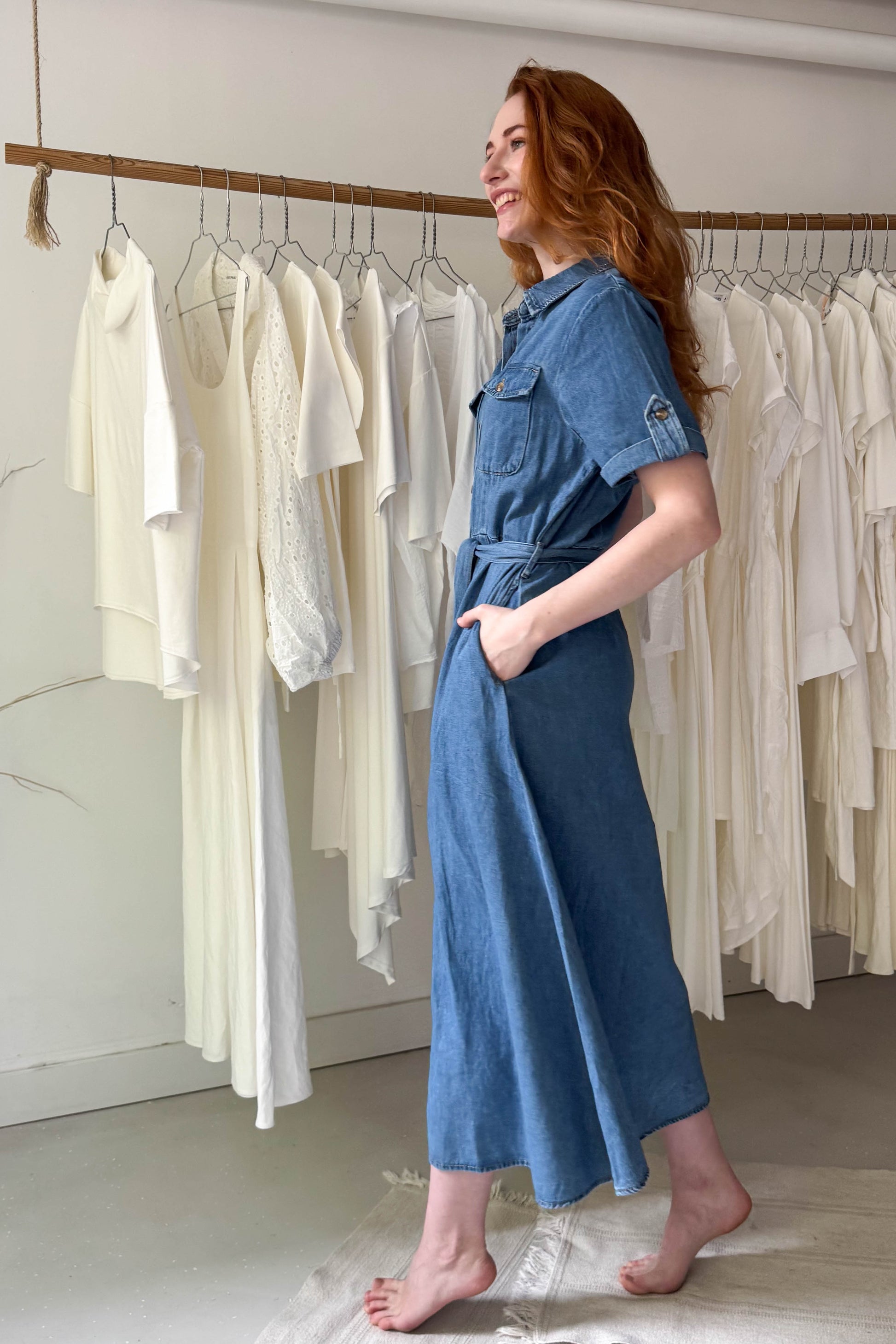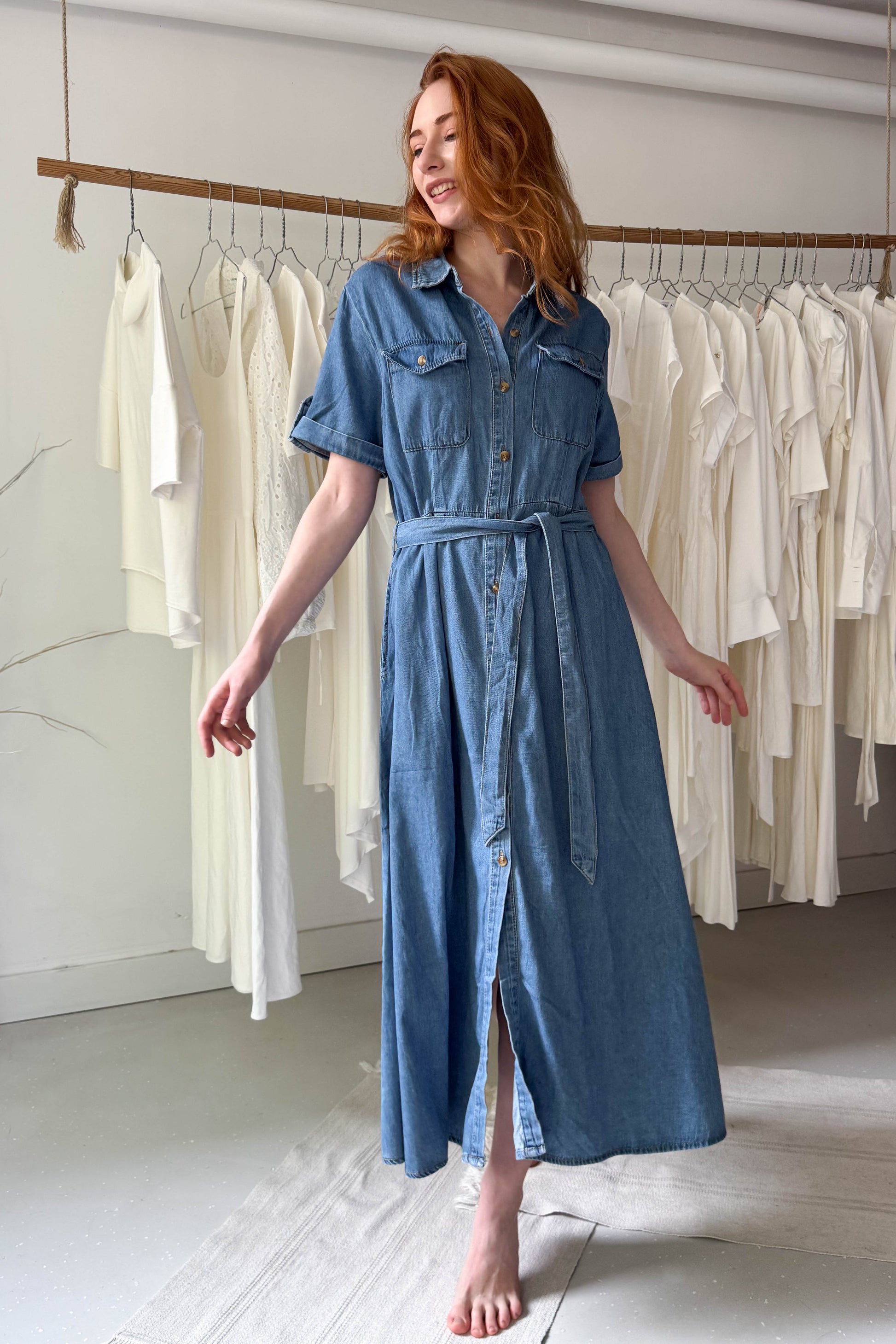 Galléros, rövidujjú, zsebes farmer ingruha. Derékrészen szűkített fazon. Megkötővel és mellrészen zsebekkel van ellátva. Elől középen apró gombokkal záródik.