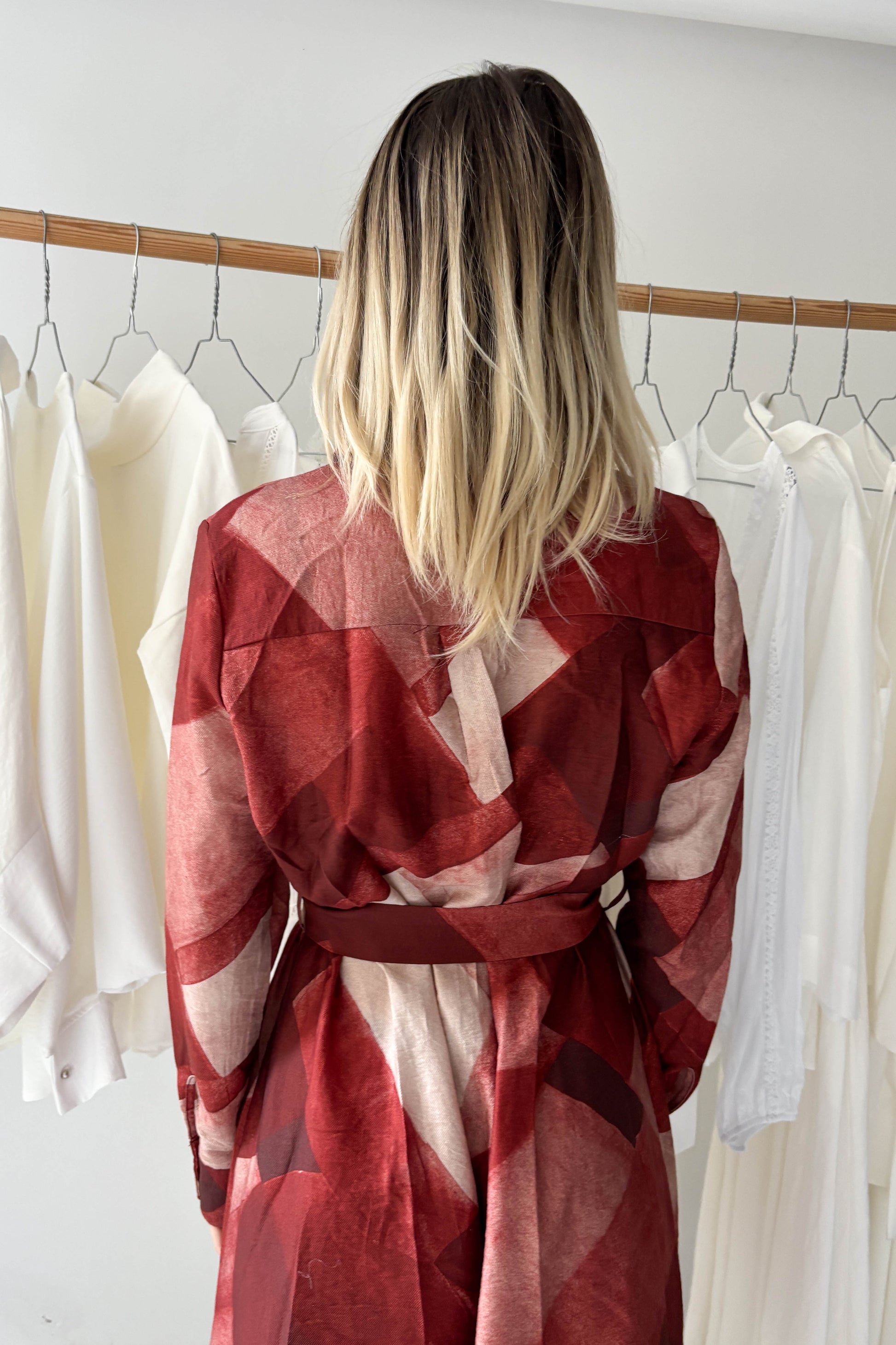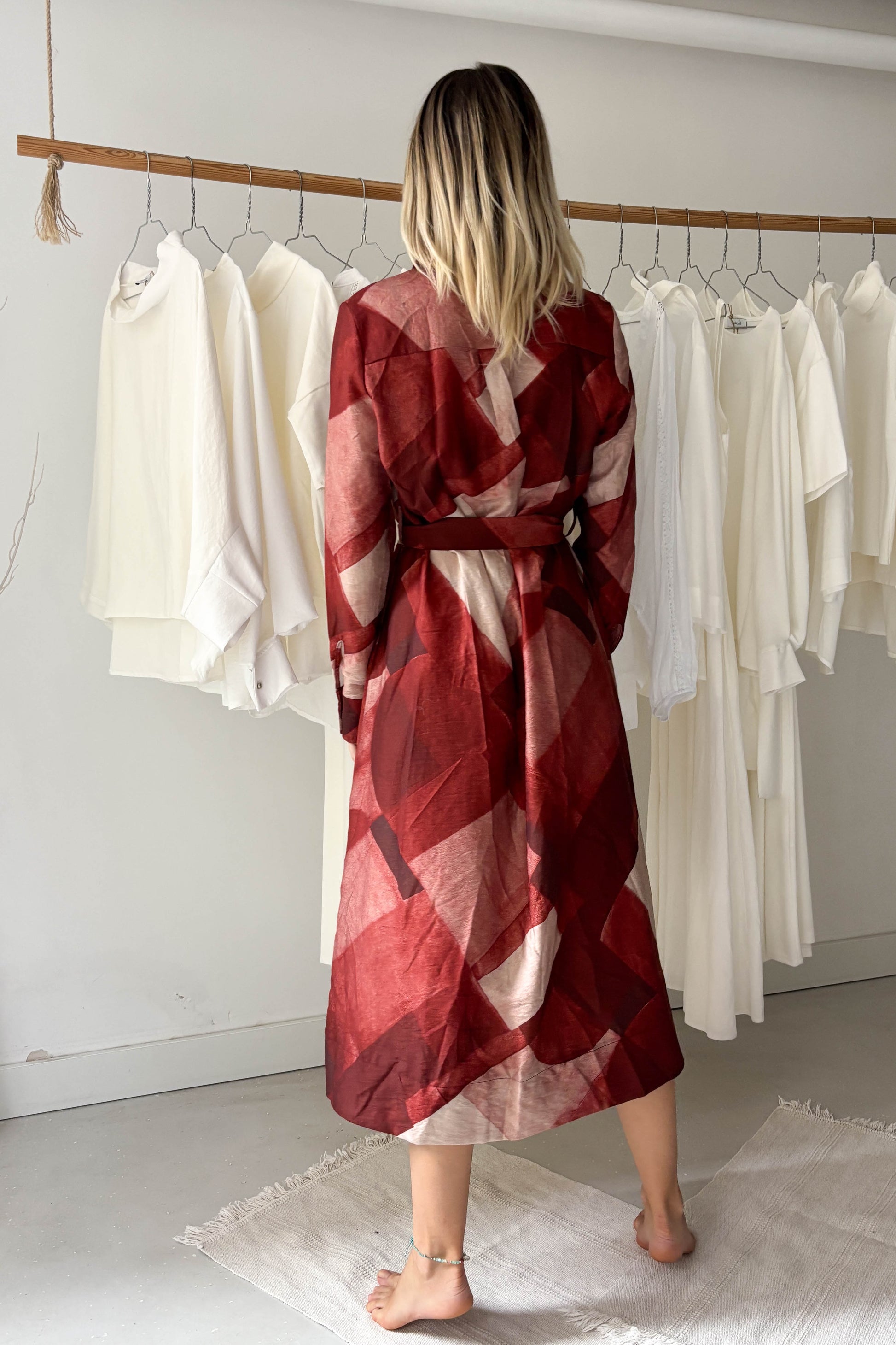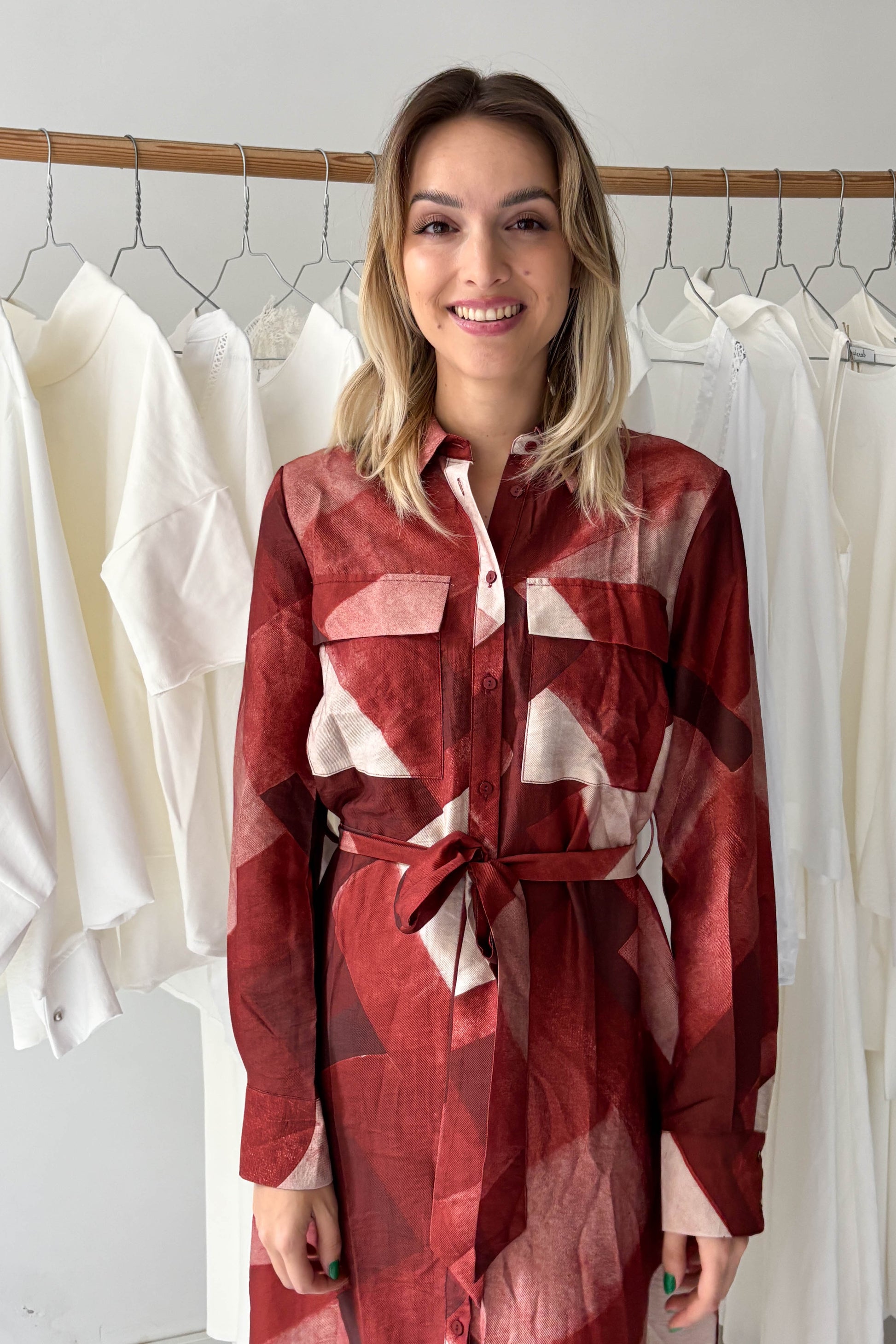 Galléros, hosszúujjú, midi ingruha. Mellrészen zsebekkel, derékrészen megkötővel van ellátva. Középen és az ujjak végén apró gombokkal záródik.