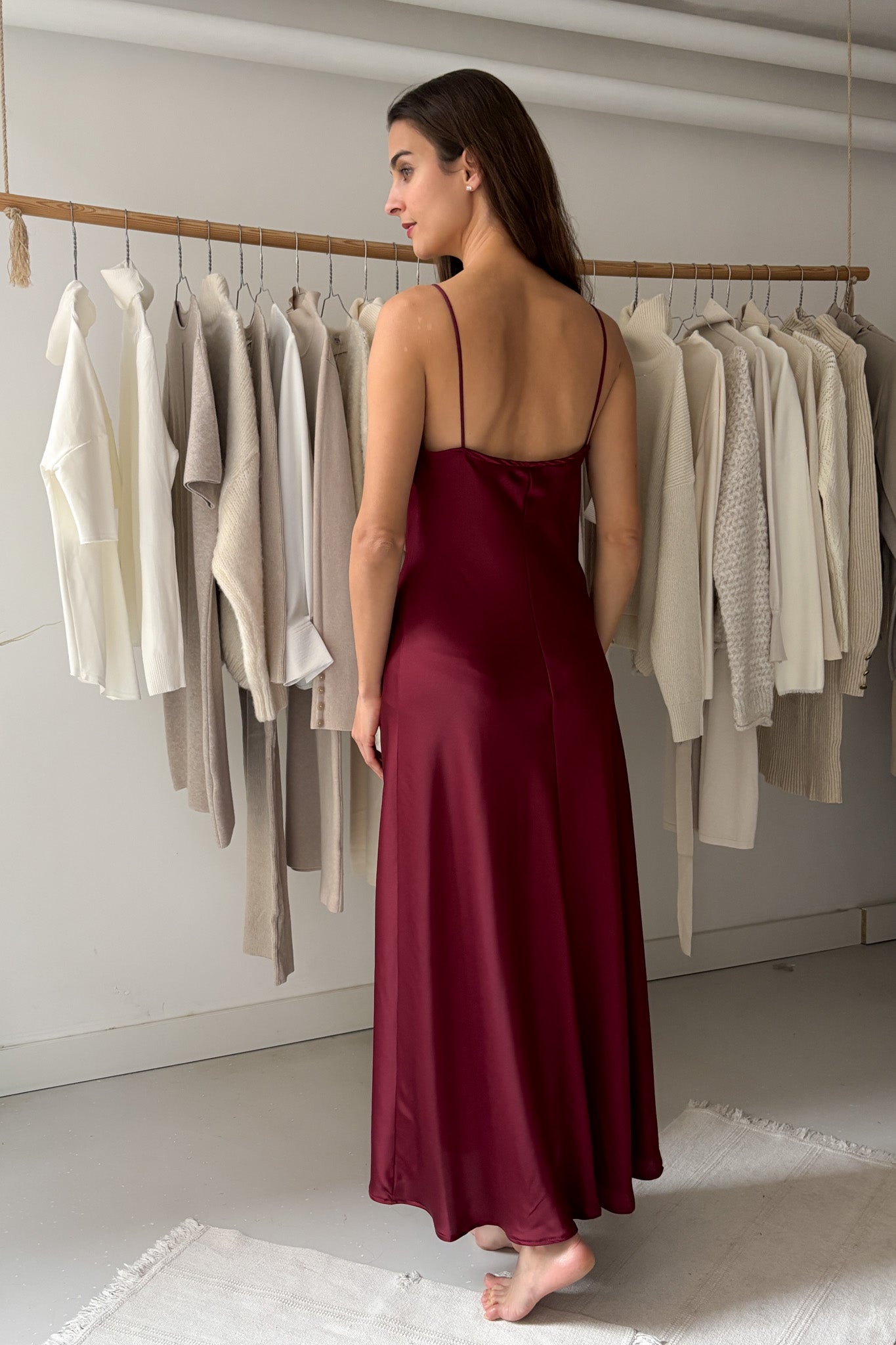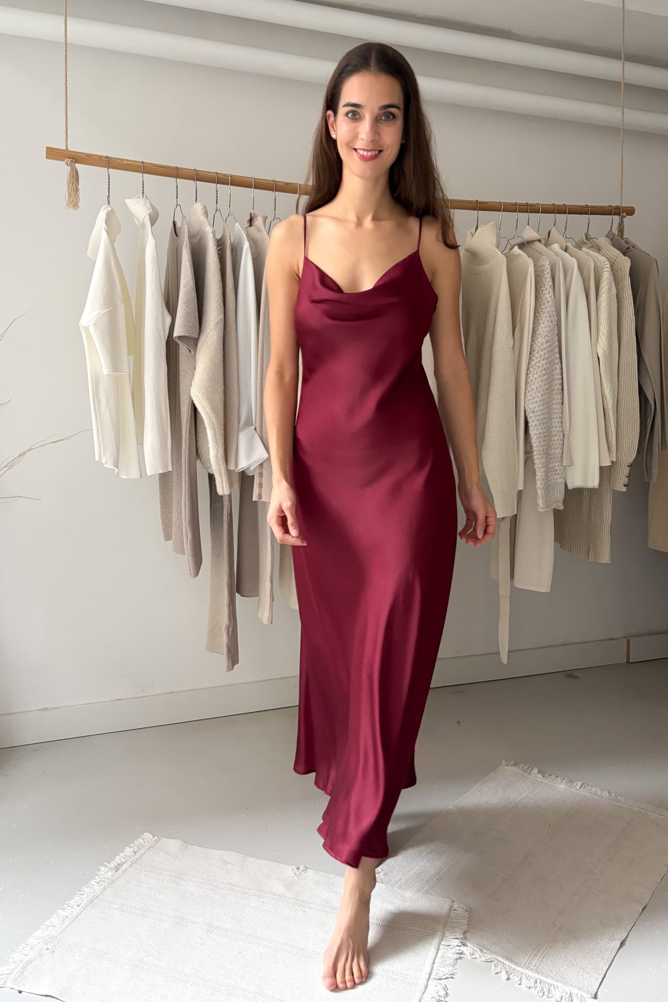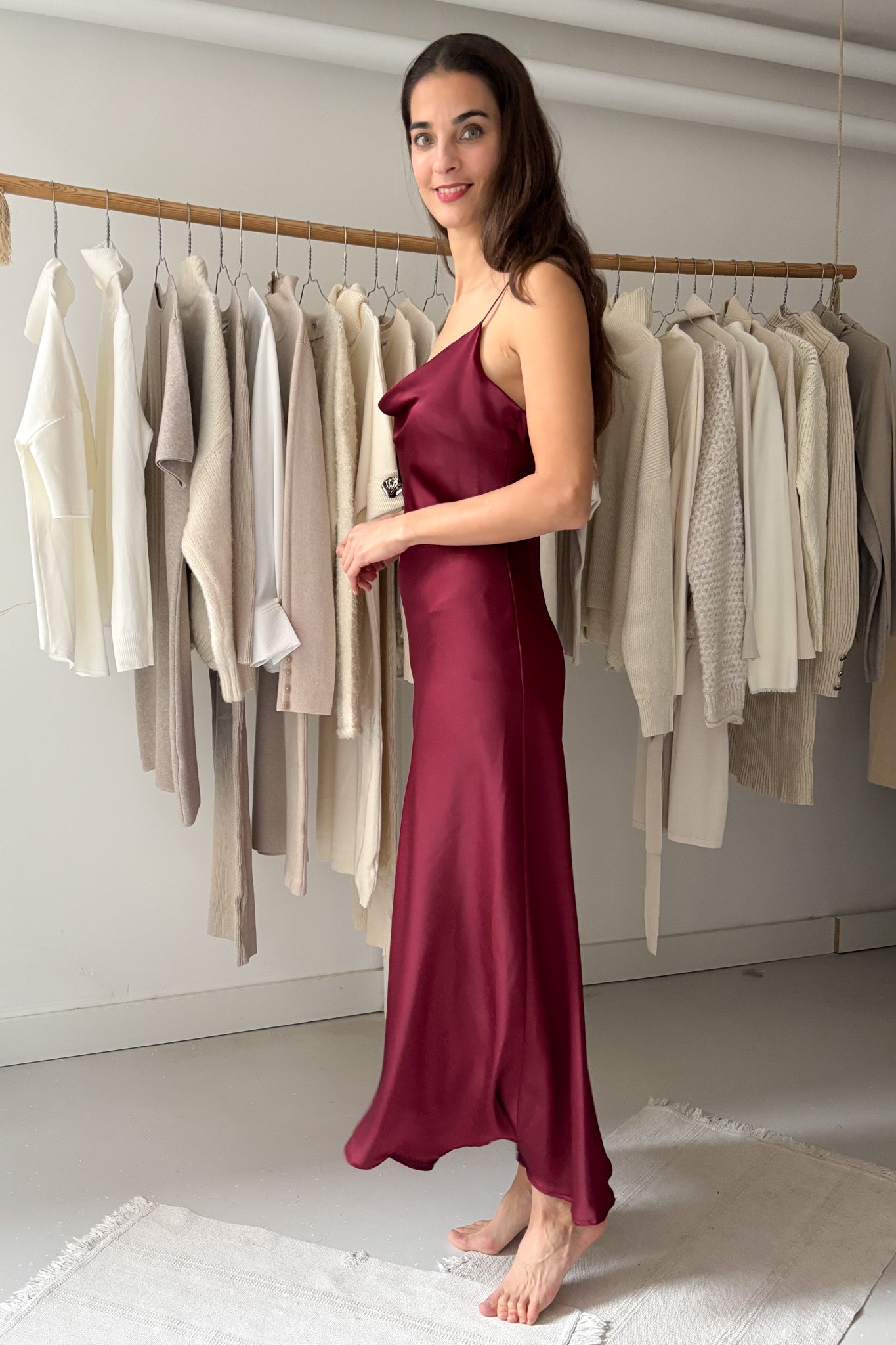 Hosszú, lágyesésű, burgundi ruha. Spagettipántos fazon.