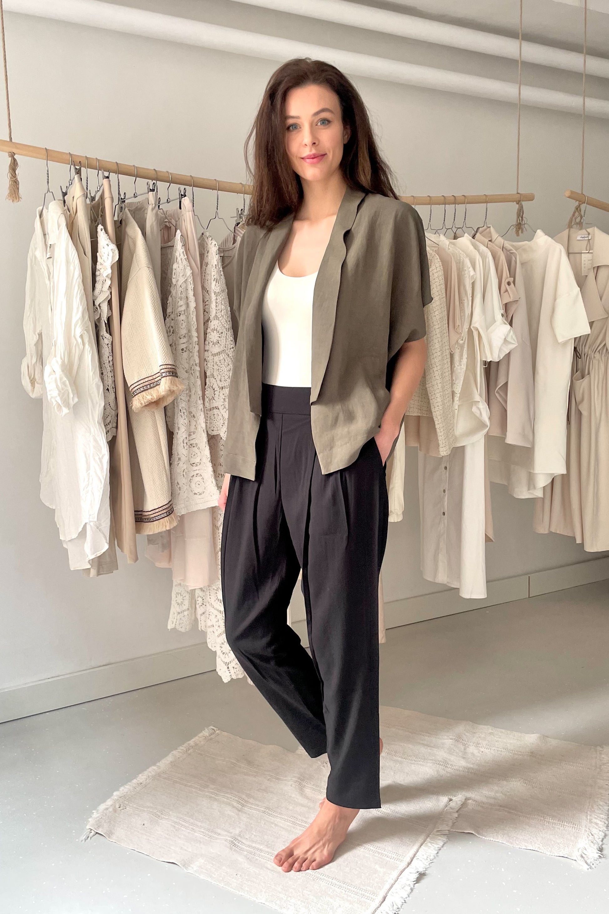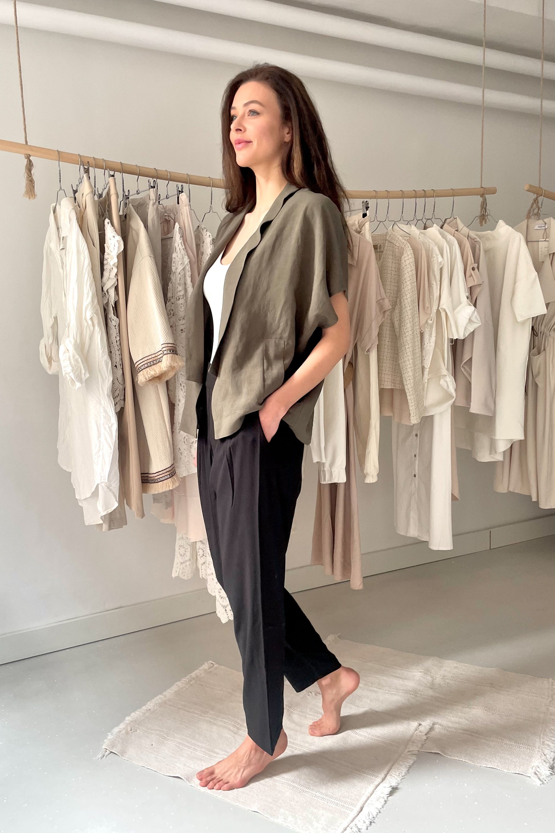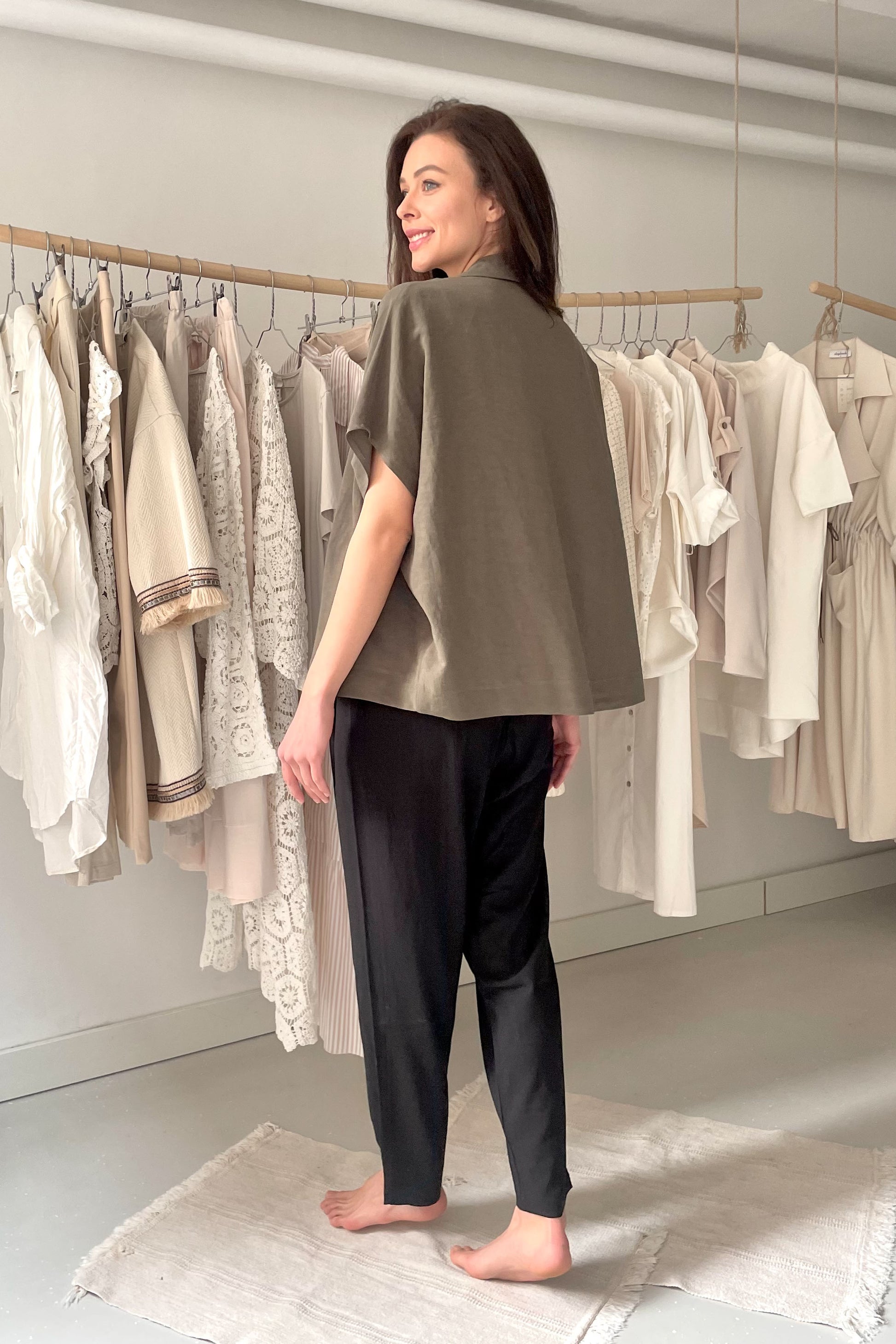 55% len 45% viszkóz, premium minőségű szövet, elasztánt nem tartalmaz. Egyméretes, a modell 177 cm magas